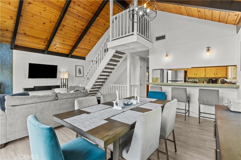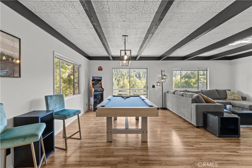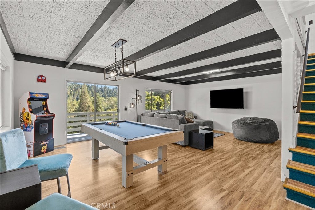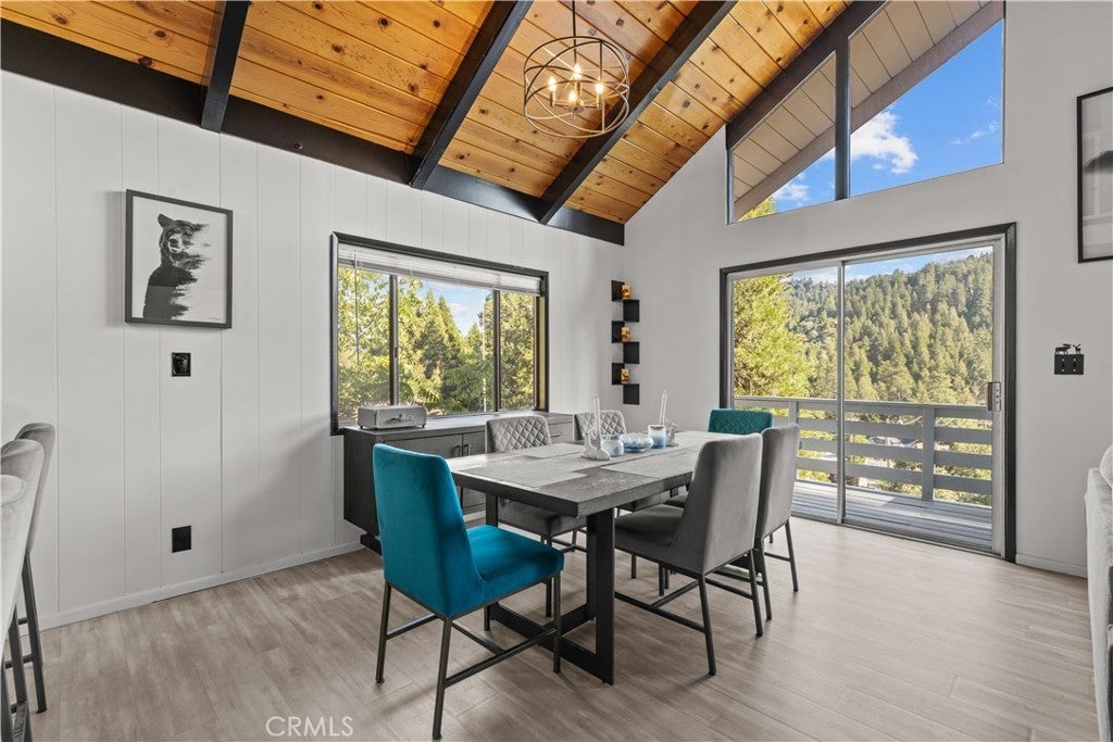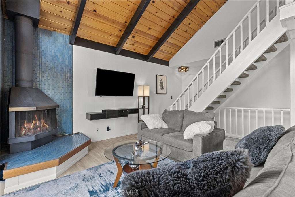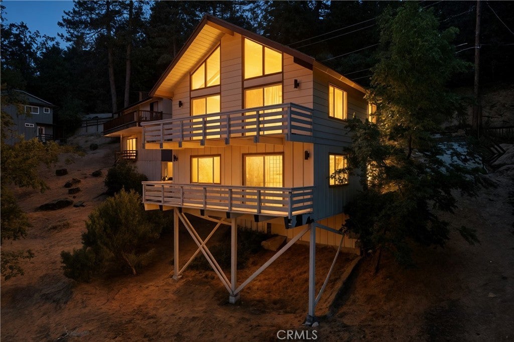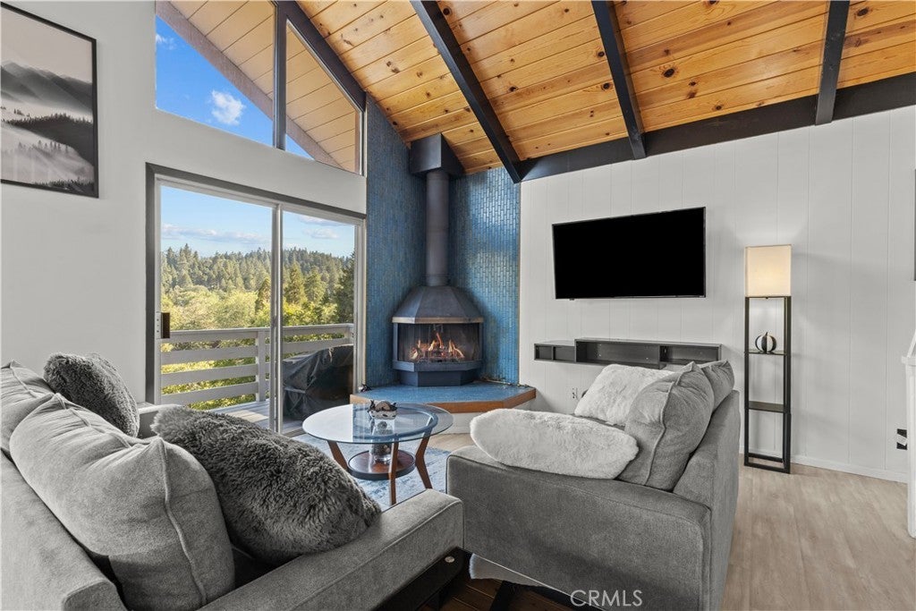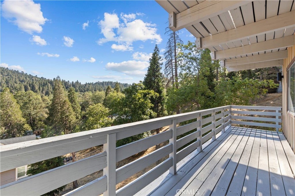 Escape to this inviting mountain cabin, perfectly tucked away in the trees. With a level entry and a desirable orientation with a downtown Crestline view that brings in natural light throughout the day, the open floor plan showcases exposed beam ceilings and expansive picture windows that frame peaceful pine views. The main level flows seamlessly with a spacious kitchen, dining area, and cozy living room anchored by a wood burning fireplace. Upstairs, a loft provides extra sleeping space with a closet, while the lower level features a private primary suite with a full size bath and a family room for relaxing or entertaining. Step outside to two decks that are perfect for morning coffee or evening sunsets. A hidden hatch leads to the laundry area beneath the home, keeping chores discreet and out of the way. Pride of ownership is evident throughout. With fruit trees on the property and just minutes from Lake Gregory, this home offers the perfect blend of comfort, privacy, and convenience, whether you are planning weekend getaways or full time mountain living. Set your move-in style: purchase the home furnished or bring your own.. furnishings are negotiable.