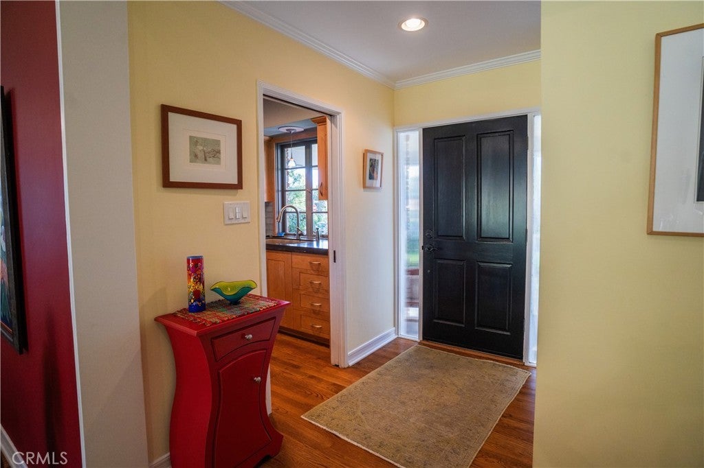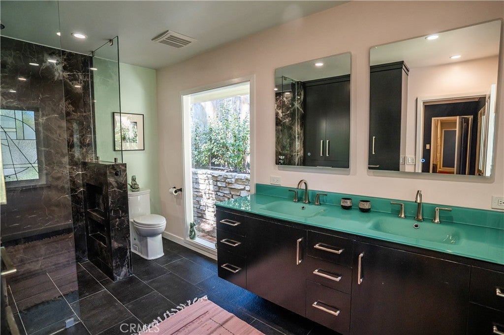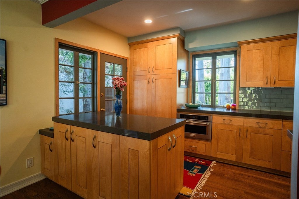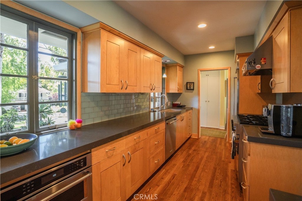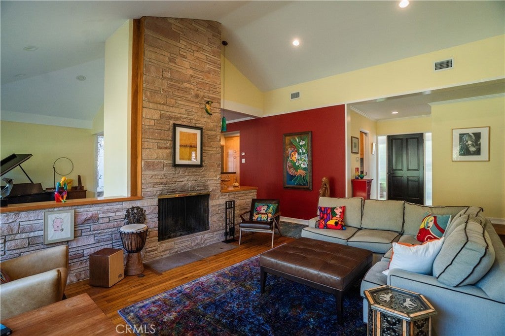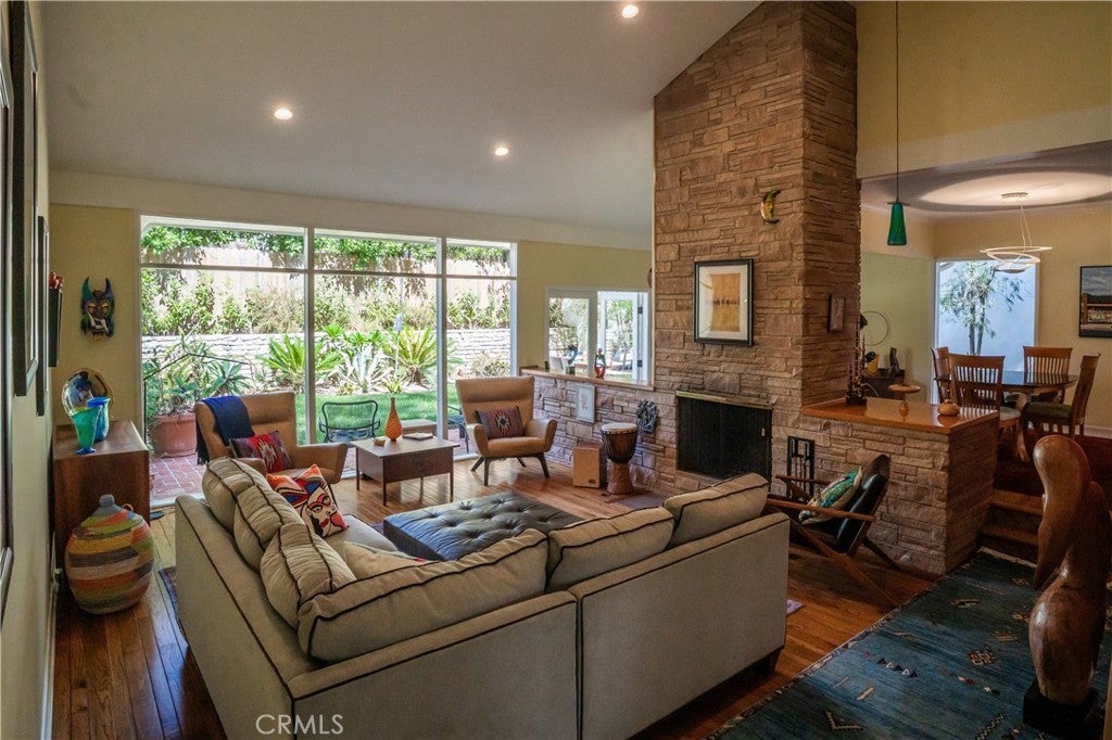 Idyllic Valmonte Grove Retreat. Tucked away on one of the most sought-after streets in the coveted Valmonte Grove neighborhood, this single-level sanctuary blends mid-century charm with modern comfort—all set directly along the serene boundary trail. Nestled behind a lush grove of eucalyptus trees on a generous 7,500 sq. ft. lot, this home feels worlds away while remaining close to everything. Step inside to a sun-drenched, sunken living room, where hardwood floors, soaring vaulted ceilings, and a wood burning stone fireplace create a warm, inviting centerpiece. Floor-to-ceiling windows frame views of the private, fully fenced backyard and garden, making the space perfect for both quiet mornings and lively entertaining. The open-concept dining room and spacious kitchen flow naturally off the living room, offering hillside and golf course views. The chef’s kitchen, fully remodeled in 2017, boasts a 6-burner Viking range, high-end appliances, custom maple cabinetry, and abundant storage. A step-down den (ideal for a music room, playroom, or cozy lounge) opens through four large French doors into the tranquil backyard. The home’s three bedrooms extend along the west hall, culminating in a peaceful primary suite complete with a Dutch door opening onto the garden. The modernist bathroom, beautifully renovated in 2019, features a marble walk-in shower, glass countertop vanity, stained glass window, and an abundance of natural light. Additional features include: Attached 2-car garage with laundry Extended driveway for up to 3 additional cars New roof, on-demand hot water heater, whole-house water filter, and built-in dehumidifier Enjoy hillside and golf course views from the elevated front porch, or relax in the private backyard oasis—perfect for families, pets, and summer gatherings. This is more than a home; it’s a lifestyle. Valmonte Grove offers peaceful, tree-lined seclusion while being just minutes from Riviera Village and a quick 4-minute bike ride to the beach.
