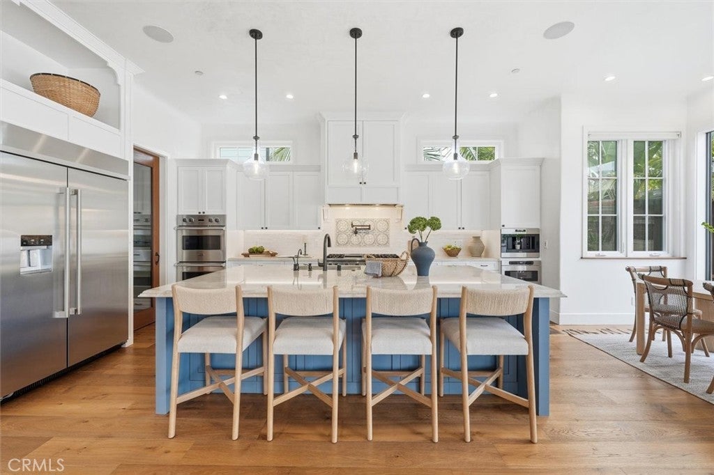 Rare East Manhattan Beach masterpiece where timeless elegance meets modern luxury. Built in 2021 by esteemed custom builder Patrick Kealy, on a coveted corner lot with a landscaped yard and white picket fence set the stage for timeless curb appeal. With 6 bedrooms, 6.5 bathrooms, a finished basement and approximately 5,738 SQFT (BTV) of living space on a 7,449 SQFT lot (BTV), this home offers scale without sacrificing warmth. Soaring ceilings and an open-concept floor plan flood the home with natural light and are enhanced by dramatic bi-folding doors that open seamlessly to a private backyard oasis—featuring a pool, spa, built-in Wolf BBQ and a custom Korean BBQ—creating the ultimate indoor-outdoor California lifestyle. The heart of the home is a chef’s kitchen featuring top-of-the-line amenities with exquisite finishes, a walk-in pantry, stainless steel Viking appliances including double ovens, a bonus warming drawer, and a Wolf built-in espresso maker. The lower level offers a full basement with a full bar equipped with ice maker, refrigerator, and dishwasher perfect for a media room, playroom or a gym, complete with a guest suite. The upper level finds the majority of the bedroom suites, each with its own en-suite bathroom vaulted ceilings, and custom closets. The primary suite is like a retreat with a romantic fireplace and spa like primary bath. Located in one of Manhattan Beach’s most desirable neighborhoods, East Manhattan Beach offers larger lots, larger homes, and close proximity to award-winning schools and parks. This residence is the Complete Family Retreat – a home that gives kids space to play, parents space to entertain, and everyone space to unwind. Only 15 minutes to LAX