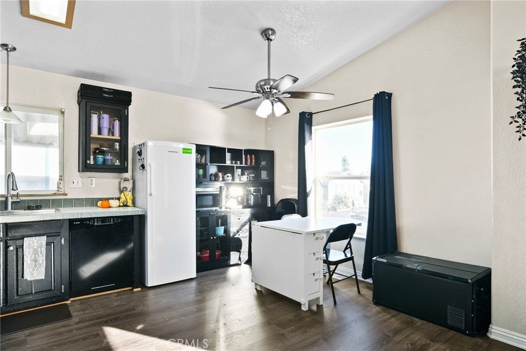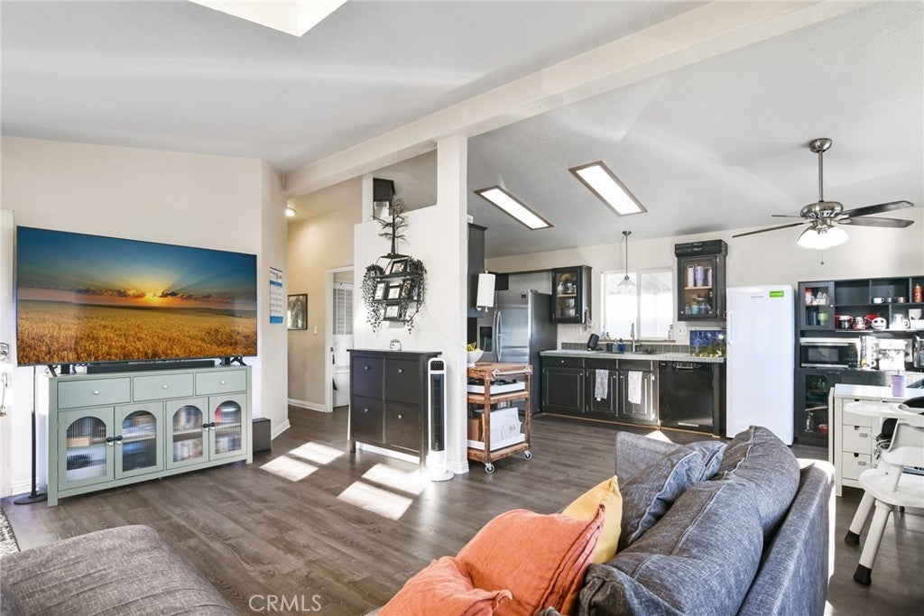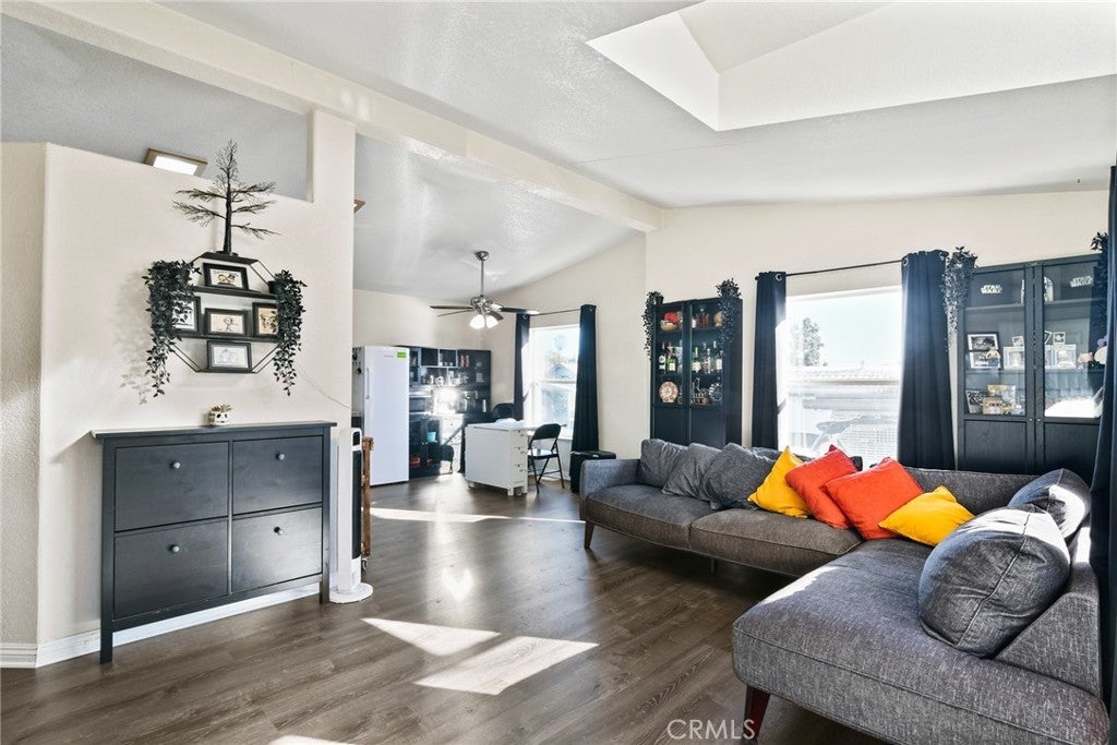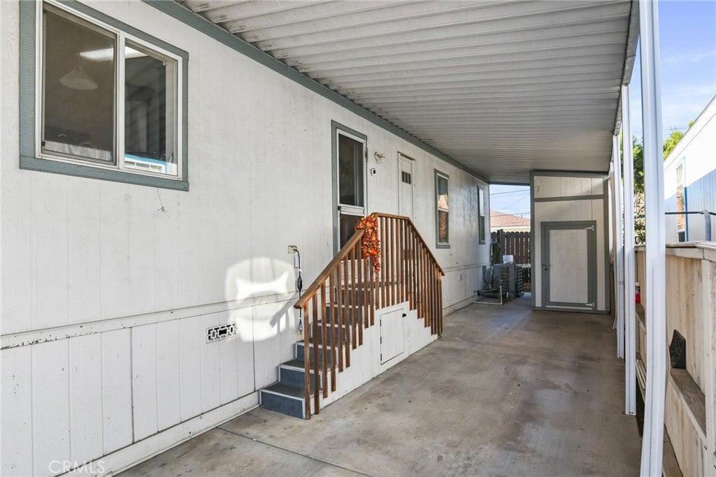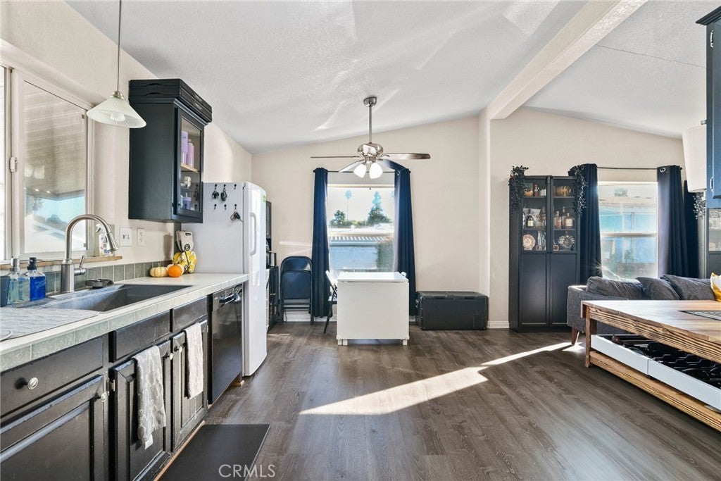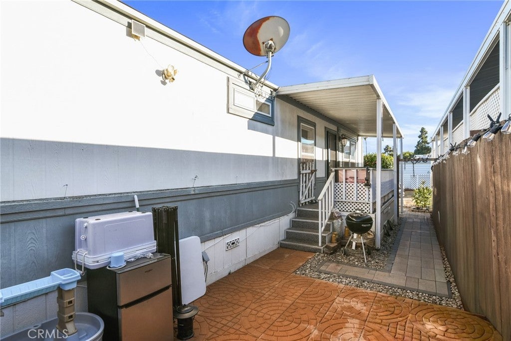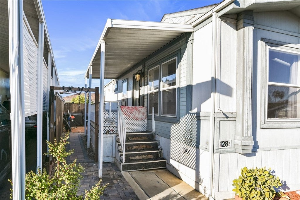 This move-in ready, turnkey 3-bedroom, 2-bath manufactured home in El Rancho Verde Mobile Home Park offers just under 1,200 sq. ft. of comfortable living space. The open floor plan welcomes you with cathedral vaulted ceilings, newer vinyl flooring throughout, fresh interior paint, and accent attached furniture — great for storage, a coffee area, or bar setup. The spacious primary bedroom features its own en-suite bath, while the additional bedrooms are generously sized — perfect for family, guests, or a home office. Enjoy relaxing on the lovely front porch or in the private, low maintenance hardscaped yard — ideal for outdoor gatherings or quiet evenings. Additional highlights include a 2-car covered carport, storage shed, central air and heat, laundry area in kitchen and a beautifully manicured front area. Located in El Rancho Verde, a vibrant all-ages, rent-controlled community offering resort-style amenities such as a pool, clubhouse, billiards room, BBQ area, and more! Conveniently located near parks, schools, shopping, restaurants, and freeway access — this home is ready for its new owners to move in and start making memories!