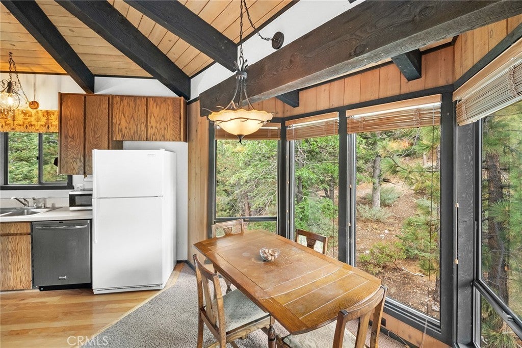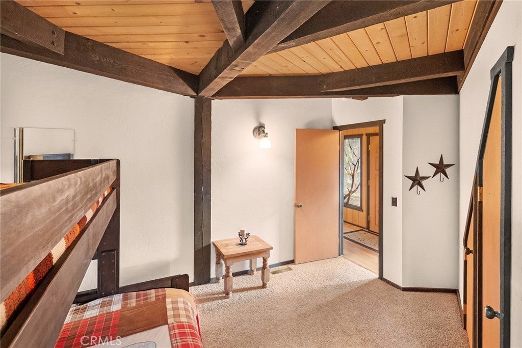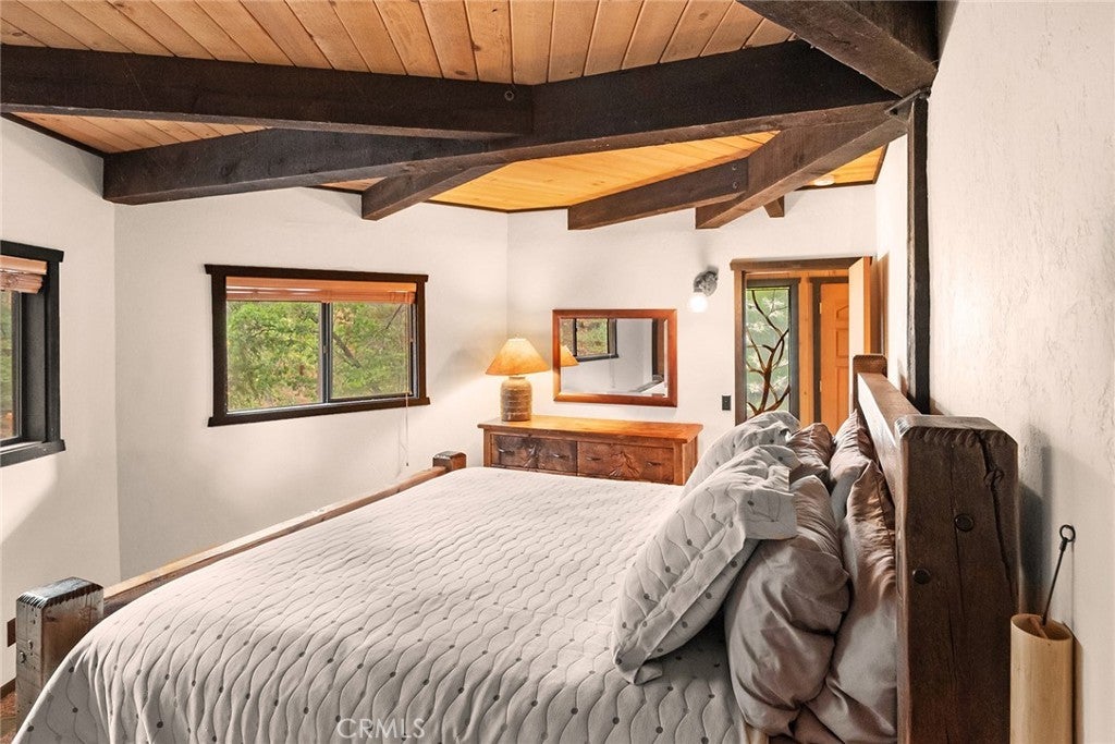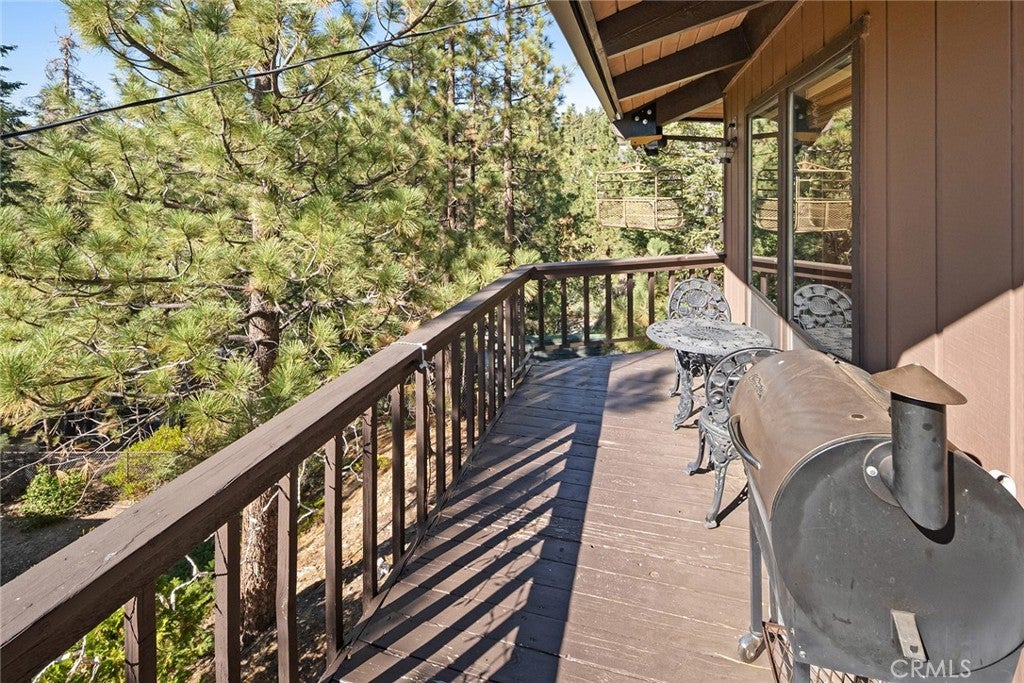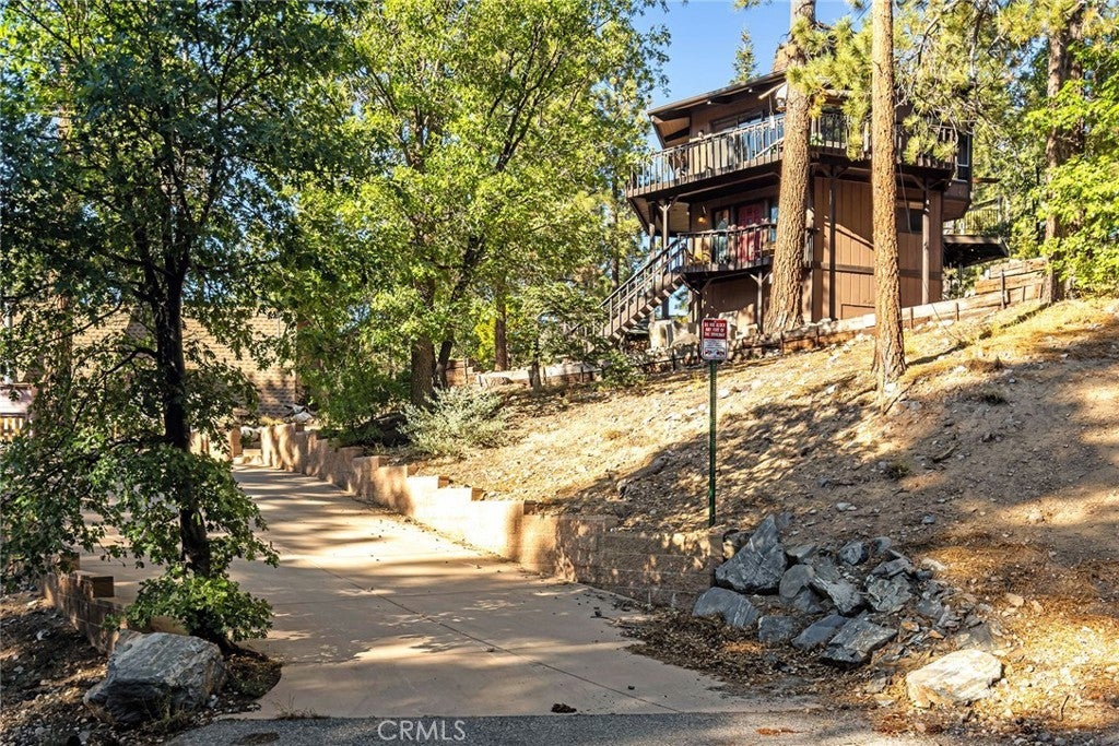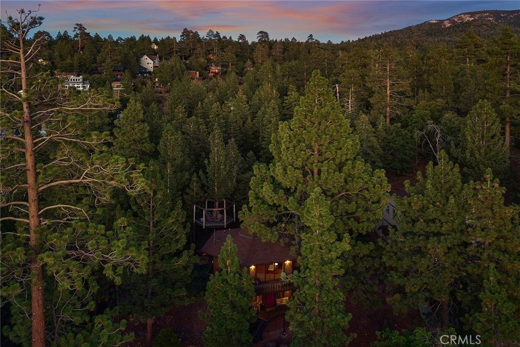 Moonridge Retreat with Stone Fireplace, Bay Windows & Treehouse Deck Nestled among the pines on a quiet Moonridge cul-de-sac, this inviting 2-bedroom, 2-bath mountain retreat blends warmth, charm, and architectural character. Open-beam ceilings and expansive windows fill the home with natural light and serene forest views. The living room centers around a beautiful stone fireplace and panoramic treetop vistas, creating the feeling of living in a treehouse. Bay windows facing the National Forest frame the surrounding landscape, while the kitchen and dining areas flow seamlessly for meals or gatherings. The spacious primary bedroom comfortably accommodates a king bed and includes a walk-in closet, complemented by a playful bunk room for family or guests. The second-floor bathroom features side-by-side washer and dryer for added convenience. Step outside to multiple decks for relaxation and entertaining, including an elevated treehouse deck—perfect for sunset views, stargazing, or quiet moments under the stars. The wooded lot enhances the authentic mountain atmosphere with space to explore and a nostalgic tire swing. Located just minutes from Big Bear Lake, ski resorts, scenic trails, and the Village, this home is perfect as a year-round getaway. Its desirable Moonridge location and inviting design also make it a potential candidate for short-term or seasonal rental use, subject to buyer verification of all applicable permits and regulations with local authorities.