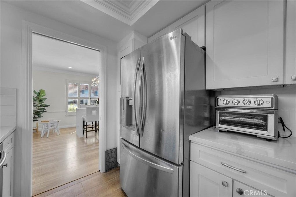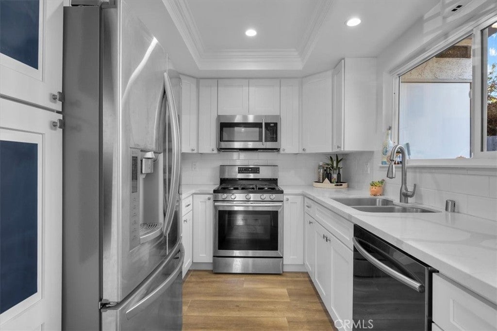 Located in the coveted Ridgegate gated community in the heart of Rancho Palos Verdes, this beautifully remodeled three-bedroom, three-bathroom townhome blends contemporary comfort with timeless style. Positioned at one of the highest points in the complex and as an end unit, the home enjoys exceptional natural light and a quiet, private setting. The inviting living room opens seamlessly to the dining area, accented by a built-in wet bar that makes entertaining easy. The remodeled kitchen features stainless steel appliances, sleek cabinetry, and a sliding glass door leading to a private patio, perfect for relaxing or dining outdoors. Upstairs, the spacious primary suite offers dual closets and a tastefully updated en-suite bathroom. Two additional bedrooms and a full hallway bath complete the upper level. Thoughtful upgrades throughout the home include a remodeled kitchen and bathrooms, engineered wood flooring, newer HVAC system and water heater, and updated appliances, all enhancing both comfort and style. Additional features include direct garage access and a private backyard patio. The gated community provides resort-like amenities including swimming pools, tennis and paddle tennis courts, sports courts, and beautifully maintained landscaped grounds overseen by on-site management and maintenance staff. Ideally located within the award-winning Palos Verdes school district and just moments from shopping, dining, and scenic parks, this home offers a rare combination of modern living, privacy, and convenience in one of Rancho Palos Verdes’ most desirable communities.