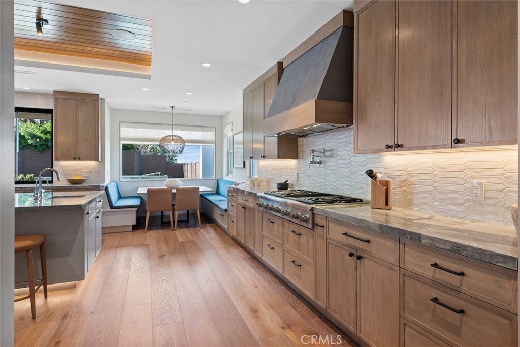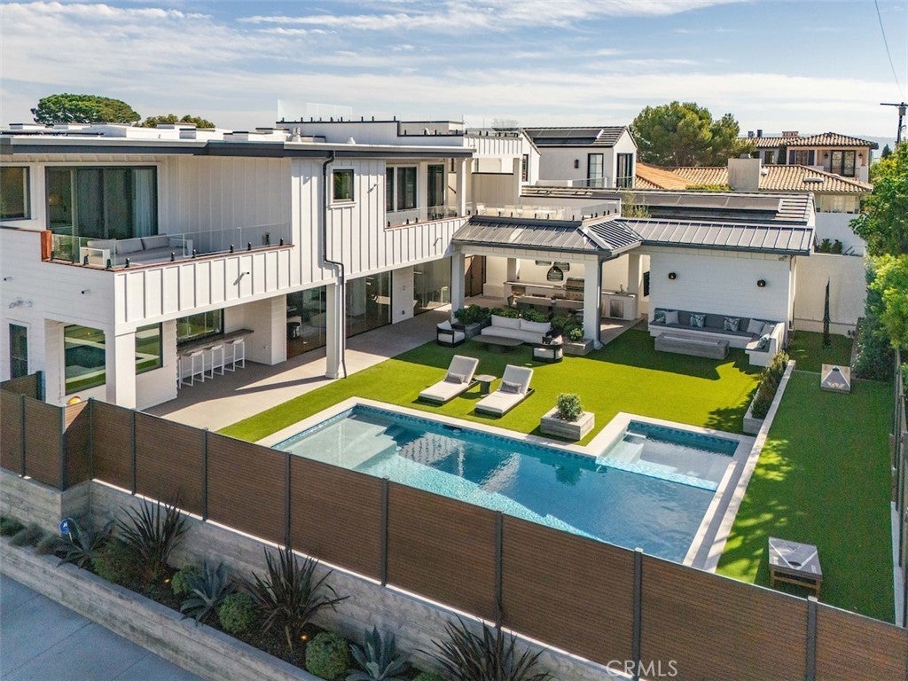Welcome to this extraordinary custom estate perched in the Hermosa Hills and set on a large, flat corner lot - an exceptional rarity in Hermosa Beach, where modern design and coastal luxury meet. With 7 bedrooms, 7.5 baths, and over 7,800 square feet of impeccable living space, this home offers the best of coastal living: elevated design, breathtaking views and effortless sophistication. The architectural craftsmanship is unmistakable—an oversized pivot wood front door, wraparound front deck and an open-concept layout that seamlessly blends indoor and outdoor living. A dramatic glass-encased elevator serves as a sculptural centerpiece, connecting each level with ease. The main living area features a stone fireplace, wood-detailed ceilings and folding glass walls that open to an entertainer’s dream: a covered outdoor pavilion with kitchen pass-through, bar seating, pool and spa, fire pit and built-in lounge seating—all enhanced by custom lighting for an inviting nighttime ambiance. The gourmet kitchen is both functional and beautiful, showcasing a waterfall island of natural stone, designer backsplash, custom cabinetry and a cozy built-in breakfast nook. A formal dining area and multiple living spaces offer room for gatherings large and small. Upstairs, the primary suite is a serene retreat with a private terrace, marble-clad bath, soaking tub, and adjacent office with its own ocean-view patio. The lower level is pure leisure—complete with a full bar, movie theater, game room, and home gym. Every detail has been curated for luxury living: custom railings, designer fixtures, home automation, sound and theater systems throughout, security cameras, a full water filtration system and a four-car garage with built-in storage.
