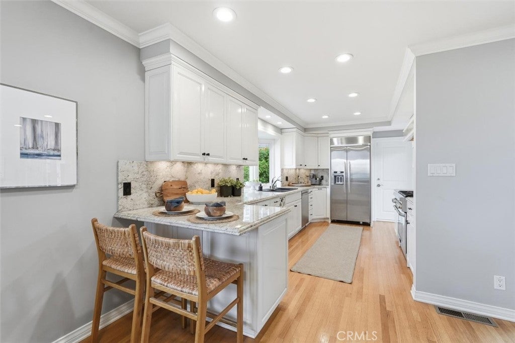 This beautifully updated Palos Verdes Estates home combines comfortable living with refined details and ocean views. Behind a gated entry, a private front courtyard offers a welcoming outdoor space with room for a dining table and grill setup—ideal for casual gatherings or quiet evenings at home. Inside, the open layout begins with a bright dining area that flows seamlessly into the remodeled kitchen. The kitchen features granite countertops, custom cabinetry, premium stainless-steel appliances including a 6-burner Thermador range and garden window. A small peninsula provides additional bar seating for casual dining. The adjoining living room serves as the heart of the home, featuring hardwood floors, fireplace and a dramatic retractable La Cantina glass door that opens to a deck finished with concrete and tile details. From here, you can enjoy partial ocean views and the refreshing coastal breezes that define Palos Verdes living. The main level also includes a tranquil primary suite with oversized windows, custom shutters and a private bath, along with a spacious second bedroom and a hallway bath offering dual sinks, a roomy glass shower and custom tilework. Downstairs, you’ll find a third bedroom, another full bathroom, laundry room and a versatile fourth bedroom with its own fireplace, sink, built-in cabinetry and sliding doors leading to the rear patio and grassy yard. This flexible space works perfectly as a second primary suite, media room or cozy family room. Additional highlights include a 3-zone A/C system with two condensers, updated windows and doors, and an EV charger in the attached two-car garage. Just minutes from Malaga Cove Plaza, scenic trails, award-winning schools, and pristine local beaches, this home offers a thoughtful blend of function, flexibility and the easy elegance that makes Palos Verdes Estates so desirable.