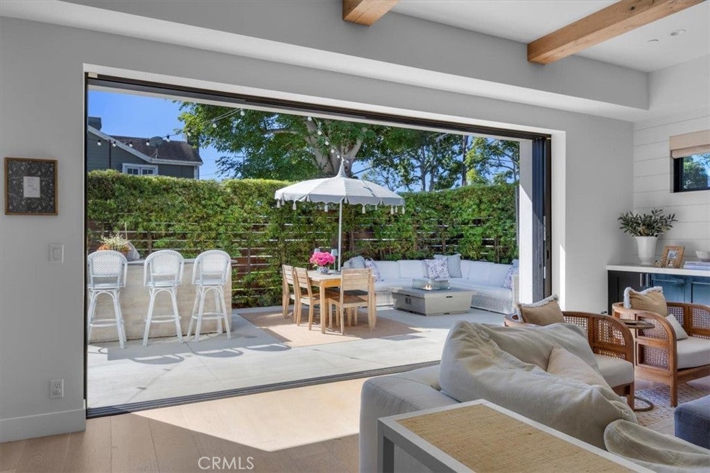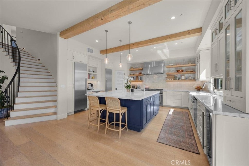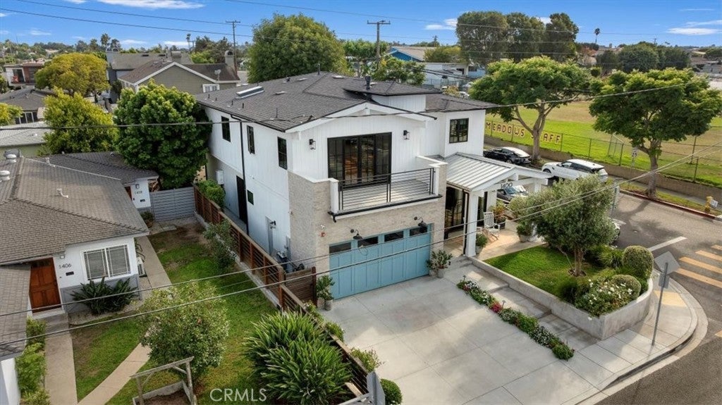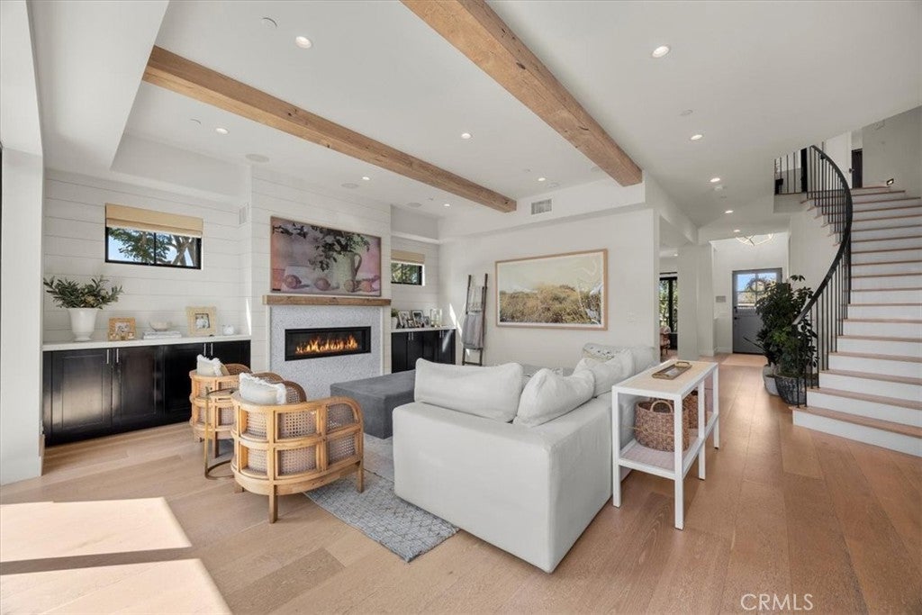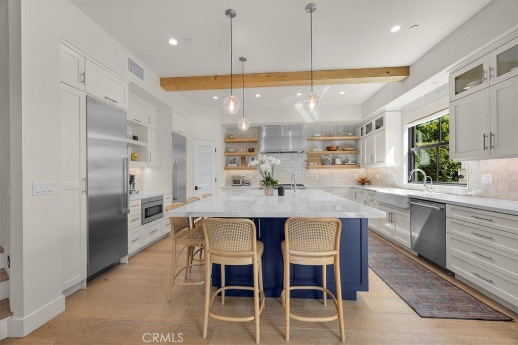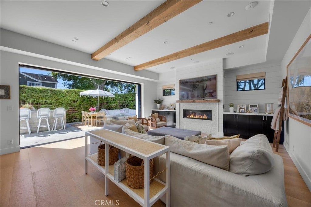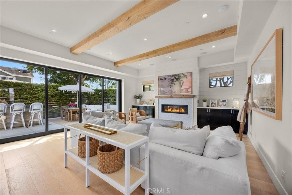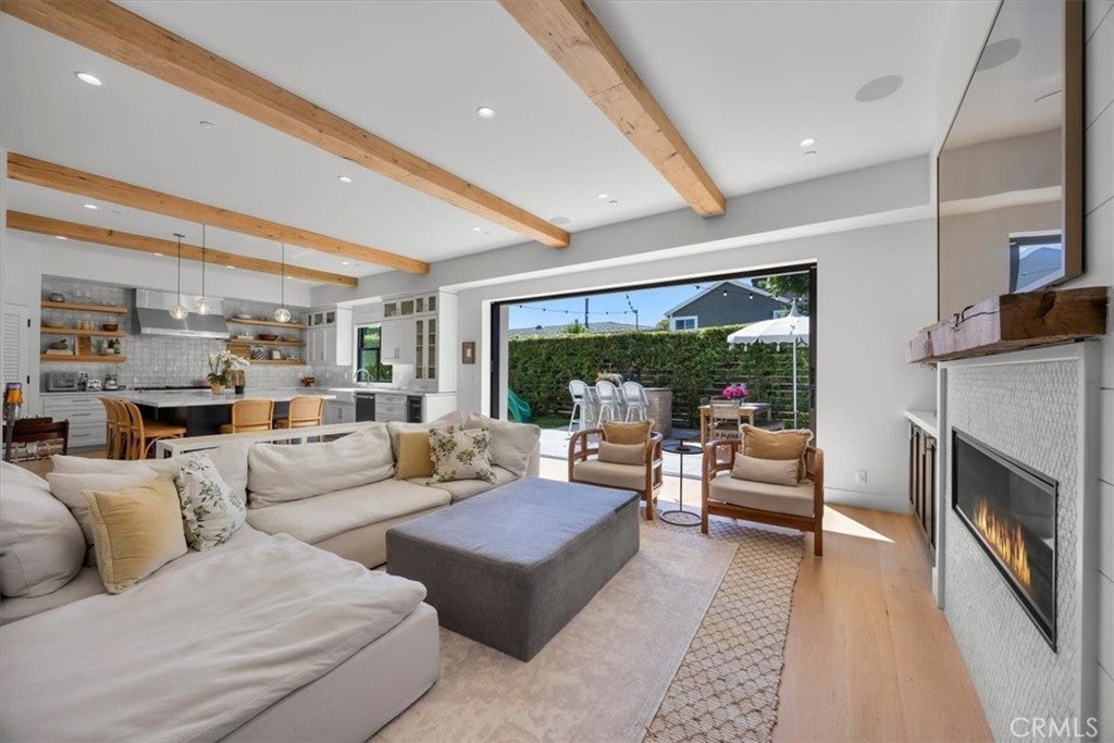 This exceptional five-bedroom, five-bath residence offers a seamless blend of indoor comfort and outdoor sophistication. Designed with timeless craftsmanship and thoughtful detail, the open layout flows effortlessly from welcoming living spaces to a serene backyard retreat. Created in collaboration with a decorator who previously worked closely with Nancy Meyers, the home captures that signature sense of warmth and layered refinement—spaces that feel both timeless and effortlessly livable. The family room features reclaimed wood beam ceilings, custom built-ins, and a striking fireplace, opening through concealed stackable sliders to an inviting outdoor lounge with a built-in BBQ, bar counter, and firepit-ready seating area. The professionally landscaped yard includes eco-conscious turf and a spacious play area—ideal for entertaining or relaxing in style. The chef’s kitchen is both functional and refined, anchored by a generous island with handcrafted cabinetry, floating wood shelving, designer tilework, and stone countertops. A walk-in pantry, beverage bar, and top-tier appliances—including a built-in beverage refrigerator—create an effortless flow between everyday living and entertaining. A light-filled living room with shiplap accents and a cozy fireplace extends to the covered front porch, while a custom built-in mud area and finished two-car garage add convenience. The main-level guest suite offers private outdoor access, perfect for visitors or a dedicated home office. Upstairs, the primary suite is a tranquil retreat with vaulted reclaimed-wood ceilings, a brick fireplace, dual custom closets, and a spa-inspired bath featuring a freestanding tub and walk-in shower. Each additional bedroom includes its own en suite bath and abundant natural light. Refined finishes include wide-plank hardwood floors, curated lighting, 10-foot ceilings, tankless water heater, upstairs laundry, and sustainable landscaping. Ideally located near award-winning schools, Polliwog Park, Manhattan Village, and the beach, this home embodies elevated design and effortless comfort.