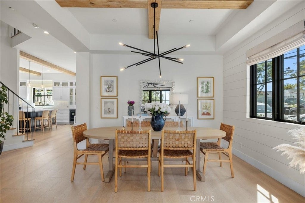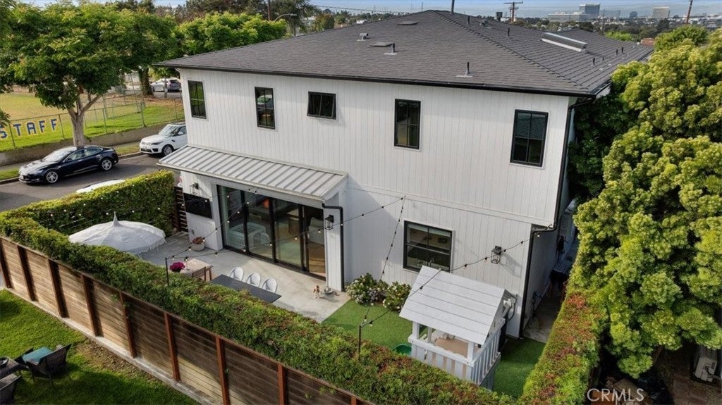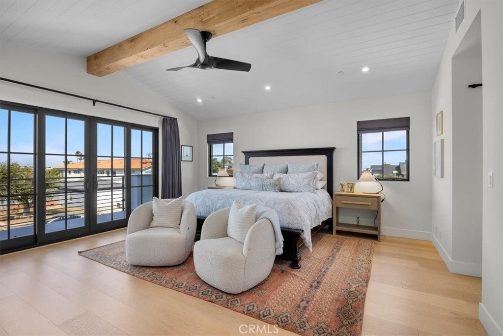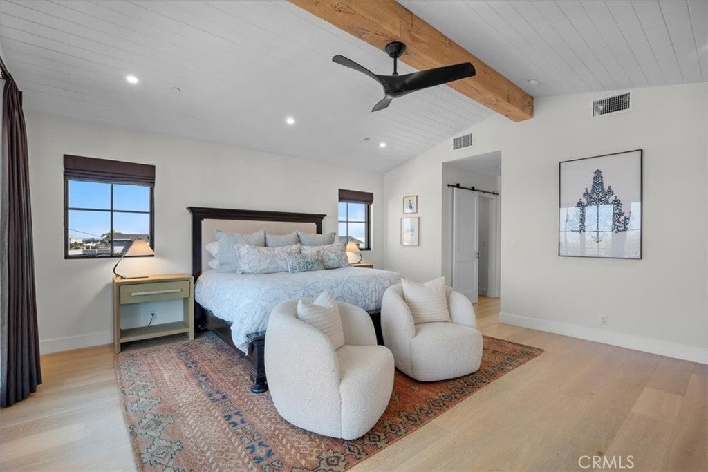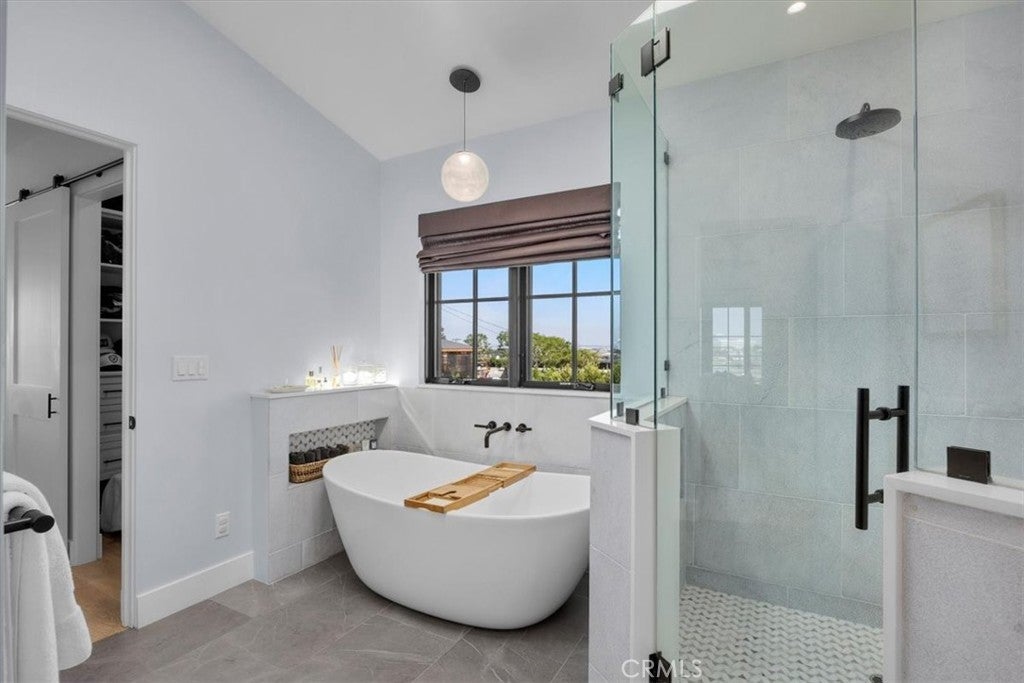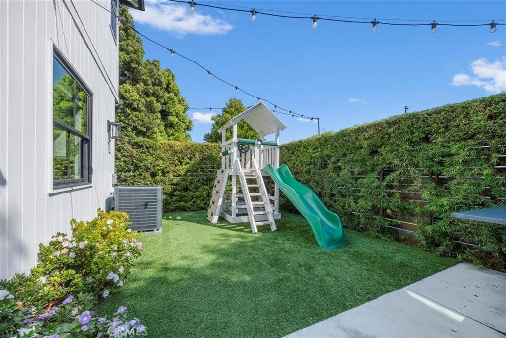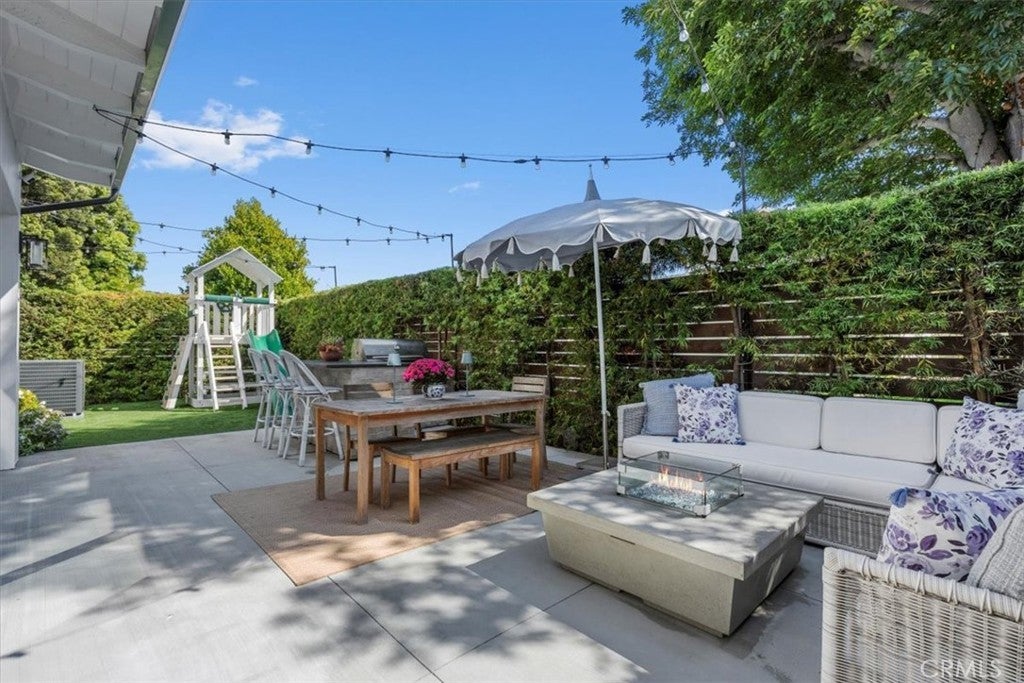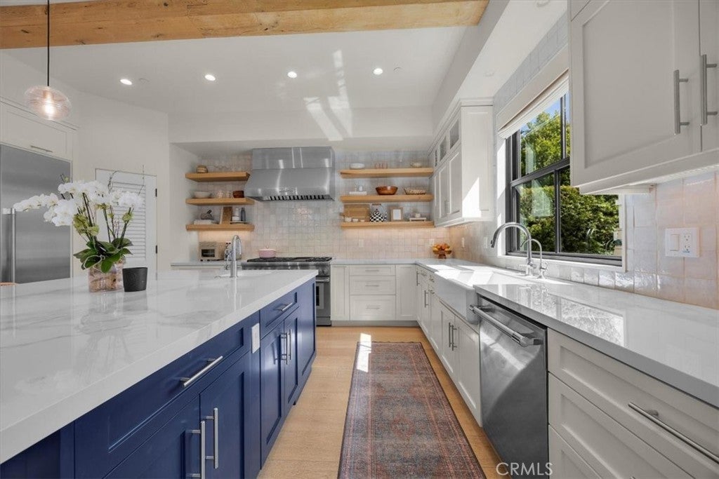 This exceptional five-bedroom, five-bath residence offers a seamless blend of indoor comfort and outdoor sophistication. Designed with timeless craftsmanship and thoughtful detail, the open layout flows effortlessly from welcoming living spaces to a serene backyard retreat. Created in collaboration with a decorator who previously worked closely with Nancy Meyers, the home captures that signature sense of warmth and layered refinement—spaces that feel both timeless and effortlessly livable. The family room features reclaimed wood beam ceilings, custom built-ins, and a striking fireplace, opening through concealed stackable sliders to an inviting outdoor lounge with a built-in BBQ, bar counter, and firepit-ready seating area. The professionally landscaped yard includes eco-conscious turf and a spacious play area—ideal for entertaining or relaxing in style. The chef’s kitchen is both functional and refined, anchored by a generous island with handcrafted cabinetry, floating wood shelving, designer tilework, and stone countertops. A walk-in pantry, beverage bar, and top-tier appliances—including a built-in beverage refrigerator—create an effortless flow between everyday living and entertaining. A light-filled living room with shiplap accents and a cozy fireplace extends to the covered front porch, while a custom built-in mud area and finished two-car garage add convenience. The main-level guest suite offers private outdoor access, perfect for visitors or a dedicated home office. Upstairs, the primary suite is a tranquil retreat with vaulted reclaimed-wood ceilings, a brick fireplace, dual custom closets, and a spa-inspired bath featuring a freestanding tub and walk-in shower. Each additional bedroom includes its own en suite bath and abundant natural light. Refined finishes include wide-plank hardwood floors, curated lighting, 10-foot ceilings, tankless water heater, upstairs laundry, and sustainable landscaping. Ideally located near award-winning schools, Polliwog Park, Manhattan Village, and the beach, this home embodies elevated design and effortless comfort.
