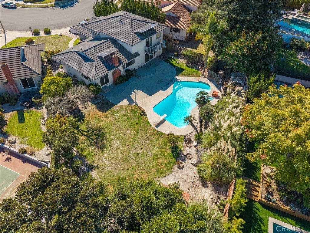 Amazing opportunity! Rare 5-bedroom pool home tucked at the end of a quiet cul-de-sac in the desirable Mesa Palos Verdes neighborhood of Rancho Palos Verdes. This spacious 2,468 sq. ft. residence sits on an expansive 11,360 sq. ft. lot offering privacy, a large flat backyard, and excellent outdoor living potential. Inside, the home features a bright kitchen with double-pane windows, generously sized living and dining areas with a brick fireplace, and updated flooring in the main living room. Sliding doors open to the backyard oasis with a sparkling pool, patio space, mature landscaping, and plenty of room to expand or design your ideal outdoor retreat. Home needs some cosmetic upgrades however in overall great condition. Additional highlights include solar panels, five true bedrooms, and an attached two-car garage, providing flexible space for work, guests, fitness, or hobbies. Has some ocean view off of the front of the house. Conveniently located near award-winning Palos Verdes schools, parks, shopping, trails, and the scenic coastline. A great opportunity to update, remodel, or reimagine a solid home in one of RPV’s most sought-after neighborhoods.
