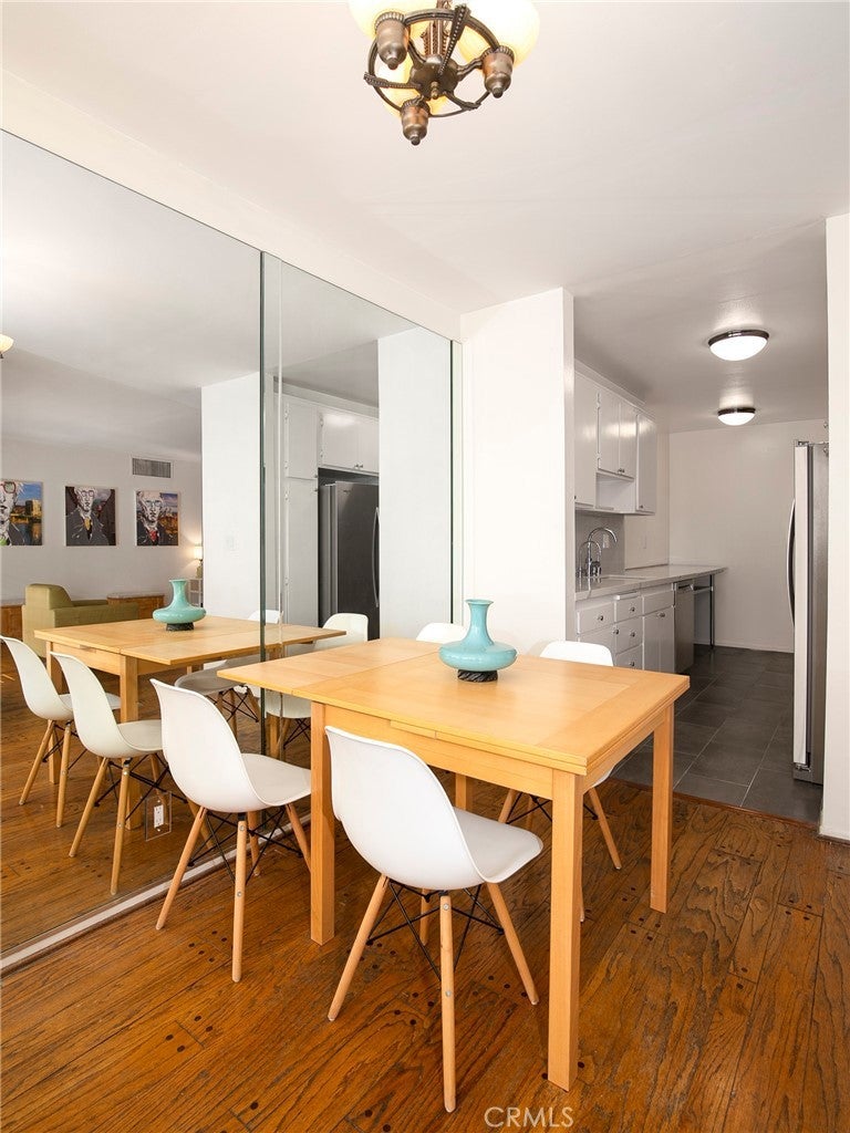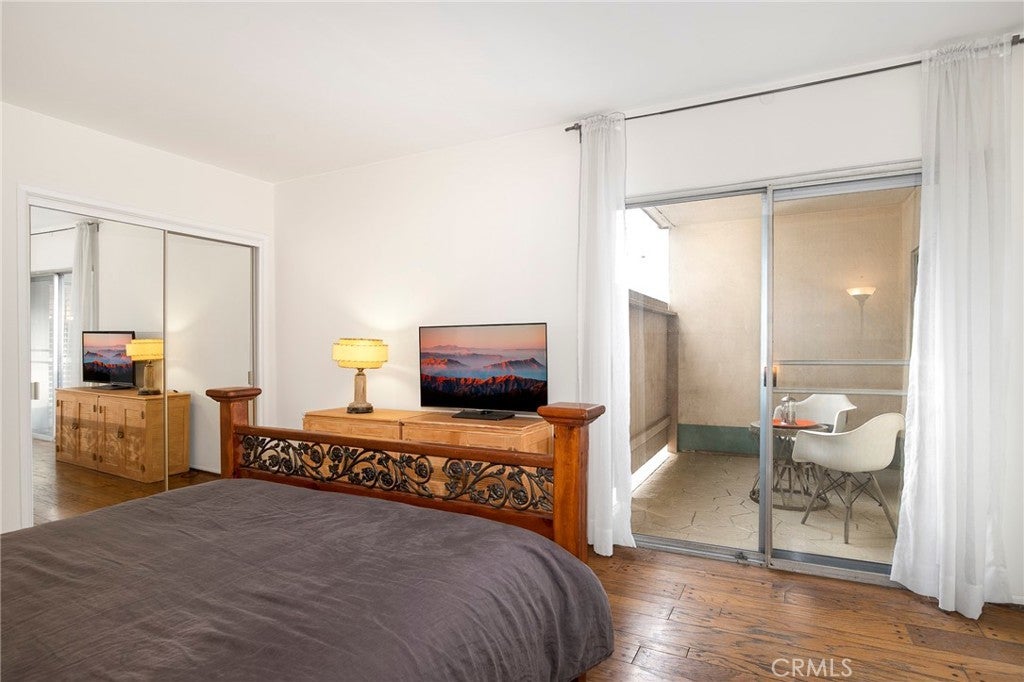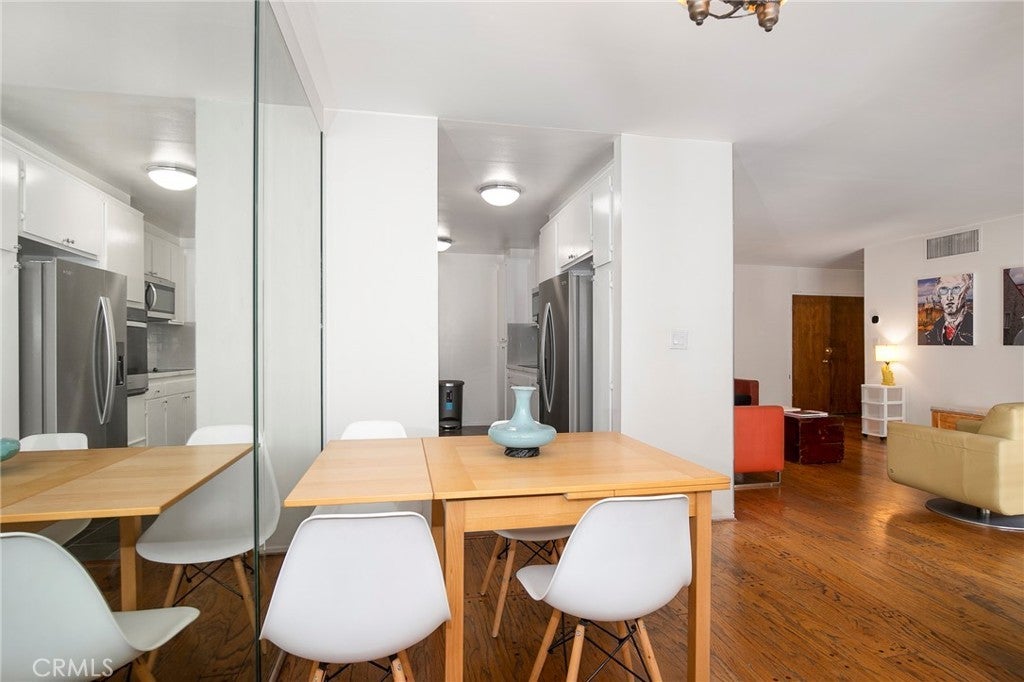 Proud to present this beautifully updated 1 bedroom, 1.5 bath West Hollywood condo offering 966 sq ft of comfortable living in one of the area’s most desirable tree-lined streets. Classic hardwood floors flow throughout, leading you into a bright and spacious living room with sliding glass doors that open to a private, enclosed patio overlooking the sparkling pool—perfect for morning coffee or evening relaxation. The dining area includes a versatile extension that can serve as an office, den, or creative flex space. The modern galley kitchen features quartz countertops, stainless steel appliances, sleek cabinetry, and extended counter space ideal for cooking and entertaining. A convenient half bathroom for guests is a rare perk, while the spacious bedroom also offers direct patio access, two closets—including a generous walk-in—and a recently remodeled ensuite bathroom boasting quartz counters, contemporary tilework, and a glass-enclosed shower. Additional highlights include central heat and air with a newer HVAC system, a Smart Ecobee thermostat, and the option to install in-unit ventless laundry with HOA approval. HOA dues include water, trash, earthquake insurance, high-speed internet, and premium cable. All this in a prime location moments from Trader Joe’s, Gelson’s, Whole Foods, and the endless dining, shopping, and entertainment options along Melrose Ave and Santa Monica Blvd. A fantastic opportunity to enjoy stylish living in the heart of West Hollywood.