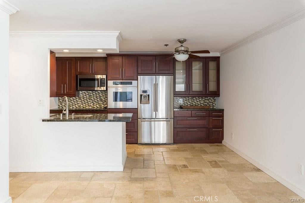 Californina Coastal living at it's finest !!!! This ocean view condo with sea breezes is just steps from the beach, boardwalk, dining and entertainment. Absolutely stunning and completely renovated this home shows like a model. Large living room with custom made Roman shades and cozy fireplace opens up to a gorgeous kitchen with custom built cabinets, granite countertops and stainless appliances. Travertine stone tile flooring in the entry, laundry room and kitchen. Custom wine closet with built in wine racks. 2 spacious bedrooms with the 2nd bedroom looking straight out to the ocean. Both baths are beautifully appointed with new tubs, glass doors and travertine stone tile. Hardwood baseboards, crown molding, ceiling fans, recessed LED lighting, new doors and hardware throughout. In unit laundry / utility room with stackable washer and dryer. Secure 2 side by side parking with lots of storage and a bike storage room.