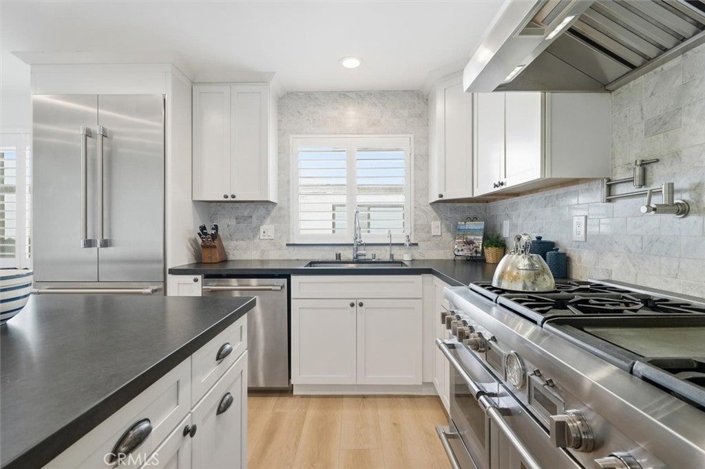 Back on the market! This is a rare opportunity to own an exceptional, fully remodeled end-unit townhome in the prime South Redondo Beach location, 1 block to the sand and a short stroll to the Village with a HUGE PRIVATE YARD AND PATIO! Offering unparalleled indoor/outdoor living this close to the beach for a townhome, this residence features an expansive 1,400 sq ft private landscaped yard and patio, perfect for pets, kids, and entertaining. With 1903 sq ft of indoor living space, this residence lives like a freestanding home—sharing only one wall and offering ample light and privacy. The lower level includes direct access to a 2-car garage with plenty of storage and a 220V EV outlet. Upstairs, the split-level living and dining areas feature 10-ft ceilings, a cozy gas fireplace, and French doors that open to the outdoor living area, creating a seamless flow. The heart of the home is the fully remodeled chef’s kitchen, outfitted with top-of-the-line Thermador professional series appliances, including a 6-burner dual-fuel range, double oven/steamer, soapstone countertops, custom cabinetry, and a built-in breakfast nook with table and storage —ideal for families and the culinary enthusiast who likes to host. Additional upgrades include new flooring throughout, plantation shutters, custom closets, designer paint inside and out, a new heater, new skylights, and thoughtful coastal-inspired finishes. Notably, this cozy 8-unit, two-building complex boasts modest HOA fees and a responsive and helpful board. They recently completed an extensive exterior painting and upgrade. The community exudes a strong sense of camaraderie, where neighbors actively support one another. This type of generational property is rare and only comes on the market occasionally. It offers walkability to world-class beaches and surf spots, top-rated schools, shops, grocery stores, restaurants, and the charm of the Riviera Village and Pier. Don't miss out on this quintessential Southern California coastal sanctuary.