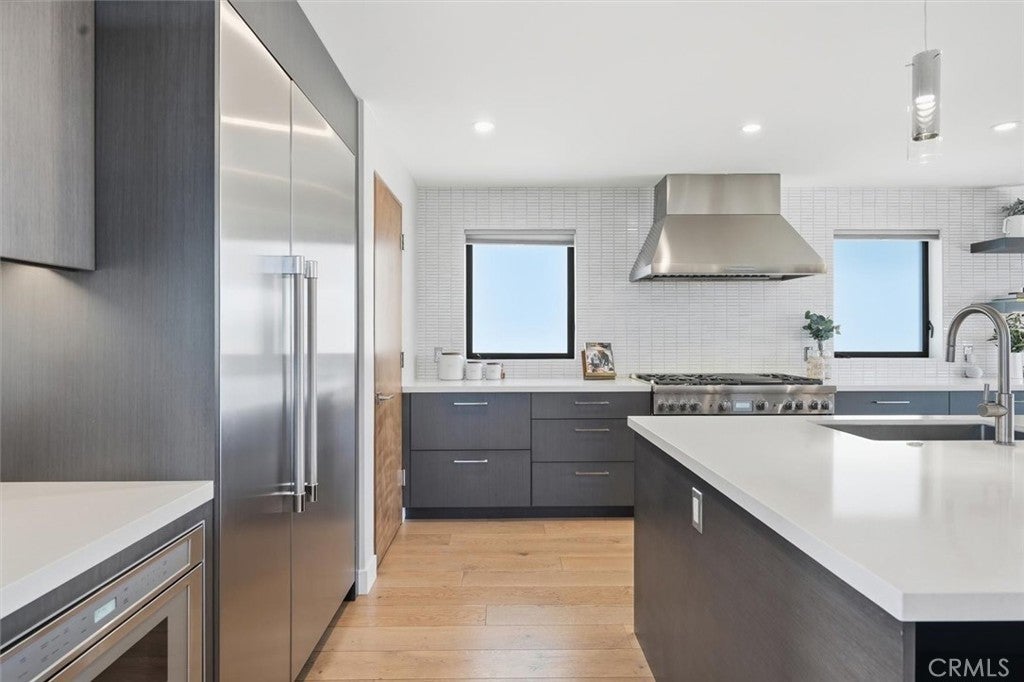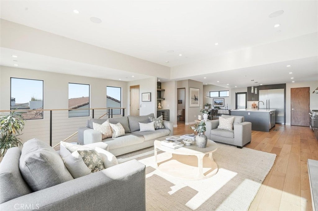 Form follows function in this stunning architectural residence impressively positioned atop the desirable Hermosa Hills and displays a commanding presence. The exquisite exterior captivates and beckons you into a light-filled foyer where a custom metal staircase railing adorns and tiles, hues, and textures sets the tone for the refined interior. Step up to an exceptional open concept floor plan that offers extraordinary entertainment possibilities, and effortless everyday living. The extensive great room is both phenomenal and sophisticated—wide plank wood floors tastefully adjoin a focal point fireplace that creates a warm and peaceful ambiance. The sparkling wall of glass doors allows sunlight to filter throughout the home and opens to vast west-facing ocean views, offering a refreshing backdrop of fresh air and spectacular sunsets. Seamless indoor-outdoor living defines this level, extending the experience to a rooftop deck with breathtaking panoramic views—the surroundings are plentiful and endlessly inviting. The heart of the home is a beautiful kitchen that delights any culinary enthusiast. Appointed with premium Thermador appliances, an abundance of cabinetry, walk-in pantry and an over-sized center island that serves multiple purposes such as a morning breakfast bar, prep area, or the ultimate entertaining hub. The addition of a roomy dining area offers relaxed get-togethers making every day feel special. Conveniently designed for comfort and privacy three substantial bedrooms on one level provide easy family living. The lavish primary suite is a true sanctuary, offering a spa inspired ensuite with dual vanities, soaking tub, glass enclosed walk-in shower, expansive walk-in closet, and all-embracing balcony expands the space allowing fresh ocean breezes. Two more airy bedrooms share a stylish bath creating a calm and tranquil setting for rest and rejuvenation. The lower level offers a private guest bedroom that can easily make for an outstanding home office with direct access to an outdoor patio. Additionally, a laundry room, direct garage access, and a 3-stop elevator makes a foundation for daily living. Hermosa means beautiful, and Hermosa Beach truly lives up to its name. This spectacular coastal community blends white sandy beaches, ocean air, and small-town charm, offering an unparalleled Southern California lifestyle. Award winning schools, trendy eateries, are all only a stroll away… Love Where You Live.