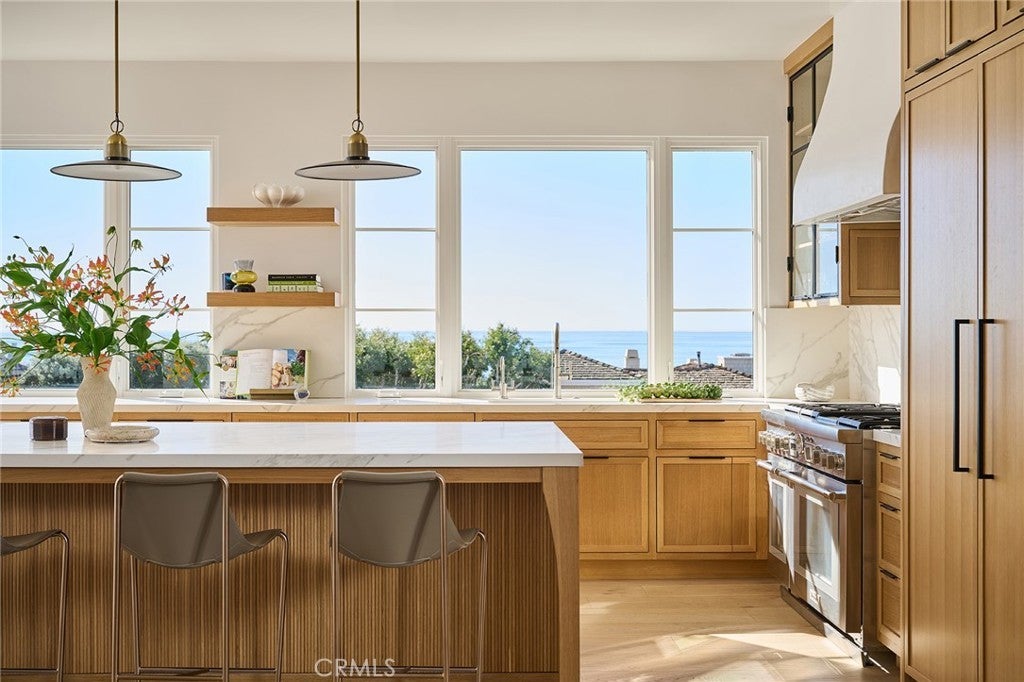 Set on an oversized lot in one of North Hermosa Beach’s most coveted coastal locations, this extraordinary residence offers panoramic ocean views made possible by a rare, grandfathered height advantage that exceeds current building limitations. Sweeping vistas span the Manhattan, Hermosa, and Redondo Beach piers and are enjoyed from multiple levels, creating a constant visual connection to the Pacific. Taken down to the studs and reconstructed by Icaza Construction, the home blends modern building standards with timeless, European-inspired design. Wide-plank 12-inch European white oak floors, fluted solid oak custom doors, and vintage brass iron detailing introduce warmth and character throughout. The heart of the home is the chef’s kitchen, where ocean views frame an oversized island designed for gathering and entertaining. High-end Thermador appliances, dual dishwashers, iron-accented cabinetry, a sculptural stucco hood, and thoughtfully selected countertops create a space that is both refined and functional. The kitchen opens seamlessly to the main living area, anchored by a striking fireplace, and flows naturally into a formal dining space framed by reclaimed wood, ideal for both everyday living and entertaining. A separate family room and bar area on the main level further enhances the home’s livability. The bar features custom white oak cabinetry, marble countertops, two beverage refrigerators, antique smoked mirrors, a copper sink, ample storage, and custom built-ins with dual televisions, perfect for relaxed evenings or hosting guests. With six bedrooms and five bathrooms, the layout offers exceptional flexibility. Four bedrooms are located on the lower level, along with an additional room ideal for a private office. The panoramic ocean-view primary suite occupies the top level and serves as a true retreat, complete with a spa-like marble bathroom featuring a dramatic walk-in shower and breathtaking views. Multiple outdoor spaces including a 700-square-foot rooftop deck with jacuzzi, front courtyard, and private patios extend the living experience outdoors. Additional highlights include a copper outdoor shower, epoxy-finished garage, metal roof, underground utilities, and extensive AV and security systems. Backed by a 10-year builder warranty, this is a rare opportunity to own a coastal residence that balances architectural detail, elevated design, and panoramic views just steps from the beach, the Strand, and the vibrant North Hermosa lifestyle.