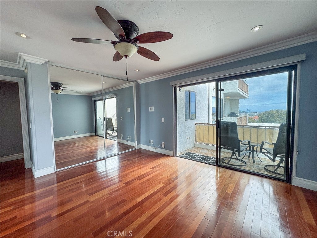 Stunning, revamped 2-bed, 2-bath, corner-unit condo in the beloved hilltop Oceanic Complex. Showstopper panoramic views stretch from the Vincent Thomas bridge to harbor to breakwater to open ocean views from nearly every room. Sun-drenched open floor plan features floor-to-ceiling windows. Large sliders lead to two private balconies. Gas fireplace and recessed lighting adorn the living room. Custom hardwood flooring sprawls throughout the main living areas. The hardwood floor is from Okinawa, Japan and has a 70-plus years guarantee. Sleek and striking green marble covers the kitchen and entryway floors. Chef-friendly kitchen includes granite countertops, soft-close cabinetry, under-cabinet lighting, stainless steel Samsung appliances, and ample storage space. Dine in style in the bright dining area framed by custom blinds and ocean views. The primary bedroom suite opens to your private balcony. Suite includes dual closets, ceiling fan, and a remodeled en-suite bathroom. The second bedroom offers mirrored closets, plantation shutters and more harbor and ocean views — ideal as a guest space or office. Additional highlights include crown molding and upgraded baseboards throughout. The home comes with 2 parking spaces: 1 in secured subterranean parking with a private storage area and the other in the complex's private parking. Laundry is conveniently located just steps from the unit. You're just a short hop to Point Fermin park's 37 acres of lovely landscaped lawns, hiking trails, gardens, pergolas, picnic areas, and playground where you can stroll along the beach palisade to spot the dolphins and seals. You're also just minutes from the rebranded, renovated, and revitalized legendary Ports of Call. Catch the wave of the new San Pedro. Comfort, value, and ocean views ready for you.