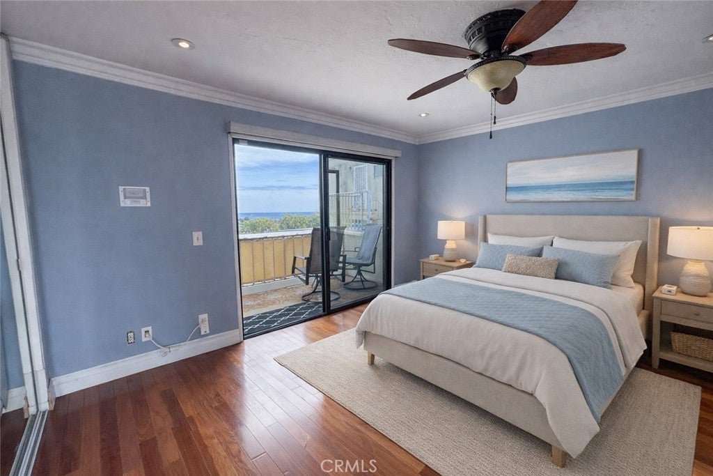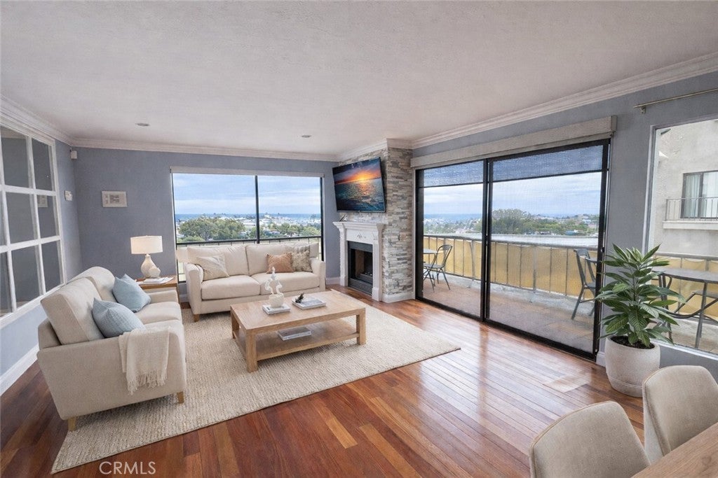 Stunning, revamped 2-bed, 2-bath, corner-unit condo in the beloved hilltop Oceanic Complex. Showstopper panoramic views stretch from the Vincent Thomas bridge to harbor to breakwater to open ocean views from nearly every room. Sun-drenched open floor plan features floor-to-ceiling windows. Large sliders lead to two private balconies. Gas fireplace and recessed lighting adorn the living room. Custom hardwood flooring sprawls throughout the main living areas. The hardwood floor is from Okinawa, Japan and has a 70-plus years guarantee. Sleek and striking green marble covers the kitchen and entryway floors. Chef-friendly kitchen includes granite countertops, soft-close cabinetry, under-cabinet lighting, stainless steel Samsung appliances, and ample storage space. Dine in style in the bright dining area framed by custom blinds and ocean views. The primary bedroom suite opens to your private balcony. Suite includes dual closets, ceiling fan, and a remodeled en-suite bathroom. The second bedroom offers mirrored closets, plantation shutters and more harbor and ocean views — ideal as a guest space or office. Additional highlights include crown molding and upgraded baseboards throughout. Please note some pictures have been virtually staged. The home comes with 2 parking spaces: 1 in secured subterranean parking with a private storage area and the other in the complex's private parking. Laundry is conveniently located just steps from the unit. You're just a short hop to Point Fermin park's 37 acres of lovely landscaped lawns, hiking trails, gardens, pergolas, picnic areas, and playground where you can stroll along the beach palisade to spot the dolphins and seals. You're also just minutes from the rebranded, renovated, and revitalized legendary Ports of Call. Catch the wave of the new San Pedro. Comfort, value, and ocean views ready for you.