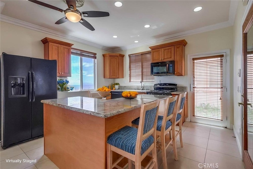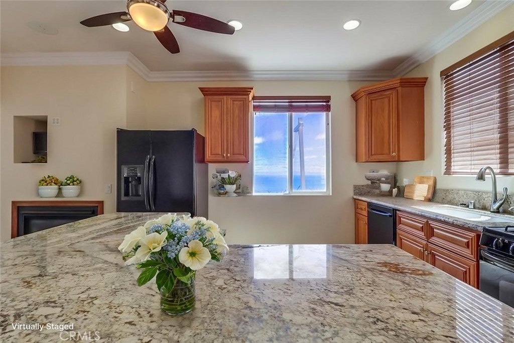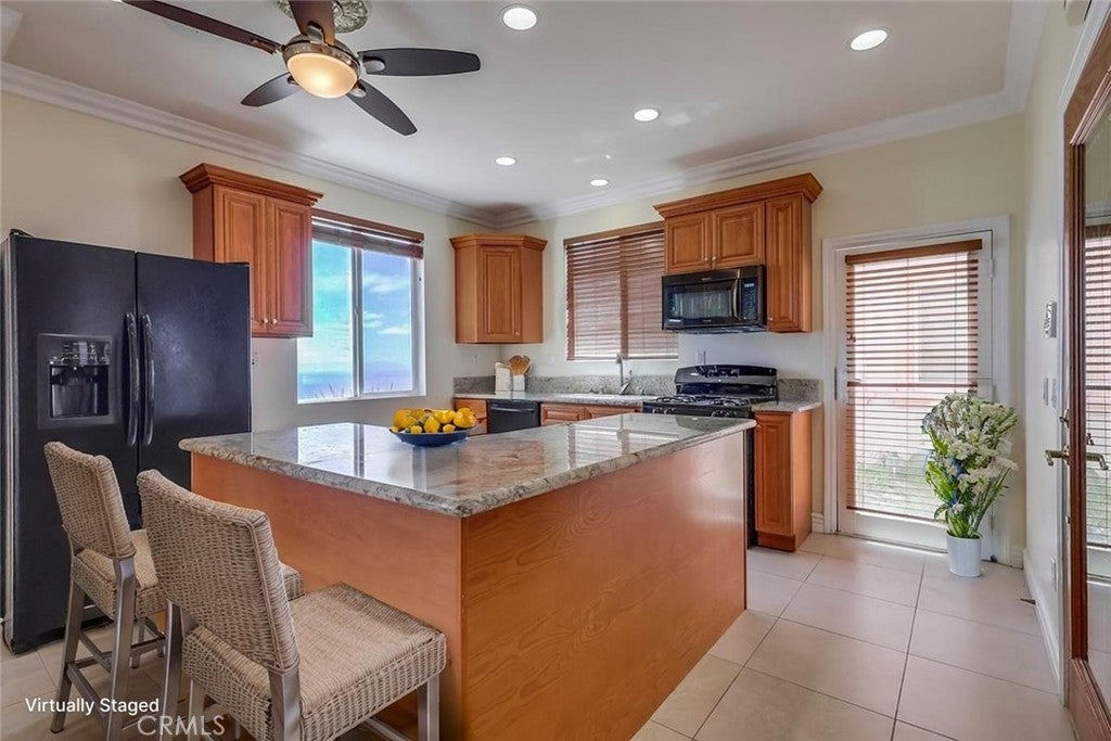 Fabulous first floor, one level 2-bedroom 2-bathroom apartment with sweeping Pacific Ocean, Catalina Island, Golf Course & Sunset views is available for rent! Rental fee includes water, trash, gas, sewage, & electricity. Home is located on a quiet cul de sac and has stunning views from inside home and outside terraces. Kitchen features gas stove, microwave, refrigerator, dishwasher, granite countertops, and kitchen island. Kitchen is open to the living room. Living room features a gas fireplace and easy-care flooring. There are two bathrooms: Shower/tub combo in one bathroom; walk-in shower in the other bathroom. Stone terrace features sweeping ocean, golf course, & Catalina Island views. Ceiling fans in bedrooms plus central air conditioning and heat is a bonus. Crown molding throughout this one-of-a-kind property. Tenants utilize street parking which is plentiful. Don't miss this opportunity!