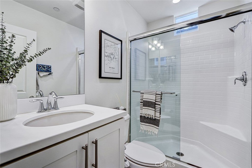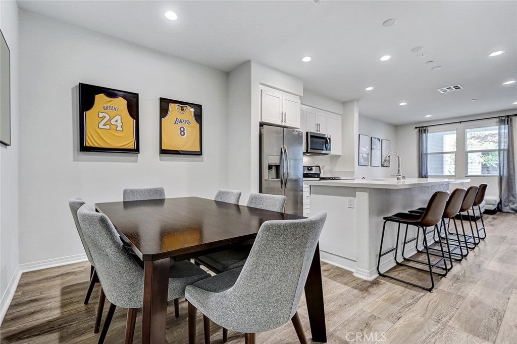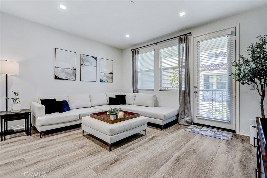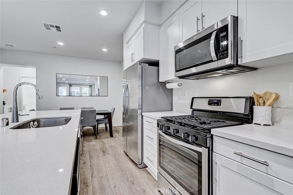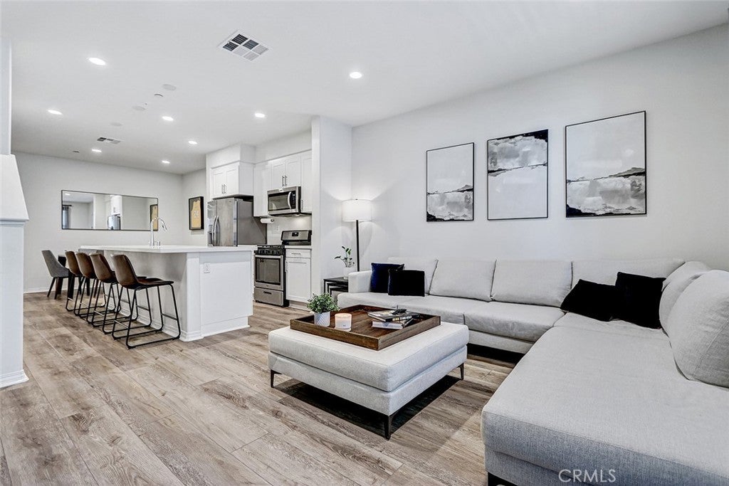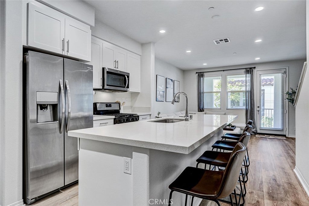 Welcome to 629 S Kinney Way — a modern tri-level gem in the sought-after District Walk community of Anaheim. Built in 2019, this beautifully upgraded 3-bedroom, 3-bathroom townhome offers 1,511 sq ft of thoughtfully designed living space, showcasing contemporary style and premium finishes throughout. On the main level, enjoy an open-concept layout featuring high-end vinyl flooring, recessed lighting, and a spacious living area that flows seamlessly into a gourmet kitchen equipped with quartz countertops and ample cabinetry. A private balcony and full bathroom enhance the functionality and comfort of this floor — perfect for both everyday living and entertaining. The top level features two generously sized bedrooms, including a primary retreat with a walk-in closet and an elegantly finished en-suite bathroom. Additional conveniences include a whole-house fan for energy-efficient cooling and an upstairs laundry area for added ease. Situated just minutes from premier shopping, dining, and world-famous Disneyland, this home delivers the perfect balance of modern design, comfort, and community in one of Anaheim’s most desirable neighborhoods.