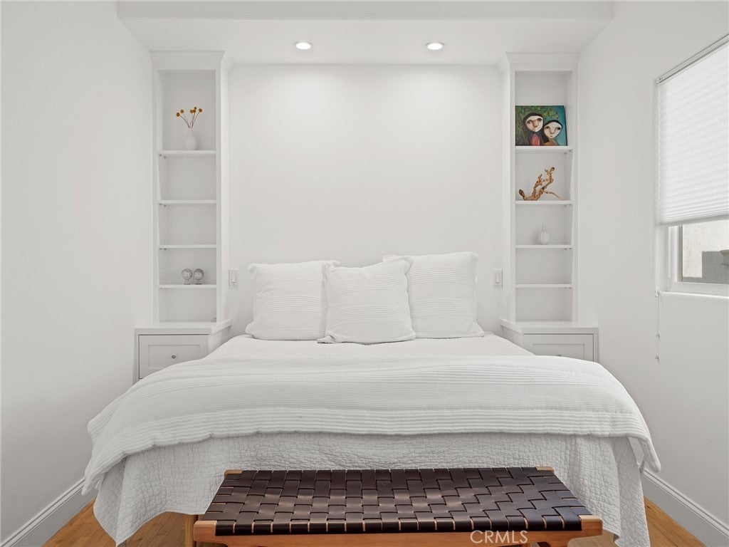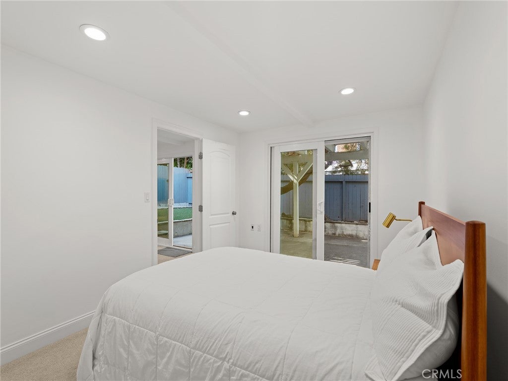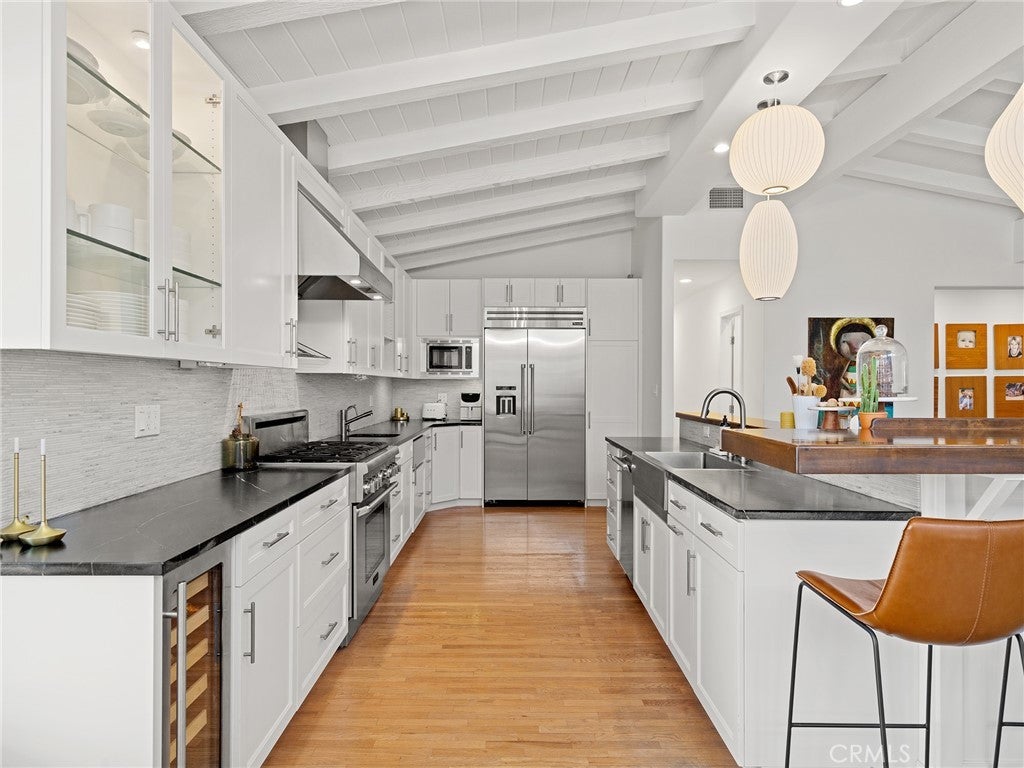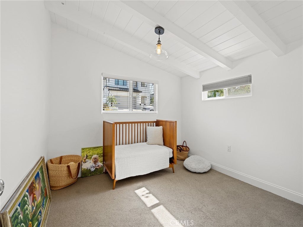 California coastal street presence with a bright, mid century modern interior. The main level features a vaulted ceiling great room with exposed beams, wood floors, and abundant natural light. An open layout connects the living area to the kitchen and dining space, where large glass windows and doors frame the rear deck and yard, creating a strong indoor outdoor connection. The kitchen and dining area include bar seating and direct access to the outdoor deck for easy entertaining. Three bedrooms and two bathrooms, including the primary suite, are all located on the main level, along with an office and laundry area. The lower level offers a second living or media room, a fourth bedroom, and access to a private yard and covered patio, providing flexible space for guests, work, or recreation. Additional features include central air conditioning, an attached two car garage with direct access, and a convenient Tree Section location close to Manhattan Beach schools, restaurants, shopping and the beach.