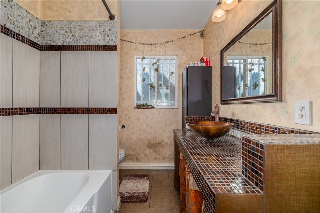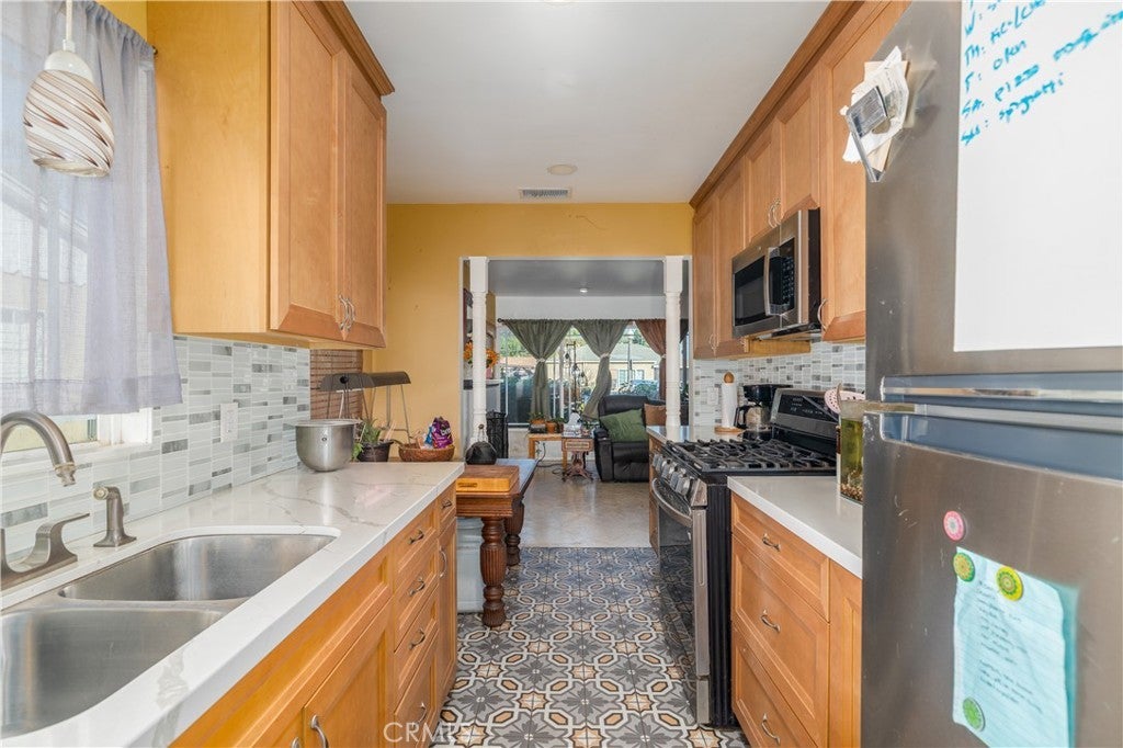 Absolutely ADORABLE bungalow in Santa Ana boasting 2 bedrooms, 1 Bath, PLUS AN OFFICE WHICH COULD BE USED AS A 3RD BEDROOM! Upon entry you will be welcomed by a warm, inviting living room with a beautiful fireplace, recessed lighting and large windows. Adjacent to the living room is a nicely remodeled kitchen with newer cabinets, stone countertops, tile backsplash and custom lighting. Primary bedroom is generous in size and can easily accommodate a king size bed! Both the Guest bedroom and the Office are light and bright! Recessed lighting throughout gives this home so much flow and continuity. Newer HVAC was added less than 6 years ago! A long driveway leads you to a 2 car detached garage allowing for additional cars, RV, trailer and toys! Covered rear porch area offers so many options leading you to a patio landscaped with flagstone. The large backyard is family perfect and features a gated area currently used to grow fruits and vegetables. This house is a must see!