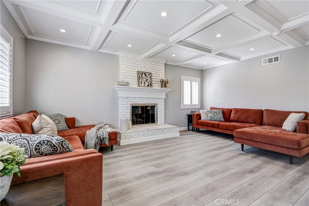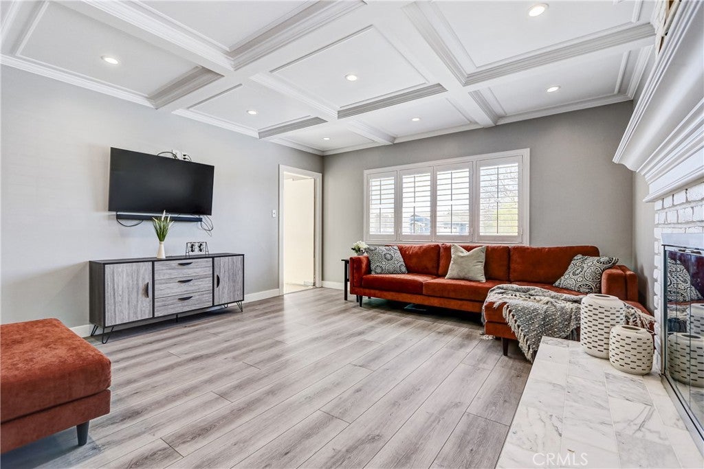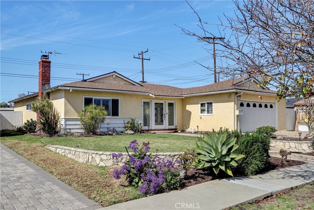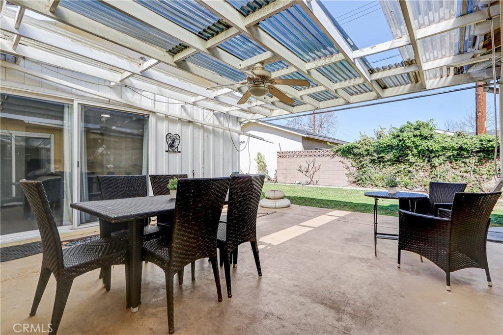 This wonderful home has been beautifully updated. Huge formal living room with cove ceilings, recessed lights and stunning white brick fireplace. Huge kitchen with breakfast bar, custom cabinets, Quartz counter tops, tile floors and built-in desk area. ( closet for stack-able washer/dryer in kitchen). The kitchen opens up to a spacious dining room which opens up to a private patio area for outdoor entertainment. Both baths have been nicely updated. Luxury vinyl plank floors, window shutters and skylights through out. Fresh paint. 2 car attached garage with direct access. Great backyard for the kids to play.