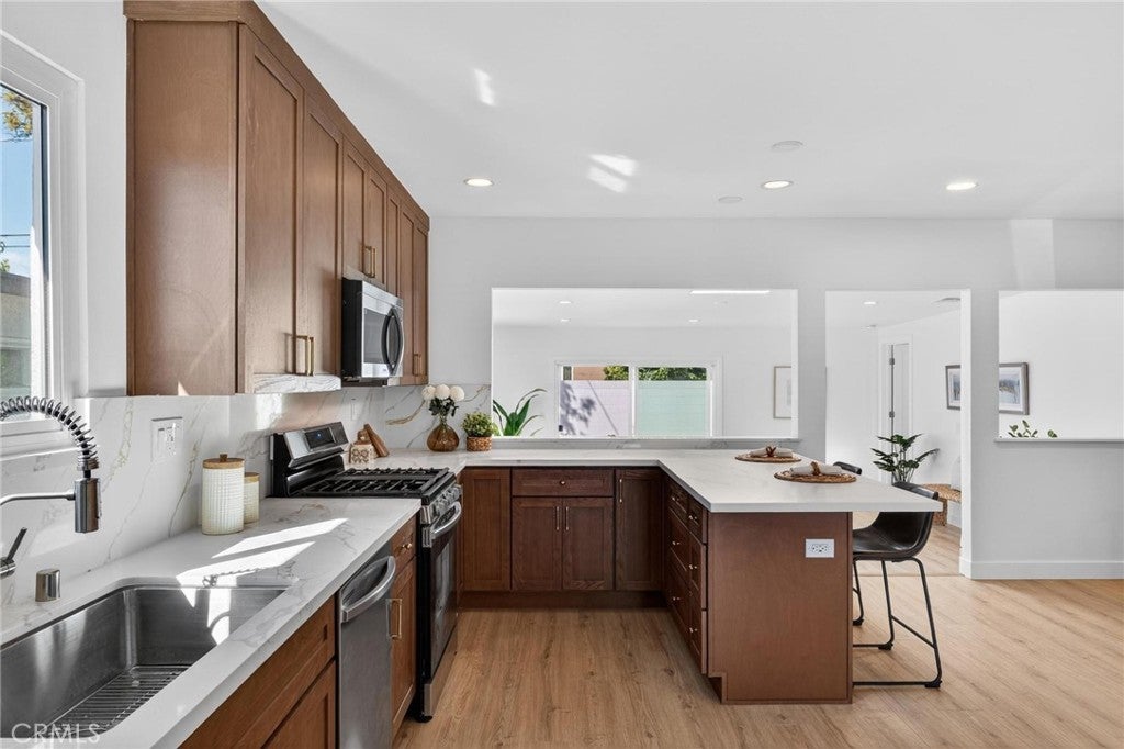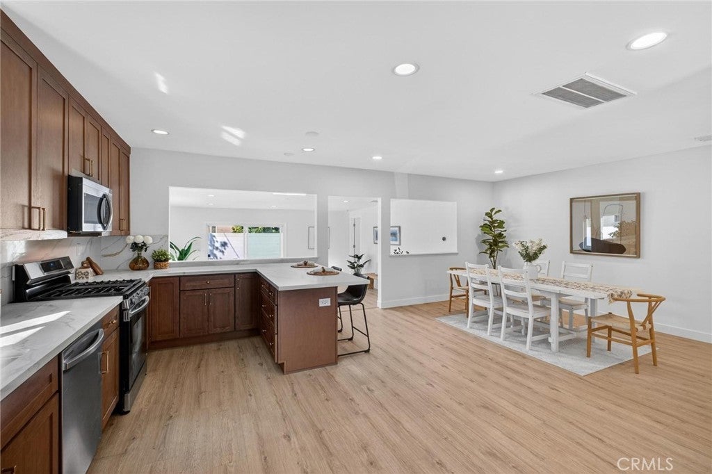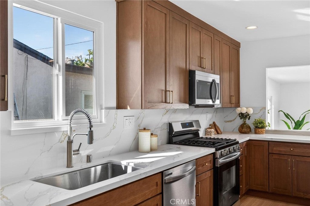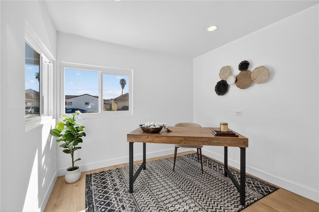 Fully remodeled and filled with natural light, 18901 Haas Ave offers a spacious and thoughtfully designed layout in a quiet Torrance neighborhood. This 4-bedroom, 2-bathroom home PLUS a dedicated office spans approximately 1,850 square feet on a flat 5,000+ square foot lot, delivering modern updates and flexible living spaces throughout. Inside, new wide plank flooring and energy-efficient windows create a bright and inviting atmosphere. The beautifully remodeled kitchen features rich wood cabinetry, light quartz countertops, and stainless steel appliances, opening to an oversized dining area that flows naturally into a step-down living room—ideal for everyday living and entertaining. Just off the kitchen, a generous office provides the perfect space for working from home or creative pursuits, while a convenient stackable laundry area includes a washer and dryer. The home’s layout offers excellent separation, with three bedrooms and a full bathroom located off the dining area, while the private primary suite sits just off the living room with views of the backyard. The oversized living room opens to a patio and a large, flat backyard—offering plenty of room for outdoor dining, play, or future possibilities. Additional improvements include a new roof, new windows, new HVAC, new electrical panel, and updated finishes throughout. Situated on a quiet horseshoe street with minimal through traffic, the home offers a peaceful setting while providing quick freeway access for commuters, along with close proximity to award-winning Torrance schools, shopping, dining, and less than five miles to the beach.