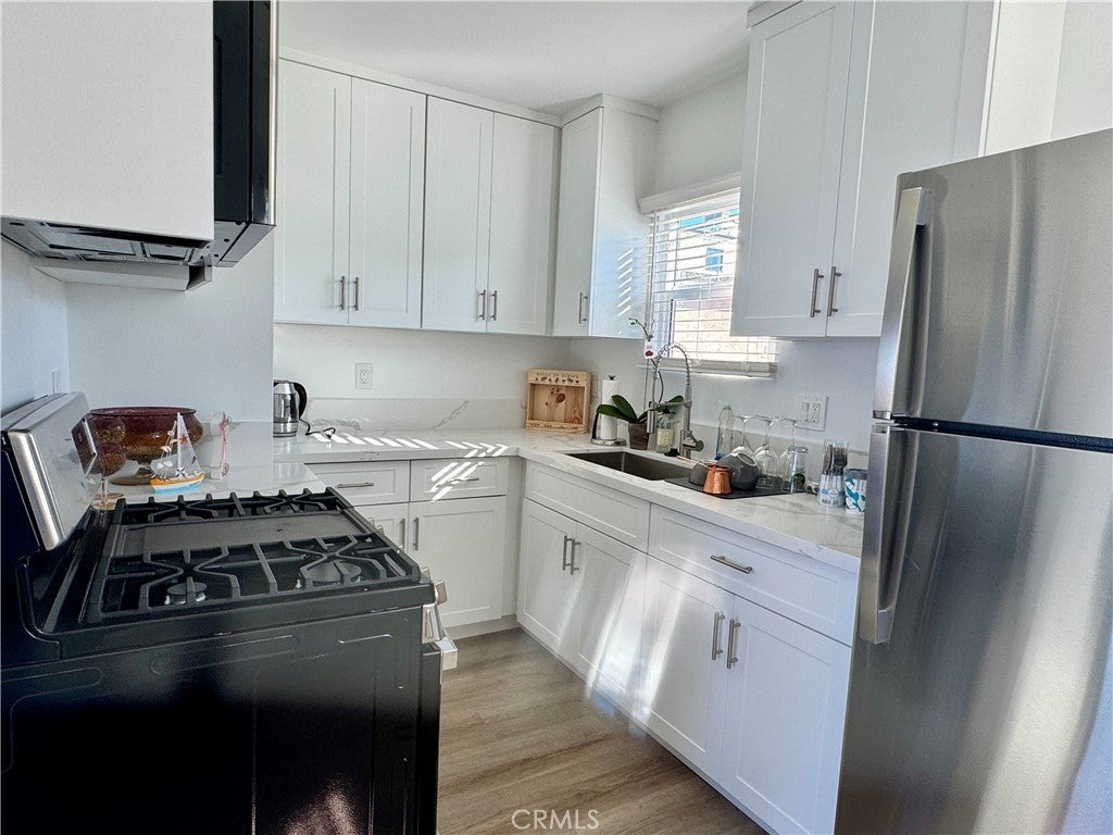 Recently remodeled and ideally located just two blocks from the beach and vibrant Pier Avenue, this home features a brand-new kitchen with updated appliances, wood laminate flooring, and fresh paint throughout, along with beautiful ocean views from both the living room and bedroom. Enjoy a contemporary bathroom with a walk-in shower, ceiling fans in each room, and tasteful window treatments, plus a cozy dining area perfect for everyday living. Situated one flight up for added privacy and enhanced views, the unit also includes a private one-car garage, all just a short stroll from local shops, restaurants, and the Hermosa Pier.