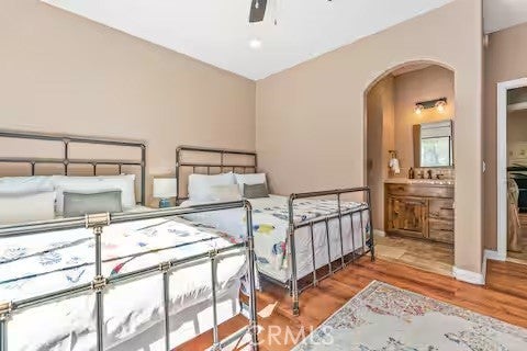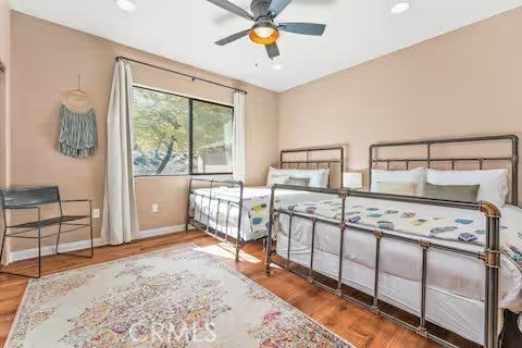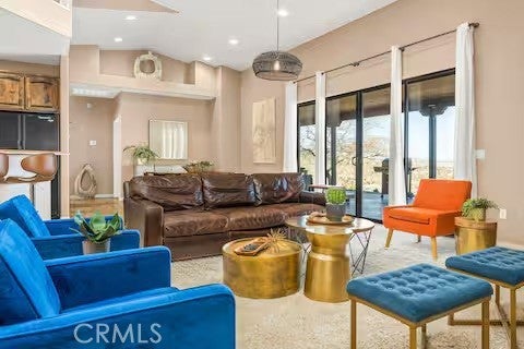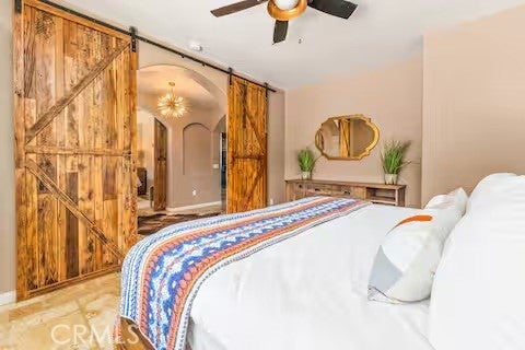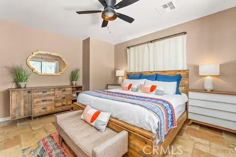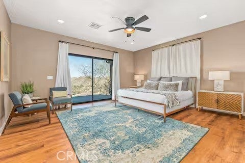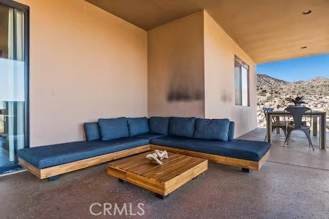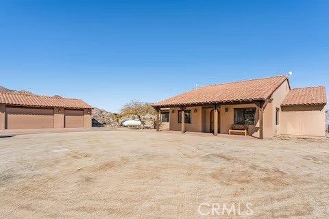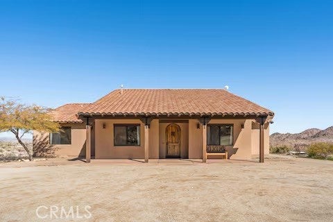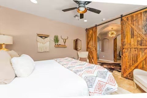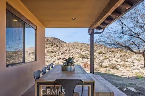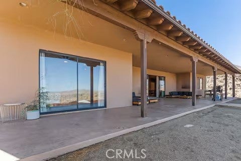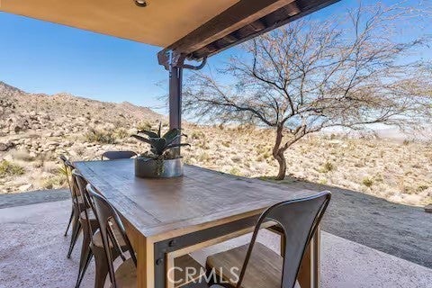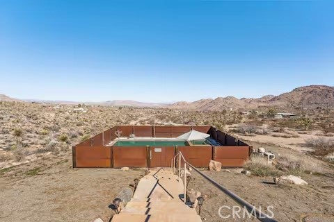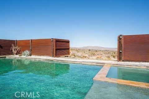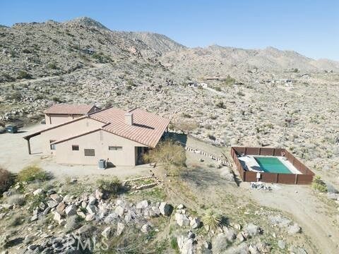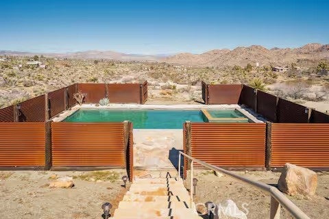 Escape to this gorgeous pool home on a generous 5 acre equestrian lot in Joshua Tree's most desirable neighborhood! Less than 3 miles from the National Park entrance, the location can't be beat. At almost 2600 square feet this spacious home enjoys sweeping views of the valley, high ceilings, and a touch of southwestern flair. Enter the home through the antique wooden door brought up from Mexico and you're greeted by custom wooden barn doors on either side of you leading to bonus rooms (originally den and dining rooms) now being used as additional bedrooms. Continue into the great room where you find a cozy family room complete with a pellet stove and reclaimed wood mantle. To your left is the dining area, and behind you the open kitchen. The kitchen features granite countertops, built in appliances, and tons of storage. Stand over your copper sink at the kitchen island and past your loved ones and onto the panoramic desert view through your sliding doors. On one side of the home you'll find a half bathroom as well as a primary bedroom en suite w/ a sliding door for more views, and a gorgeous en suite bathroom featuring a jetted spa tub, double vanity, walk-in shower, and walk-in closet. This entire suite is filled with natural light during the day and a peaceful distance from the other bedrooms at night. The other side of the home features two more bedrooms each with their own in-room vanity and a jack 'n' Jill bathroom. There is a laundry room that includes two sets of washer/dryers, cabinets, and a utility closet. The home features Central heat and air conditioning (2 units), central vacuum, ceiling fans in all rooms, and Nest thermostats. Now for the real showstopper, the outdoors! The covered back patio looks down onto your fenced and heated in-ground sparkling pool and spa. Large swinging back gates allow you to open them for a panoramic desert view from inside of the pool area as well, or turn off the interior pool/spa lights and gaze up into the starlit night sky. Off the front patio you'll find tons of parking, a large 3 car garage (currently a game room) with a built in counter and mini-fridge, and 2 OWNED extra-large propane tanks which allows you to negotiate on your propane costs. This lot also features plenty of land where previous owners enjoyed keeping horses. From copper sinks to railroad tie fence posts, this home has a truly special feel. Continue it's run as a highly successful Airbnb or make Cope Compound your very own paradise!