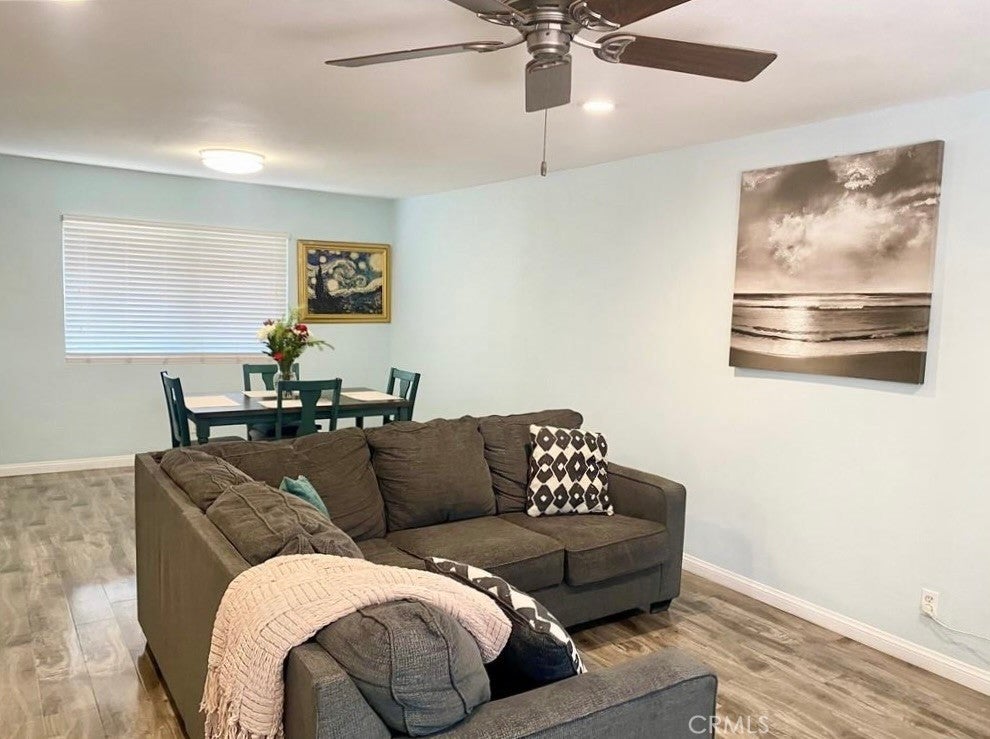 Spacious two-story townhouse featuring laminate and tile flooring throughout. The expansive living room offers a cozy, crackling gas fireplace and an inviting dining area—perfect for entertaining. The primary suite boasts an open layout with soaring vaulted ceilings that fill the space with natural light. An extra-large closet, and large bathroom with lots of counter space. The secondary bedroom includes its own private en-suite bathroom with a full bath and shower. A separate laundry room is conveniently located upstairs in the center of the hallway. This exceptional property also includes two gated, side-by-side secure parking spaces, plus three guest parking spots for added convenience.
