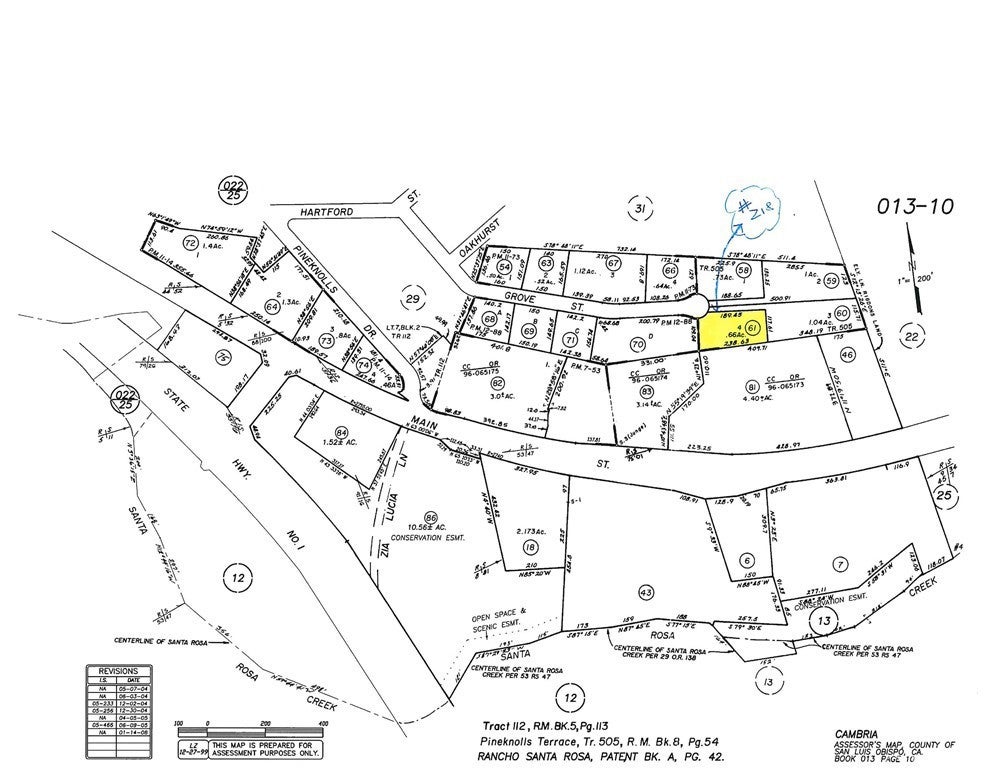 Pine Knolls Estates +-2/3 acre at the end of Grove Street with #218 on CCSD Water Wait List! Overlooks West Village to the Ocean and the Fiscalini Preserve. Gentle slope, easy access, private sunny area. Paved Street to the edge of the property. Don't miss this Excellent Property! Buy and Hold for now until the current building moratorium for new construction is lifted. Check CCSD and county websites (cambriacsd.org & slocounty.ca.gov) for info on the moratorium & allowable uses for property. Offered for $99,000.