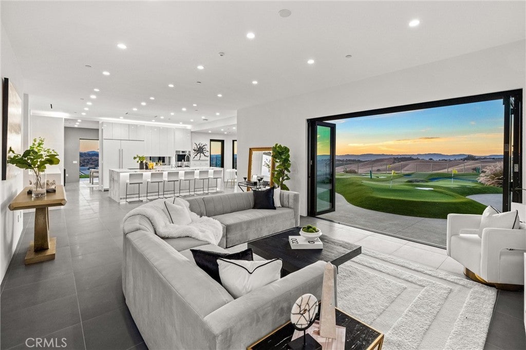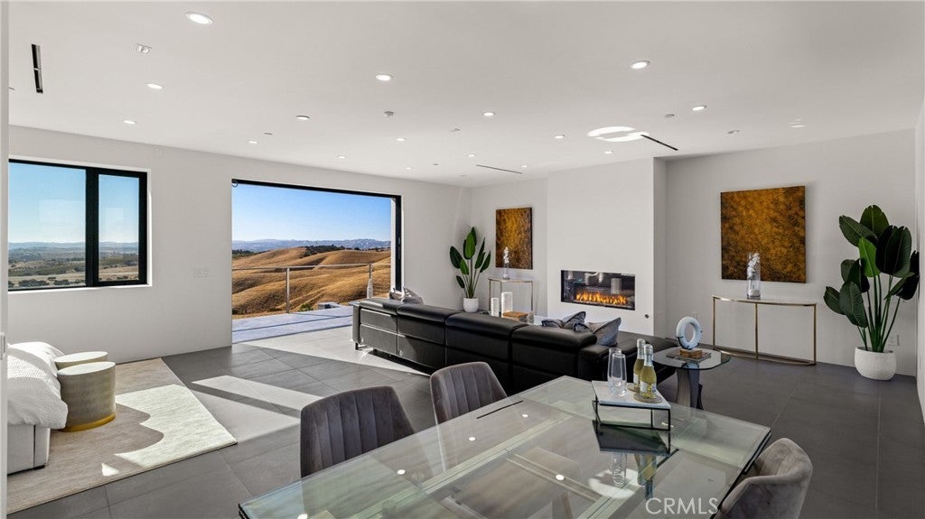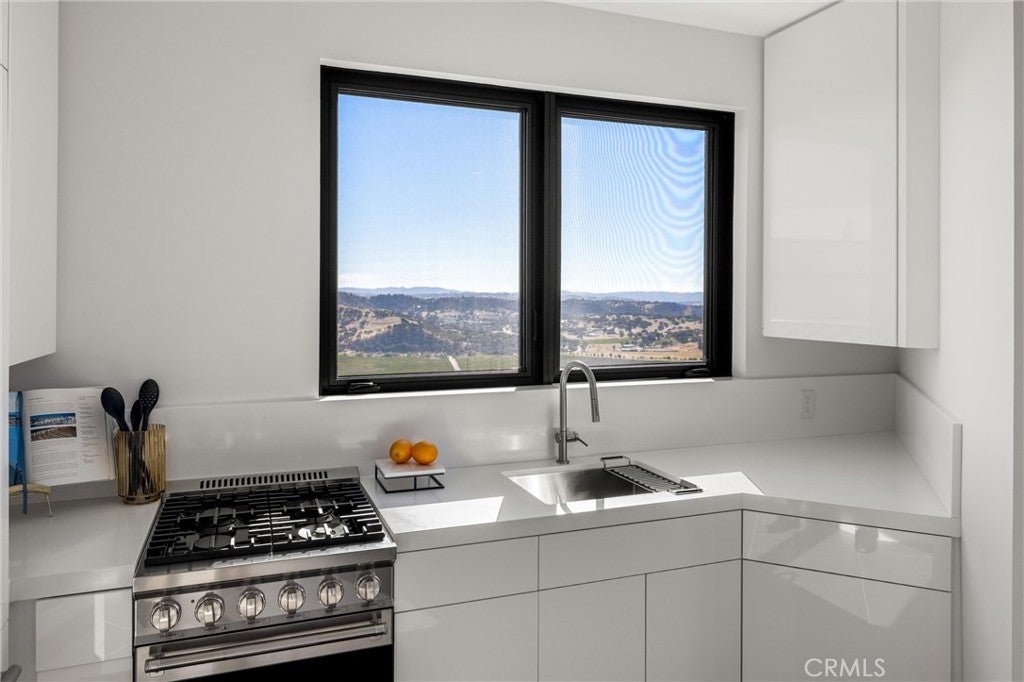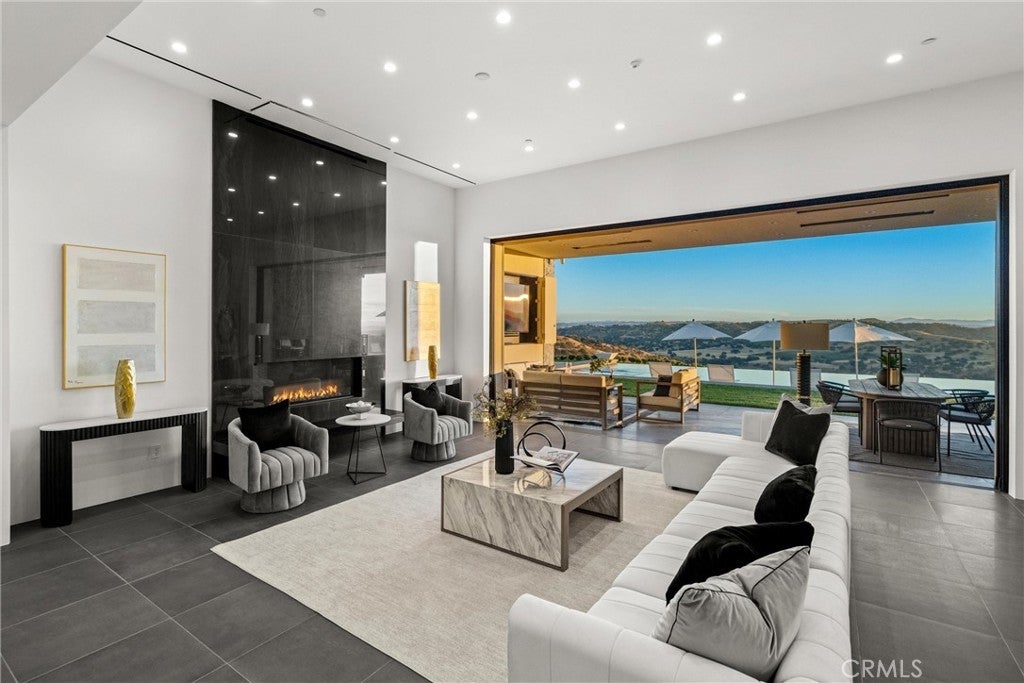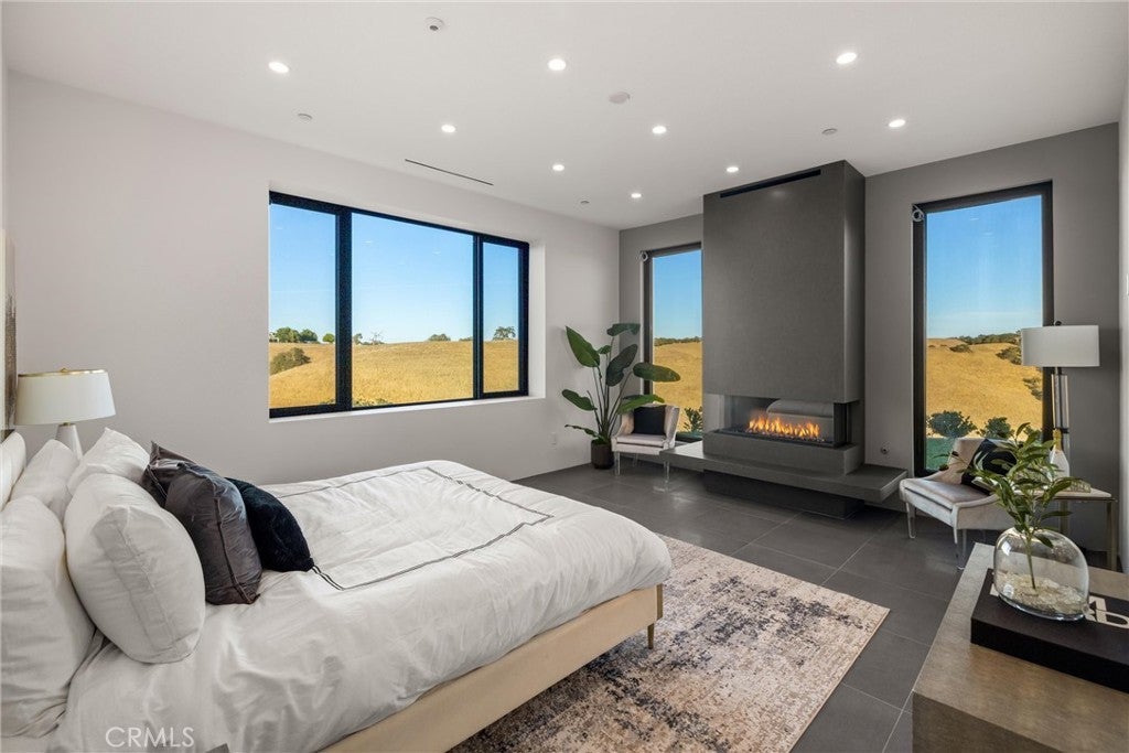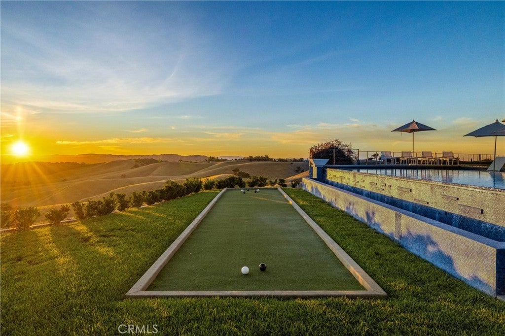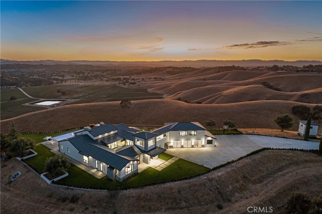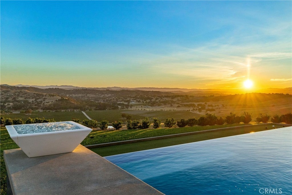 Escape to the majestic rolling hills of Paso Robles, a premier destination in California’s wine country. Nestled on 40 private acres above the famed Cass Winery, this Modern Luxury Estate epitomizes the essence of indoor-outdoor living with sophistication and elegance. The Italian cypress-lined drive leads to the heart of the property, where the beautiful landscape invites you to experience the seamless integration of nature and modern architecture. The Grand Atrium serves as the estate’s main entrance and central hub, welcoming you into a space that effortlessly connects to both the main living areas and a private guest apartment. As you enter the wide-open living room you experience panoramic views of rolling hills through expansive sliding glass doors that seamlessly transition between the interior space and the outdoors, blurring the line between the two environments. The gourmet kitchen is a chef’s delight, featuring a stunning waterfall island with moonstone quartz countertop w/ top tier appliances, and a Vinotemp Private Reserve wine refrigerator adds a touch of artistry. The kitchen nook has direct access to the outdoor alfresco kitchen. And a formal dining room provides an elegant setting, complete with a 300+bottle temp-controlled wine wall. The primary en-suite offers a private sanctuary, with breathtaking views. A Brazilian white Calcite stone fireplace adds warmth, while the en-suite bathroom offers a spa-like retreat. Dual custom vanities, a freestanding tub, a luxurious waterfall rain shower designed by Franco Sargiani are surrounded by Verde Fusion stone from Brazil. The suite boasts dual closets, custom cabinetry & lighted shelving. Additional guest accommodations include two en-suite bedrooms, a fully equipped gym for wellness enthusiasts and a private studio with open-concept living. Outfitted w/ luxurious finishes, two private decks, a full kitchen, laundry closet, and a stunning walk-in shower. The Outdoor living space offers a resort-caliber setting with a state-of-the-art alfresco kitchen. The infinity-edge pool overlooks Paso Robles’ rolling hills, offering a backdrop for relaxation. A heated built-in hot tub, Baja sun shelf, and in-pool seating enhance the experience, while a resort-style putting course, designed by renowned Camron Howell, adds a playful touch. The outdoor amenities also include bocce ball court and built-in basketball hoop, ensuring that every aspect of the estate is as luxurious as it is functional.