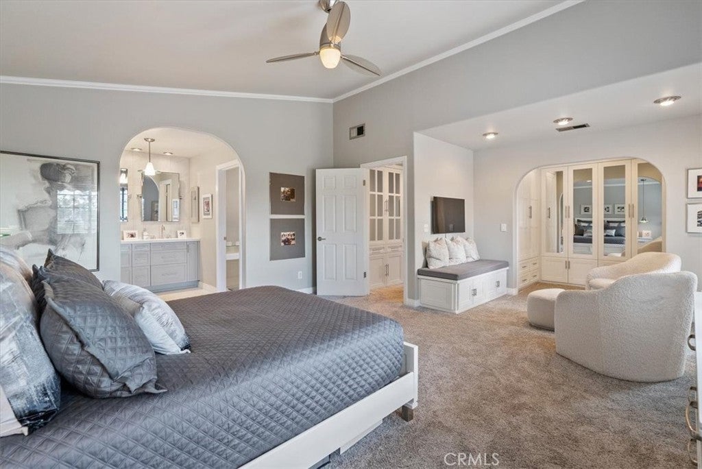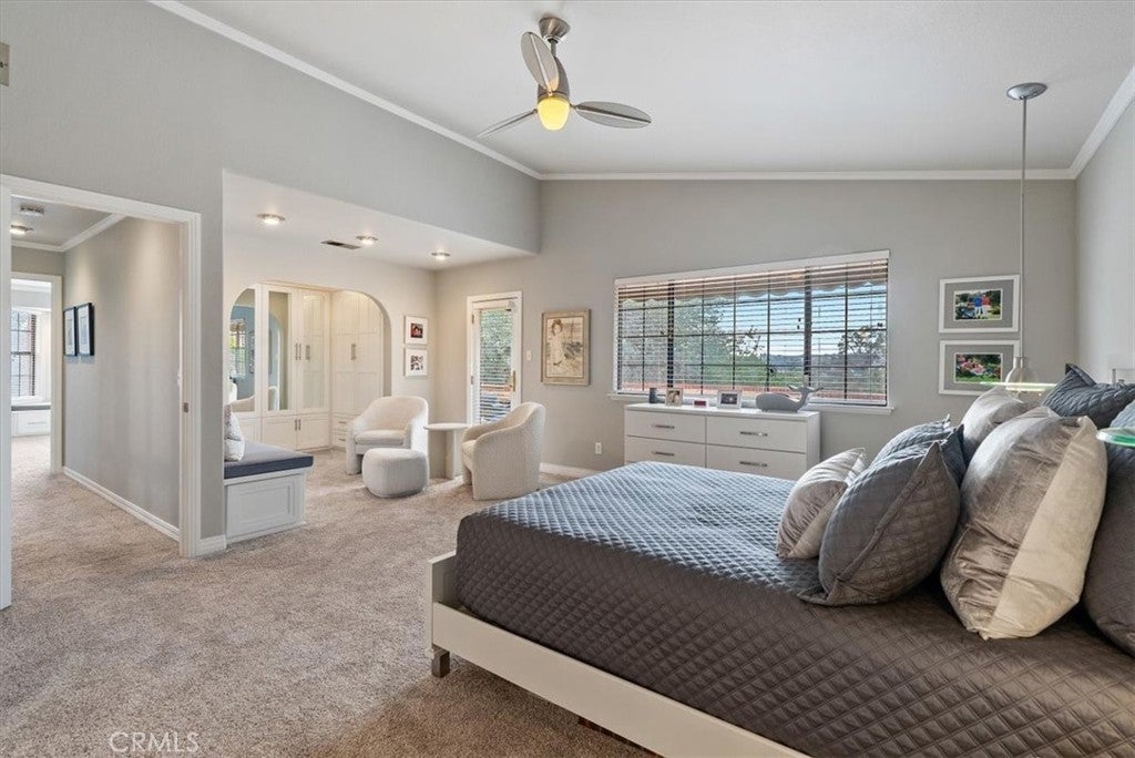 Breakfast Bar, Breakfast Area, Ceiling Fan(s), Crown Molding, Cathedral Ceiling(s), Separate/Formal Dining Room, Eat-in Kitchen, Open Floorplan, Recessed Lighting, Storage, All Bedrooms Down, Bedroom on Main Level, Main Level Primary, Primary Suite, Ceramic Counters, Solid Surface Counters