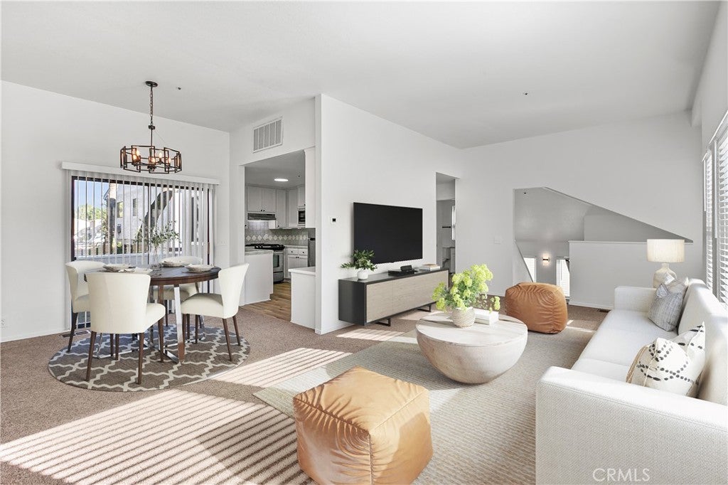 Sun-drenched and beautifully reimagined, this 1,335 sq ft two-bedroom, two-bathroom condo offers a perfect blend of style, comfort, and effortless living. Soaring ceilings and expansive windows flood the home with natural light, creating an airy, welcoming ambiance from the moment you step inside. The lower level features a generously sized bedroom with sliding glass doors that open to a private patio and yard - an ideal guest suite or home office - paired with a full bathroom for added convenience. Upstairs, the open-concept living, dining, and kitchen spaces shine with dramatic ceiling heights, making everyday living feel elevated. Step just outside the dining area to a cozy patio - perfect for morning coffee, evening wine, or gathering with friends under the stars. Down the hall, you’ll find a second spacious bedroom, an additional full bathroom, and a conveniently located laundry area, all thoughtfully designed to maximize comfort and functionality. Recent upgrades throughout the home include fresh interior & exterior paint, new carpet and flooring, and brand-new appliances, ensuring a truly move-in-ready experience. Rounding out the property is a large two-car garage with a freshly epoxied floor and a bonus storage room for your bikes, gear, and everything life brings along. Stylish, light-filled, and impeccably updated, this home offers the space you need and the lifestyle you want, ready for you to move in and make it your own. Seller will cover first year of HOA fees.
