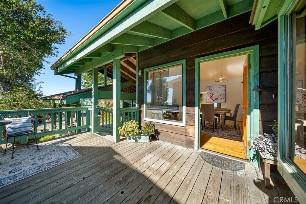 Indulge in crisp sea breezes from every corner of this extraordinary haven awaiting your loving care! Positioned on a secluded cul-de-sac, the original redwood cabin was expanded by its current owner in 1990 and offers considerable privacy. Inside, vaulted cedar ceilings and walls set the tone, while a brick wood-burning fireplace anchors the living room with timeless character. Natural light pours through skylights, illuminating the dining area, while the adjoining kitchen is both practical and stylish, with stainless steel appliances, a prep island, tiled countertops, and a generous pantry. The main floor offers an office/library with built-in shelves and a loft, plus two comfortable bedrooms for flexible sleeping arrangements - all of which offer views of the shimmering sea. A second primary suite, with soaring ceilings, dual walk-in closets, a balcony with whitewater vistas, and a tranquil ensuite, is exclusive to the upper level. Perks include a laundry nook, ample parking, and abundant storage throughout. Unwind in your low-maintenance yard with citrus trees, host celebrations on the expansive deck with its ocean views, and enjoy easy access to Moonstone Beach and Cambria’s West Village. Come see how this coastal retreat could be your ideal escape from the city!