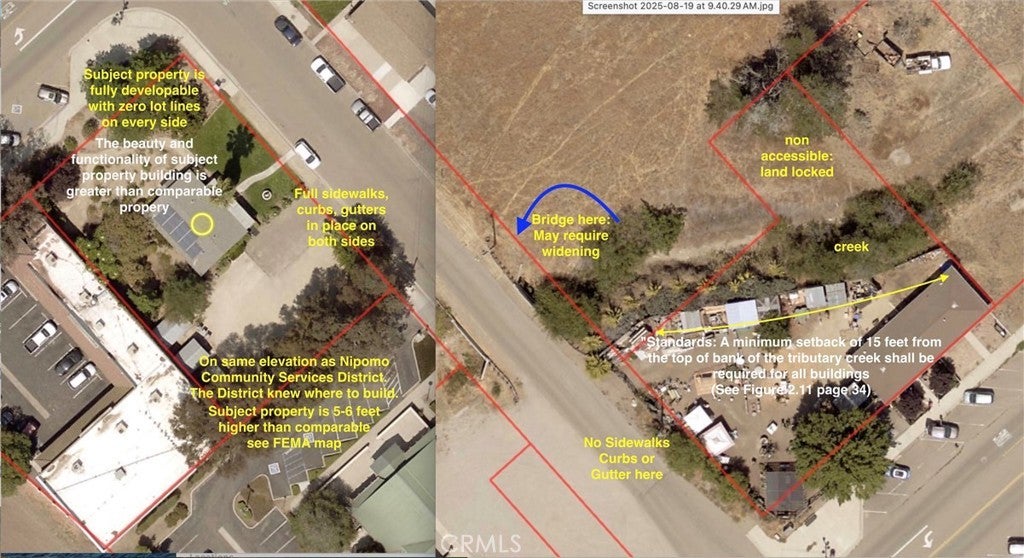Video: https://cdn.muse.ai/u/kQXGNUX/823494b617fc2f642a5acd92a50f4babf79463a782c3bc5b93978b493c735b65/videos/video.mp4 This property is also listed under Commercial Sale as MLS# SC25281362 PRIME DEVELOPMENT OPPORTUNITY Prime development opportunity in the heart of Nipomo's civic center. This 15,000 SF CR-zoned property offers 6,000 SF of building coverage area (40% coverage) with complete infrastructure and zero lot-line setback capability under the Olde Towne Nipomo Design and Circulation Plan. STRATEGIC LOCATION Located on Tefft Street, Olde Towne Nipomo's main commercial thoroughfare with excellent visibility. Directly adjacent to Nipomo Community Services District building. Across Wilson St from Laborers Union Hall Local 220. Across Tefft St from new Sheriff's building, breaking ground in 2026. Quarter block west of modern two-story mixed-use project, adjacent to Casa Grande Center. One block east of Adobe Plaza and Birchwood. FLOOD ZONE ADVANTAGE Property sits at 324.2 feet elevation, 6.2 feet higher than comparable properties in the area. In 100-year flood zone, but elevation difference provides lower flood insurance costs and lower engineering and construction costs. DEVELOPMENT READY Sidewalks, curbs, and gutters on both street frontages. Zero lot-line setbacks allowed on all sides. No off-site improvements required. Water and sewer connections available through Nipomo Community Services District. Area operates under Olde Towne Nipomo Design Plan with streamlined development guidelines. EXISTING BUILDING 1,064 SF office building, built 1959, excellent condition, four rooms. Currently generating $2,200/month income. Convertible to other uses or redevelopment opportunity. ZONING AND DEVELOPMENT OPTIONS CR (Commercial/Residential). Maximum 40% lot coverage. Zero setback development allowed. Accommodates mixed-use development with ground-floor commercial and residential units above, or high-density residential up to three stories with ground-floor parking. Old Town Nipomo benefits include reduced parking requirements (40% vs 100% through public parking initiatives) and zero lot line development. AVAILABLE FOR Commercial Sale, Commercial Lease, or Lease Option to Buy. RECENT COMPARABLE 188 W Tefft St sold May 16, 2025 for $675,000, one block away in same CR zoning. See Supplements for detailed comparative analysis