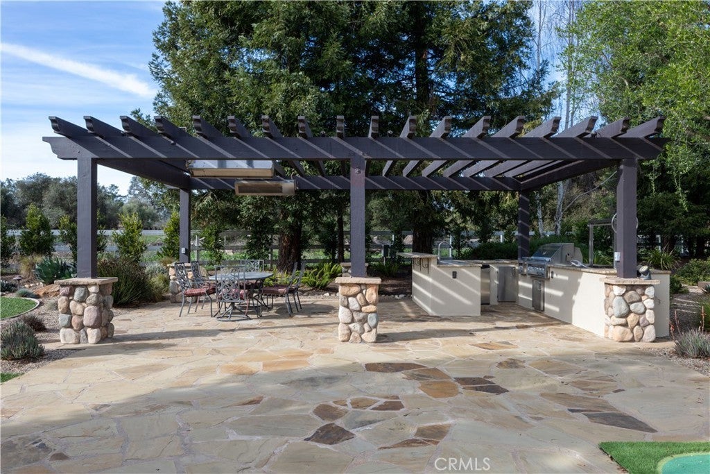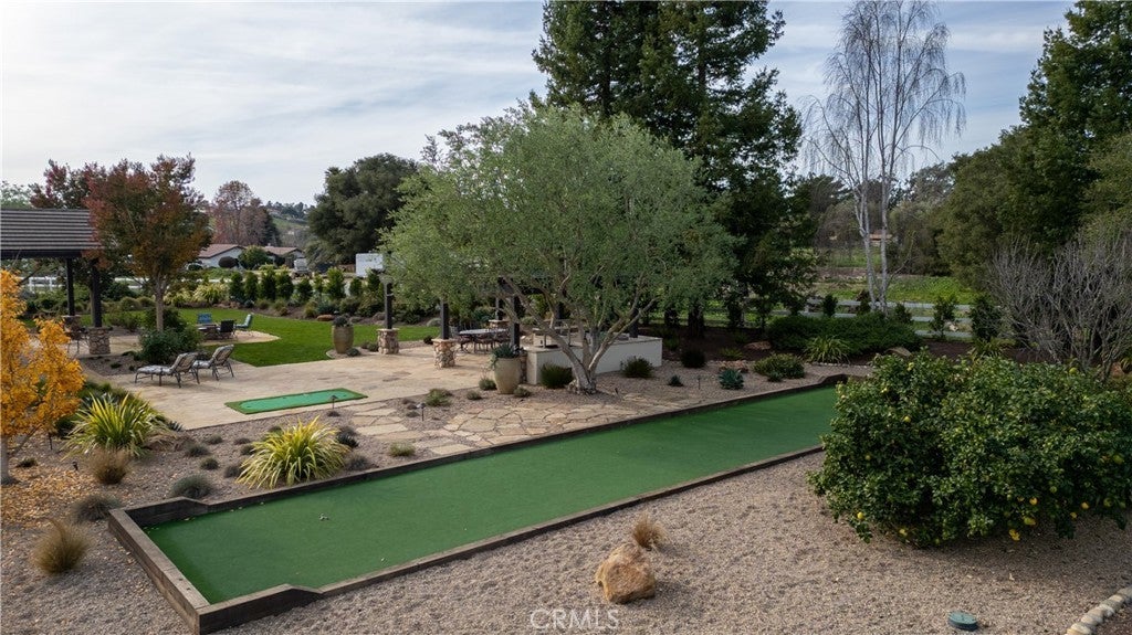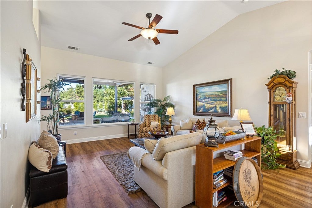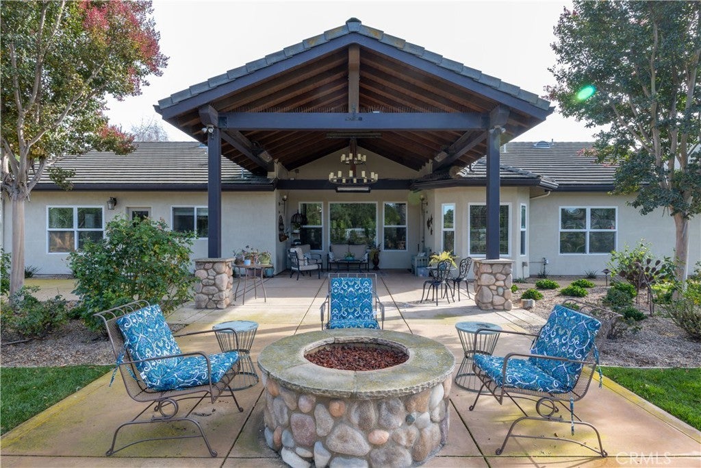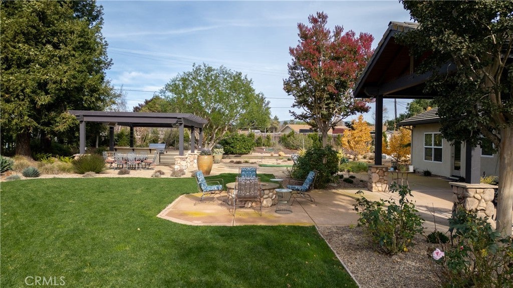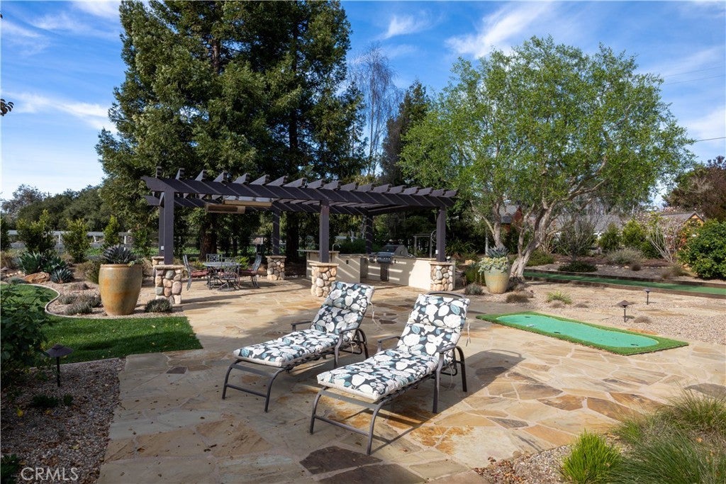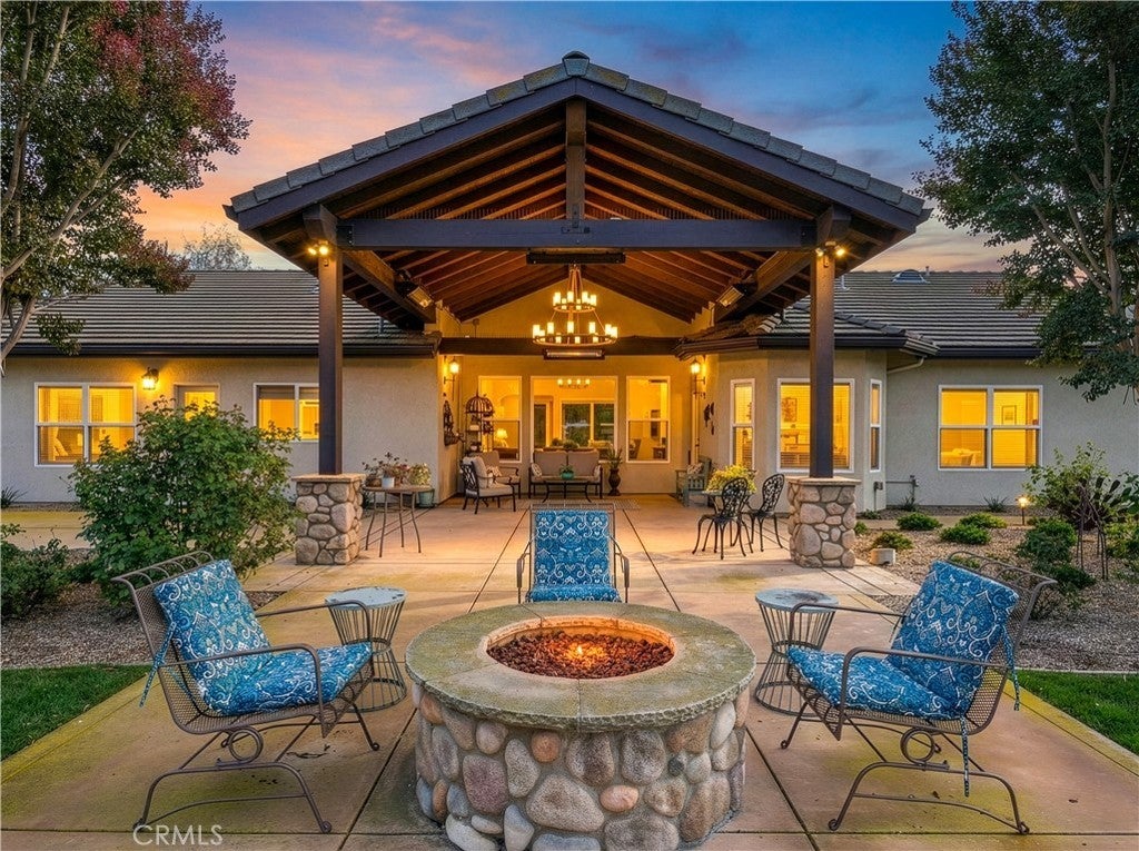 Set on a generous and fully usable 1.01-acre lot, this meticulously maintained 3-bedroom plus den (optional 4th bedroom), 2.5-bath home offers 2,657 square feet of comfortable living paired with exceptional indoor-outdoor amenities. Luxury vinyl plank flooring flows throughout most of the living spaces, beginning in the formal living room where views extend to the covered patio and lush backyard beyond. The dining room flows effortlessly into the well-appointed kitchen with breakfast bar, overlooking the family room and its cozy fireplace. From the breakfast nook, direct access to the covered patio creates a seamless transition for indoor-outdoor living, casual dining, and entertaining. The expansive covered patio is designed for year-round enjoyment, featuring five electric heaters, while the outdoor kitchen is fully equipped with a built-in BBQ, Santa Maria–style grill, refrigerator, two-burner cooktop, and gas heaters to provide warmth while dining al fresco. The home is pre-wired for outdoor surround sound and central vacuum, offering future-ready convenience. Just off the kitchen is the laundry area and a conveniently located powder room. The spacious primary suite serves as a private retreat, featuring a luxurious bath with jetted tub, separate shower enclosure, and direct access to the expansive backyard. Two additional bedrooms share a full hall bath, while the den—ideal as a home office or optional fourth bedroom—also offers access to the back patio. The beautifully landscaped grounds are thoughtfully curated for both relaxation and recreation, featuring winding walkways and paths, raised garden planters, a versatile multi-use court ideal for bocce ball, golf games, and additional leisure activities, and a built-in firepit for evening gatherings. Two storage sheds discreetly support the grounds, while an exceptionally large three-car attached garage—extra deep and extra wide—offers built-in, enclosed storage. An exceptional offering where refined interiors and resort-inspired outdoor amenities come together to create a private retreat perfectly suited for entertaining, unwinding, and elevated everyday living.