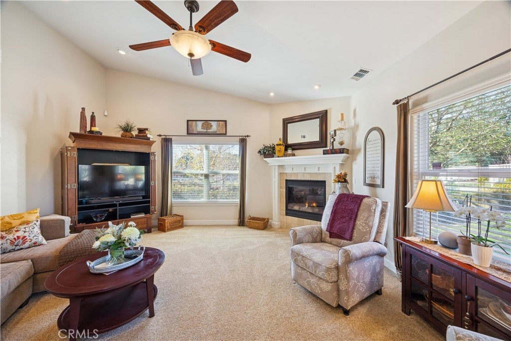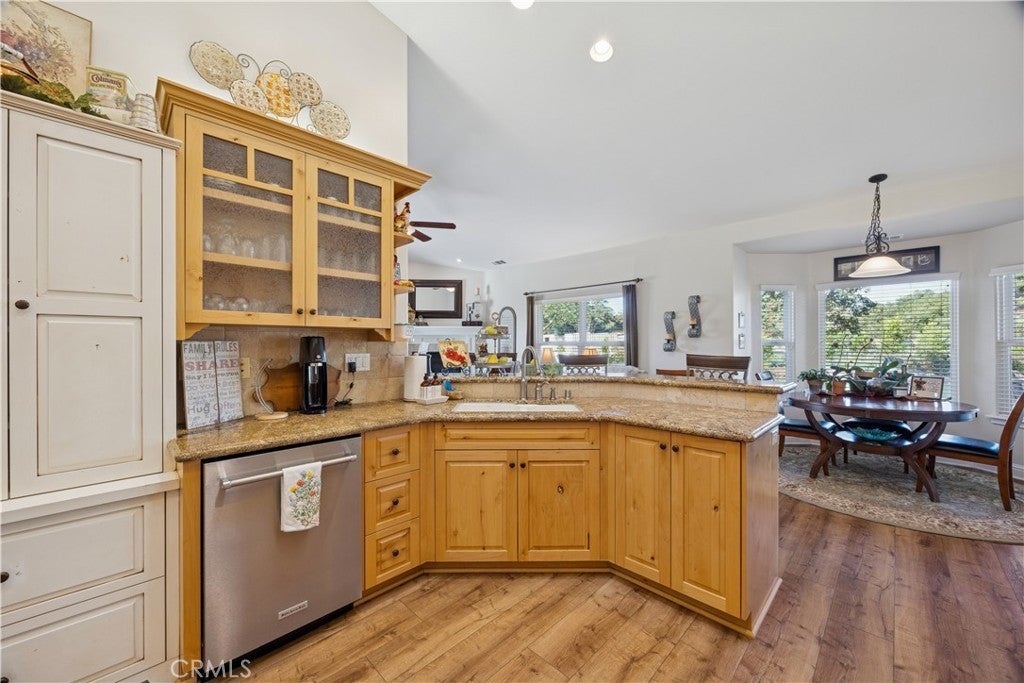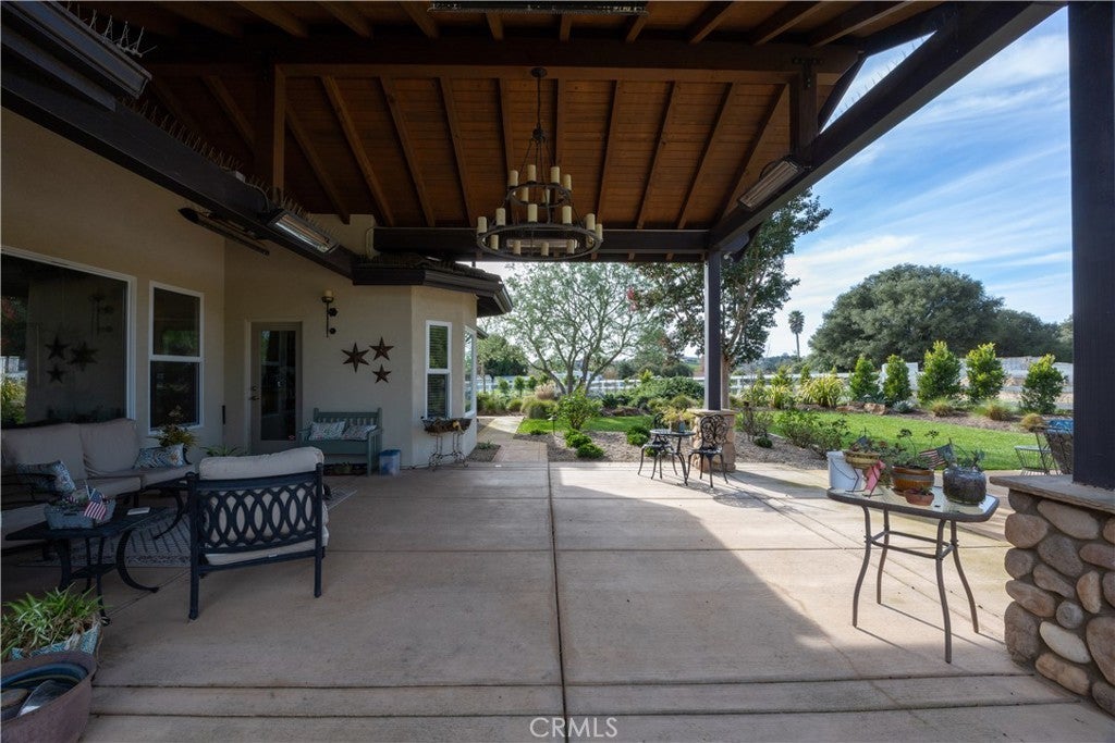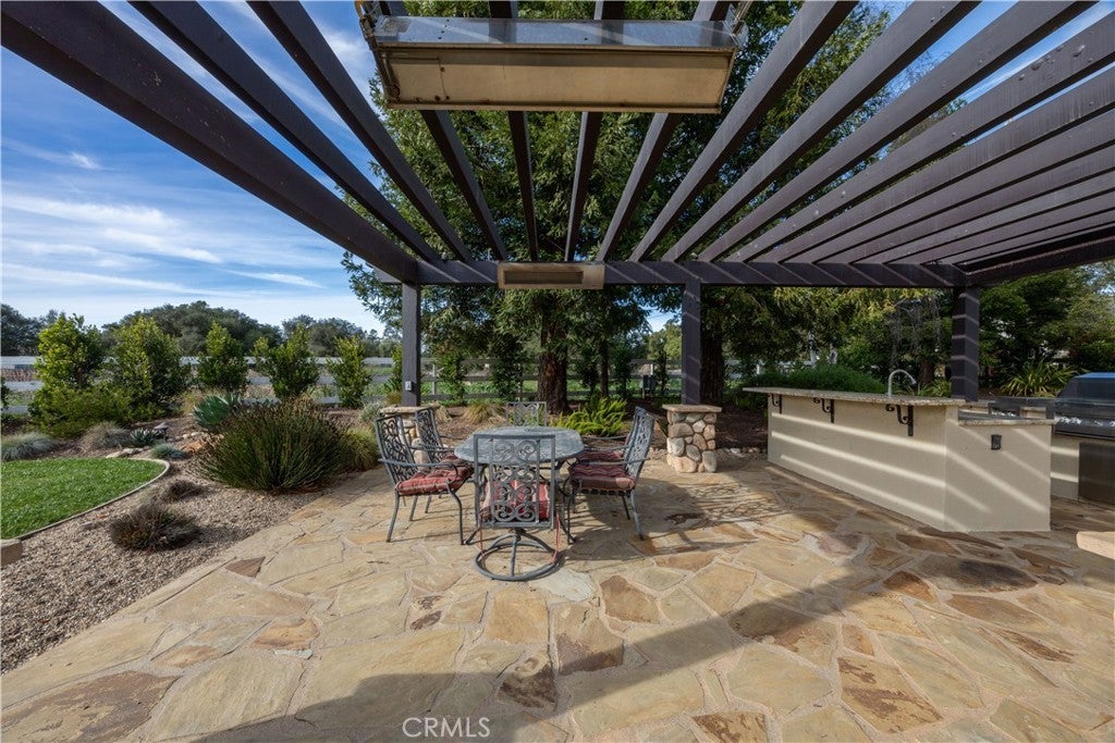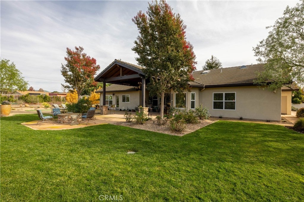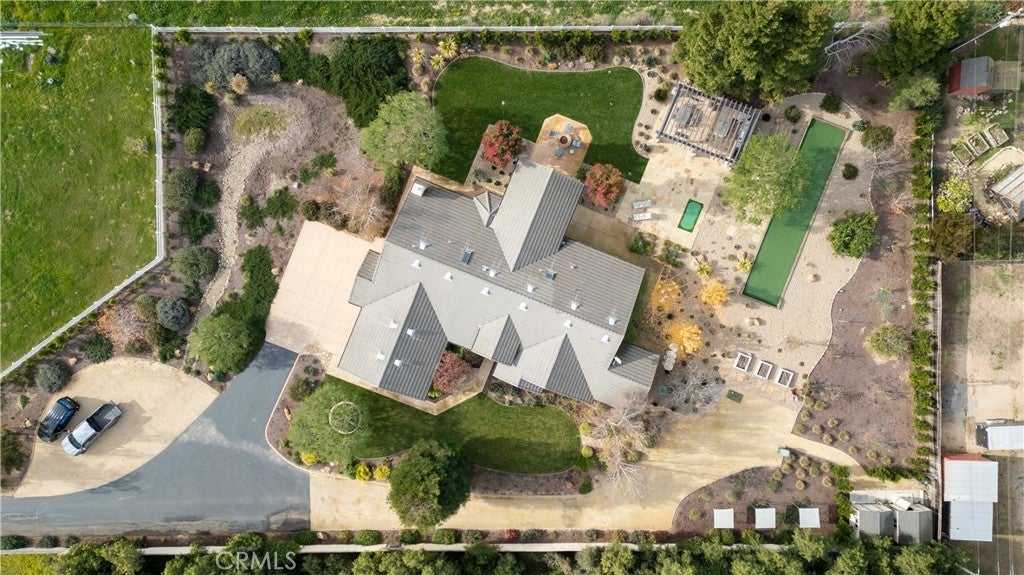 Set on a generous and fully usable 1.01-acre lot, this meticulously maintained 3-bedroom plus den (optional 4th bedroom), 2.5-bath home offers 2,657 square feet of comfortable living paired with exceptional indoor-outdoor amenities. Luxury vinyl plank flooring flows throughout most of the living spaces, beginning in the formal living room where views extend to the covered patio and lush backyard beyond. The dining room flows effortlessly into the well-appointed kitchen with breakfast bar, overlooking the family room and its cozy fireplace. From the breakfast nook, direct access to the covered patio creates a seamless transition for indoor-outdoor living, casual dining, and entertaining. The expansive covered patio is designed for year-round enjoyment, featuring five electric heaters, while the outdoor kitchen is fully equipped with a built-in BBQ, Santa Maria–style grill, refrigerator, two-burner cooktop, and gas heaters to provide warmth while dining al fresco. The home is pre-wired for outdoor surround sound and central vacuum, offering future-ready convenience. Just off the kitchen is the laundry area and a conveniently located powder room. The spacious primary suite serves as a private retreat, featuring a luxurious bath with jetted tub, separate shower enclosure, and direct access to the expansive backyard. Two additional bedrooms share a full hall bath, while the den—ideal as a home office or optional fourth bedroom—also offers access to the back patio. The beautifully landscaped grounds are thoughtfully curated for both relaxation and recreation, featuring winding walkways and paths, raised garden planters, a versatile multi-use court ideal for bocce ball, golf games, and additional leisure activities, and a built-in firepit for evening gatherings. Two storage sheds discreetly support the grounds, while an exceptionally large three-car attached garage—extra deep and extra wide—offers built-in, enclosed storage. An exceptional offering where refined interiors and resort-inspired outdoor amenities come together to create a private retreat perfectly suited for entertaining, unwinding, and elevated everyday living.