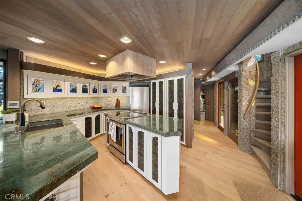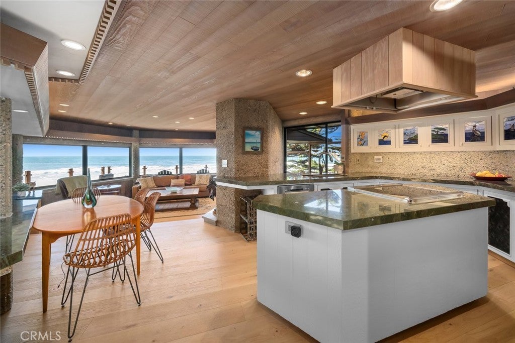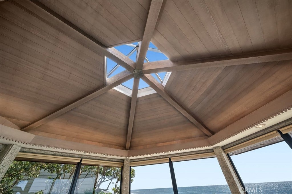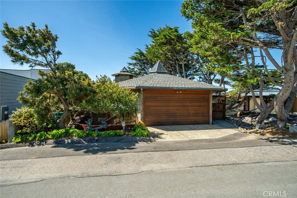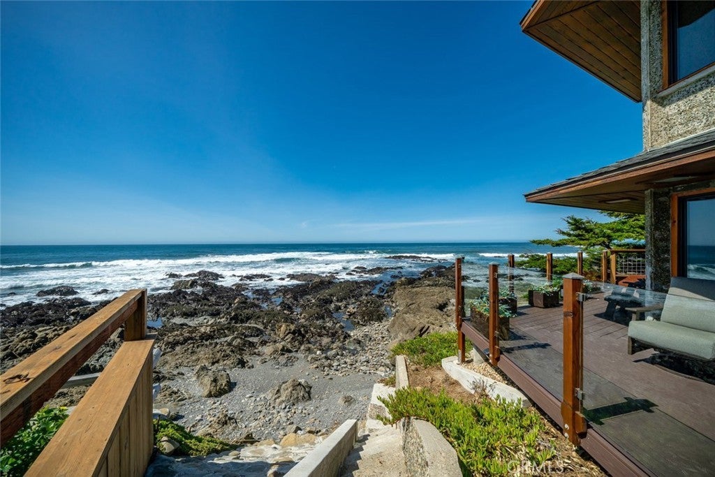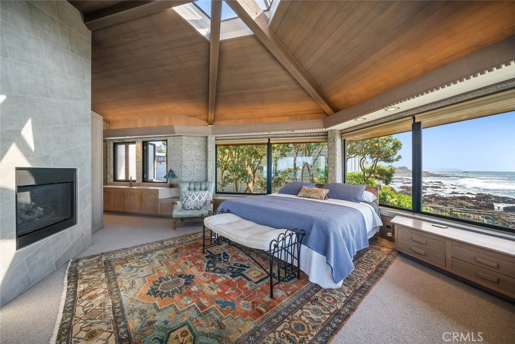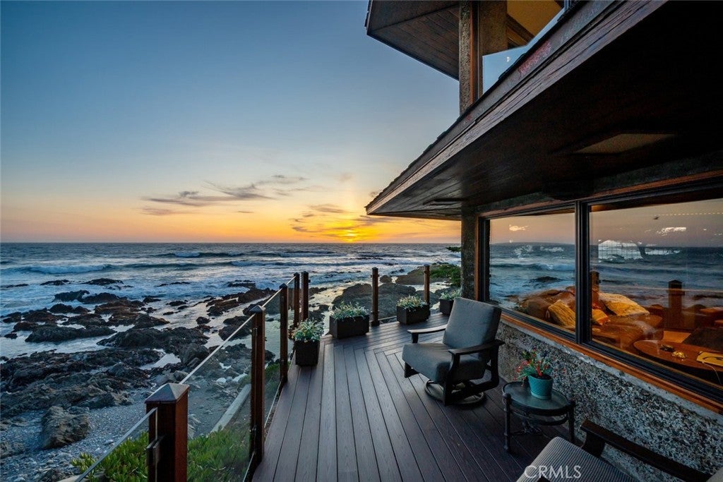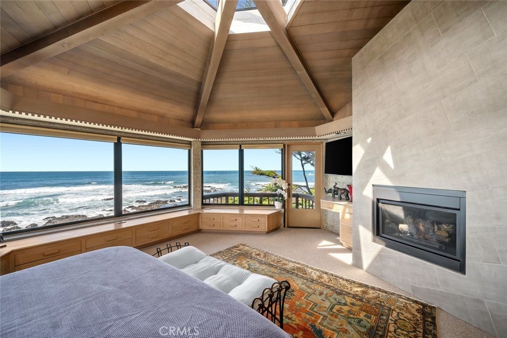 The pinnacle of art, architecture, and coastal living, 2431 Sherwood Drive is a rare oceanfront architectural masterpiece designed by legendary local architect Warren Leopold, a protégé of Frank Lloyd Wright. Built at the height of mid-century modernism, this iconic Big Sur Modern residence is constructed of poured-in-place aggregate concrete and redwood, expressed in a sophisticated series of hexagonal spaces that celebrate light, geometry, and the natural environment. Set forward on a seawall-protected bluff, the home offers over 180 degrees of unobstructed panoramic ocean views, with daily sightings of whales, dolphins, otters, seabirds, tide pools below, and spectacular sunsets. Thick exposed aggregate walls frame expansive new dual-pane windows and signature stained glass—some inlaid with sliced agate—bringing exceptional light, color, and texture throughout. The open-concept kitchen, dining, and living areas are designed for both comfortable living and effortless entertaining. The chef’s kitchen features top-of-the-line appliances, custom cabinetry, and a generous granite island oriented toward the sea. Redwood beams, whitewashed redwood paneling, slate and stone surfaces, built-in seating, fireplaces, skylights, dentil detailing, and an indoor-outdoor bar enhance both function and character. A protected ocean-view courtyard and wraparound decks with new glass railings extend the living space outdoors, while private concrete stairs provide rare direct access to the shoreline and tide pools. The home includes three en-suite bedrooms. The primary suite is accessed by a dramatic primary suite accessed via a stained-glass-lined turret staircase, featuring wraparound windows, domed skylight, fireplace, spa-style bath with ocean-view soaking tub, connected office, and walk-in closet. Downstairs a second en-suite bedroom has own fireplace. A secondary living area with its own living room, laundry, and the third en-suite bedroom with separate entrance adds flexibility and income potential. The property is a successful, permitted vacation rental. Located among Monterey cypress, close to Fiscalini Ranch Preserve, Moonstone Beach, Lampton Cliffs County Park, and the West Village of Cambria, this one-of-a-kind home offers architectural significance, privacy, and an unparalleled connection to the Pacific Ocean.