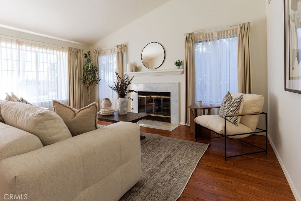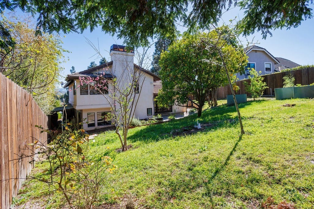 Spacious and lovely split-level home in the Laguna Hills area of SLO. The main entry level features a large foyer that leads to a formal living room on the left, complete with a fireplace and abundant natural light from large windows overlooking the park across the street. An open half staircase on the right leads up to the bedroom areas. Continuing into the home, you’ll find a generous formal dining room and a large, modern kitchen with a breakfast nook featuring built-in seating and French doors that open to the beautiful backyard. The kitchen includes a double oven, six-burner cooktop, new Sub-Zero refrigerator, and abundant counter space and cabinetry. Just a half flight of stairs down is the family room with a second large fireplace, along with an adjacent room ideal for an office or hobby space. This level also includes a half bath, laundry area, and access to the large two-car garage. The upper level features a spacious primary suite. The fourth bedroom is currently used as an office and is adjacent to the suite; minor modifications could easily convert it back into a true bedroom. Two additional bedrooms and a full bathroom complete the upstairs. The large lot features a 30-year-old redwood tree and several fruit trees, including apple, orange, peach, plum, and 2 avocados. Raised garden beds provide space for vegetables or other plantings. Completing the property is an owned solar power system that is just a few years old.