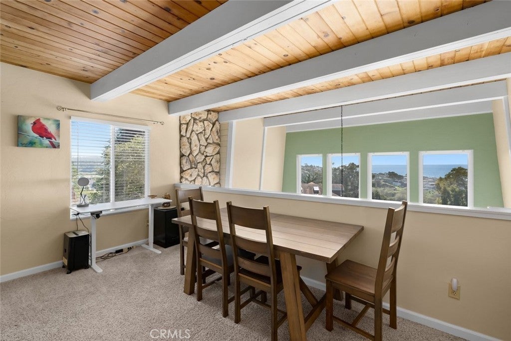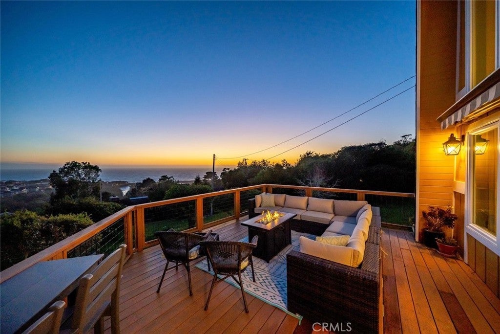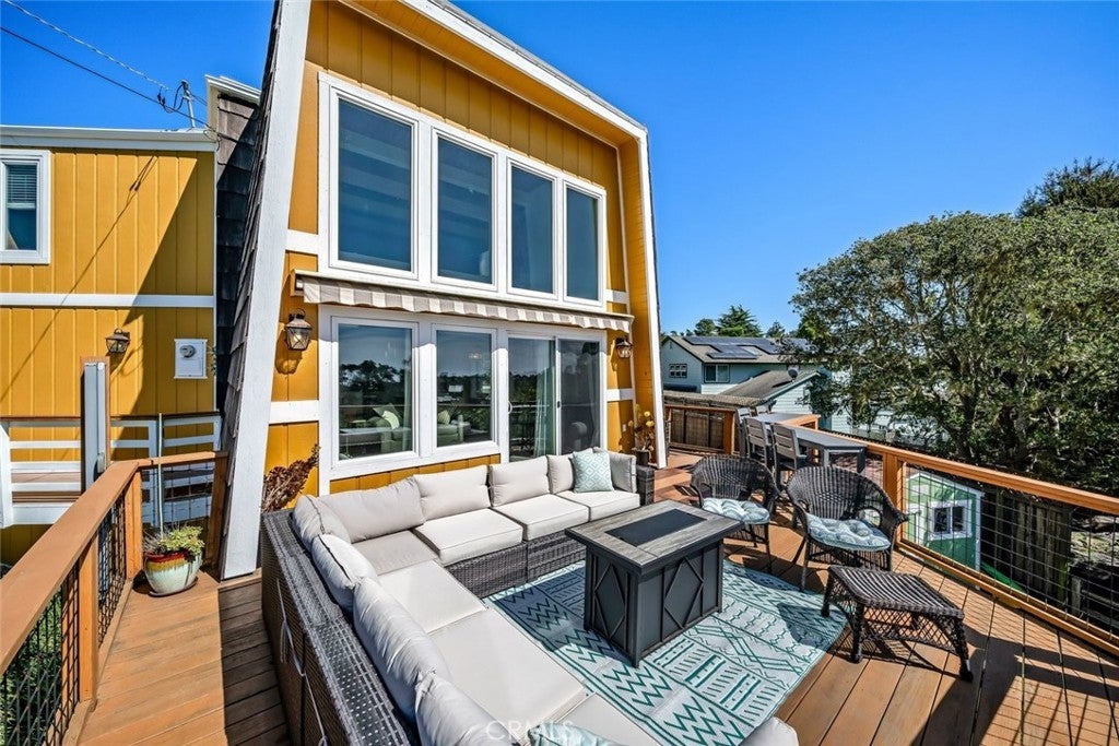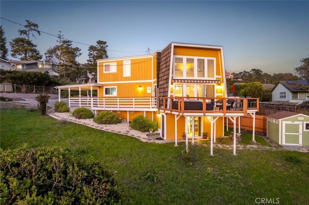 Enjoy some of the most captivating panoramic ocean views in Cambria from this beautifully remodeled 3-bedroom, 2-bath home set on a street-to-street 13,433 sq ft lot on sought-after Happy Hill. Just moments from the West Village and Moonstone Beach, the home offers an effortless beach-home feeling paired with thoughtful modern upgrades. The newly remodeled kitchen features crisp quartz countertops and updated finishes, perfectly complementing the refreshed bathrooms. A bedroom and full bath on the main living level add convenience and flexibility. The dramatic living room—with nearly 18-foot ceilings, a cozy fireplace, and expansive windows—opens to a large view deck that truly extends the living space. It’s an ideal setting for morning coffee, outdoor dining, or simply taking in the whitewater views of Moonstone Beach and the Santa Rosa Creek estuary. A versatile bonus room below provides additional space for guests, hobbies, or work, and a detached storage shed offers extra room for tools, gear, or creative uses. The street-to-street configuration enhances privacy and helps protect the incredible views that make this home so special. A rare blend of coastal charm, modern comfort, and sweeping ocean vistas—this home captures the very essence of Cambria.