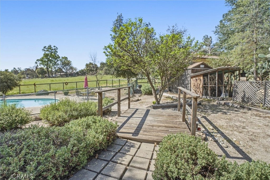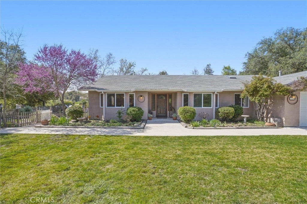 Welcome to this charming single-level home set on a 2.8-acre ranchette in desirable southeast Atascadero adjacent to Santa Margarita. A gated driveway entrance leads to the fully fenced property, offering privacy, security, and excellent potential for horses, livestock, gardening, or simply enjoying wide open space and country living. The flat, highly usable land provides ample room to expand with an ADU, barn, horse stalls, workshop, or other outbuildings to suit your needs. The home features a well-designed floor plan with beautiful views of the ranch from nearly every window. Oak hardwood floors run through the entry, hallway, and kitchen, adding warmth and character. A formal living and dining room sit separate from the kitchen and main living areas, providing flexible spaces for everyday living or entertaining. Vaulted ceilings in the family room and primary bedroom create an airy sense of space and natural light throughout the home. The kitchen offers granite countertops, a center island, and a bay window overlooking the backyard, pool, and pasture, creating a bright and welcoming gathering space. The adjacent family room features a cozy wood-burning stove, sliding glass doors to the backyard, and a unique built-in 90-gallon aquarium with direct water and drain connections. Down the hall is the spacious primary suite with another bay window overlooking the back of the property. The ensuite bath includes a soaking tub, glass-enclosed shower, and a generous walk-in closet. Two additional bedrooms, a shared bathroom, and an office space complete the interior layout. Outside, the property offers a fully fenced pool area, open pasture ready for horses or other livestock, and a charming garden space with multiple large raised planter beds tucked along the side of the home; perfect for growing vegetables, herbs, or flowers. The attached two-car garage includes washer and dryer hookups. Ideally located just 12 minutes from San Luis Obispo, this well-loved property has been comfortably lived in and offers a wonderful opportunity for a new owner to update, repair, and bring their vision to life while enjoying the rare combination of usable acreage, privacy, and single-level living.