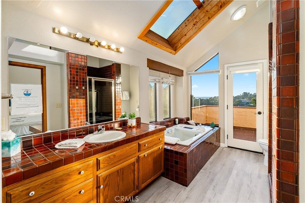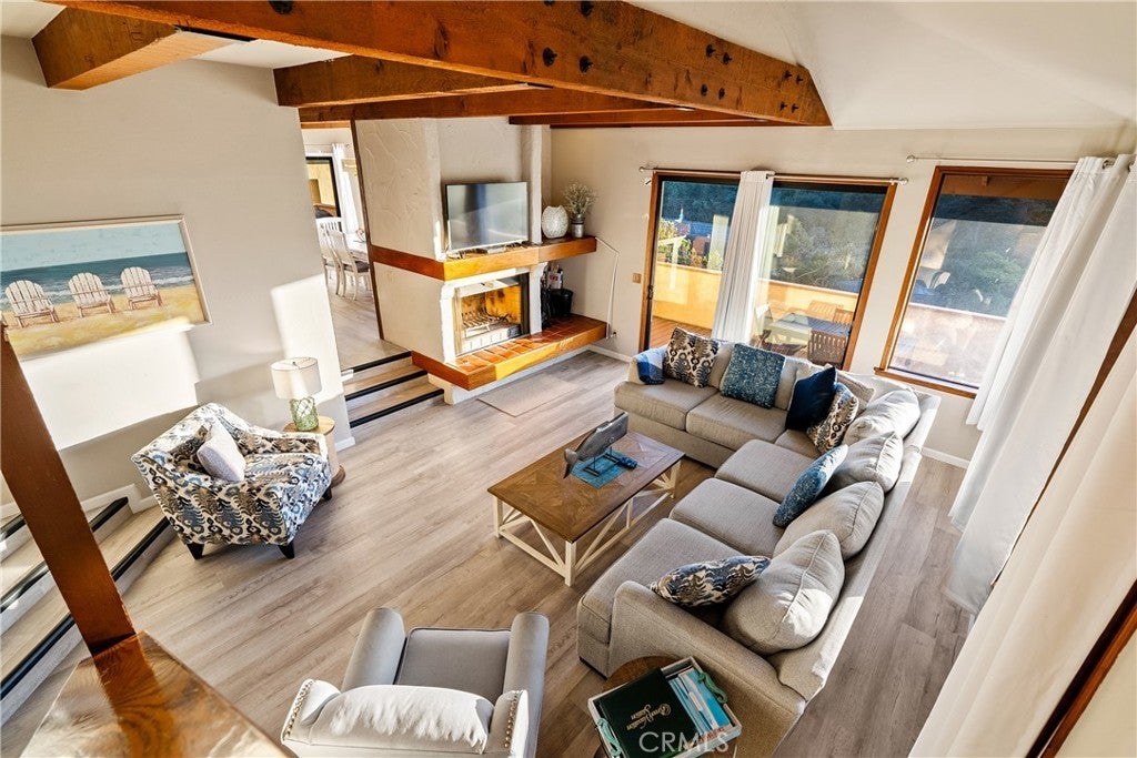 Welcome to this elegant gathering place for family and friends to spread out and fully enjoy the charming coastal village of Cambria. This licensed short-term vacation rential has enough room for all ages to play and relax while being only steps away from restaurants, shopping and wine tasting. Overlooking the rooftops and pine trees to the Pacific Ocean, Santa Rosa Creek and Moonstone Beach and epic sunsets you'll never grow weary of. This 3-bedroom, 3-bathroom home features two fireplaces, three decks, two of which have ocean views, and a shaded patio for play and creativity. From the two-car garage to the functional laundry/mud room, this home is comfortable enough to be a full-time residence with plenty of storage space and room for visitors. The primary bedroom is on the entry level and has its own fireplace, en suite bathroom with an ocean view from your bed, bathtub or your private deck. Downstairs, you enter the living room with another ocean view deck, tall ceilings and a fireplace. The functional kitchen and dining room are just steps up, with stainless steel appliances, colorful tile and a breakfast bar. The 2nd bedroom, hall bathroom, shaded patio and laundry are located on this level as well. The 3rd bedroom and 3rd bathroom are above the garage and have plenty of storage and its own kitchenette. It can also be accessed through the garage or its own entry door for private access. This spectacular property comes completely furnished and it is a LICENSED VACATION RENTAL, which is a rare and hard-to-come-by designation in Cambria.