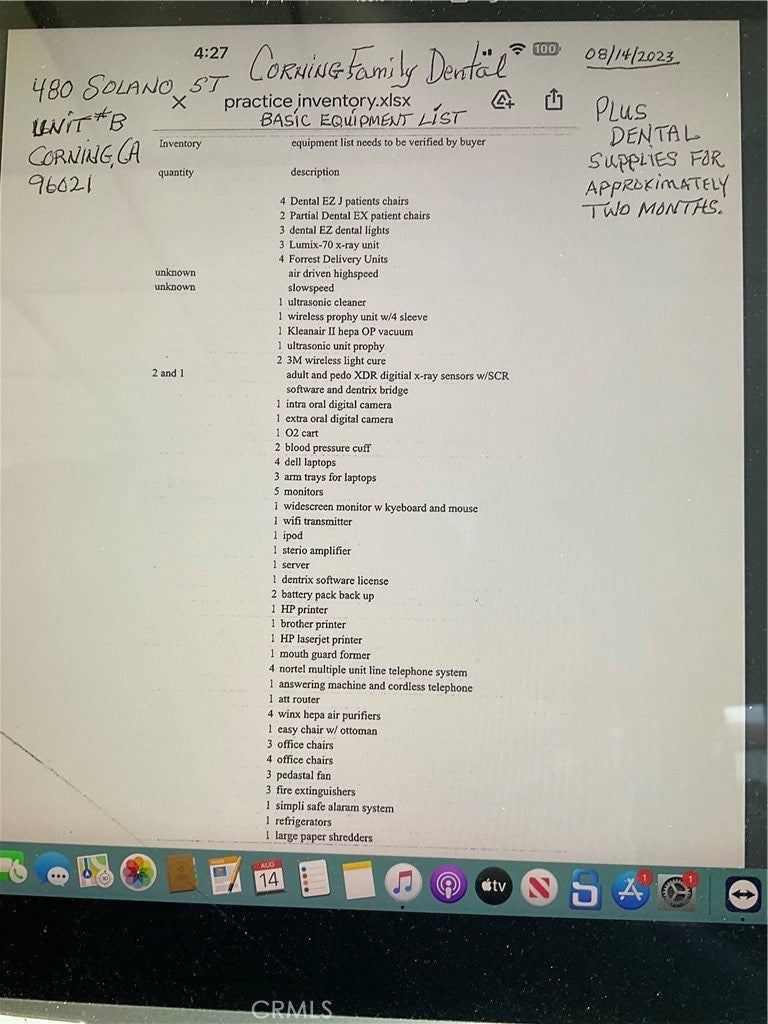 DENTAL OFFICE 480 SOLANO ST UNIT #B CORNING, CA. 96021 APPROXIMATELY 1900 SQ FT. FOUR DENTAL CHAIRS/STATIONS. PATIENT BATHROOM AND SEPARATE PRIVATE BATHROOM AND OFFICE. WAITING ROOM AT THE ENTRANCE AND CLERICAL STATION/OFFICE AREA. LEASOR IS PUTTING TOGETHER AN INCLUDED INVENTORY LIST WHICH IS QUITE EXTENSIVE. LISTING AGENT TO SHOW TO ALL POTENTIAL LEASEE'S . 480 SOLANO ST UNIT #A IS AN ATTORNEY'S OFFICE. LEASE TERMS TBD.