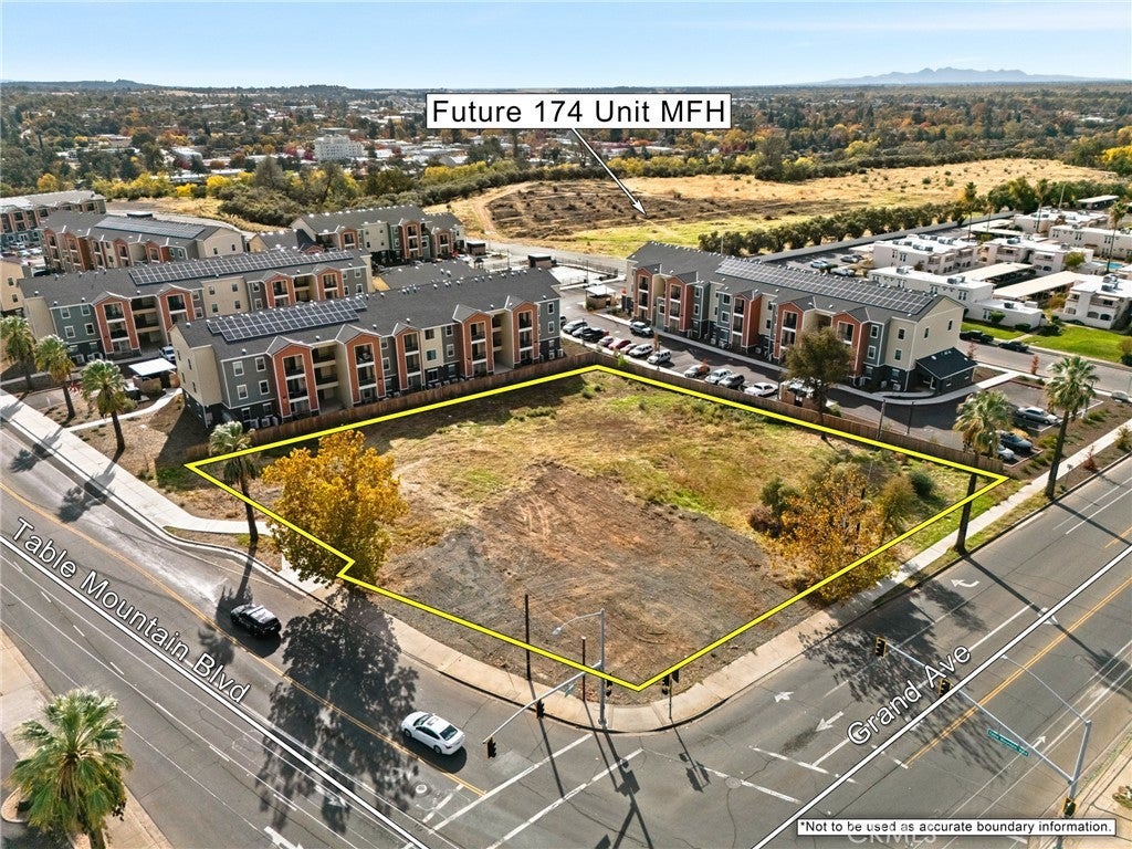 Ground lease or build to suit opportunity on a busy corner parcel. Directly on the corner of Table Mountain & Grand Ave this 0.93 acre parcel offers excellent visibility and potential customer traffic. Located nearby the Butte County Offices, Olive Ranch apartments and The Grove a future 174 unit apartment complex.