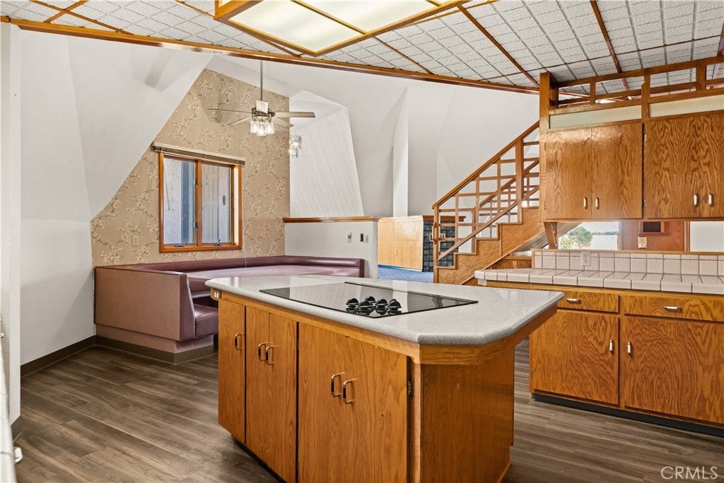 Ceiling Fan(s), Eat-in Kitchen, Tile Counters, Main Level Primary, High Ceilings, Loft, Open Floorplan, Stone Counters