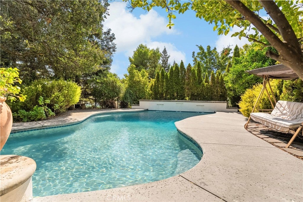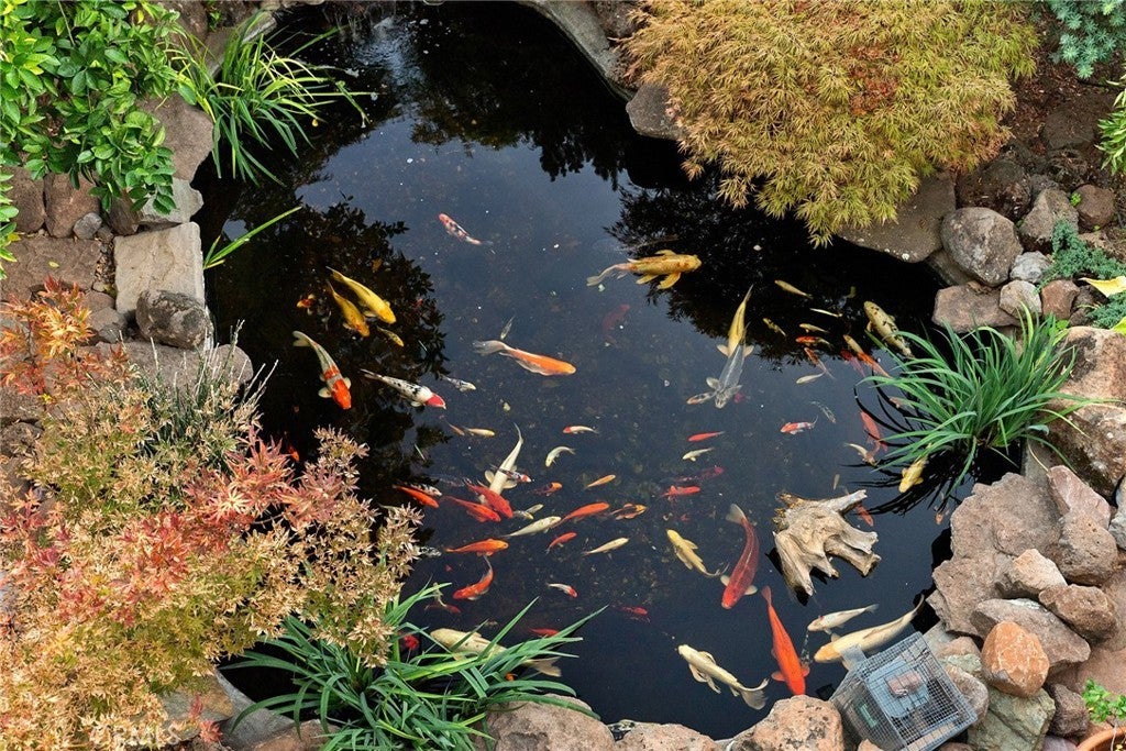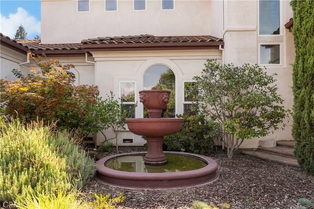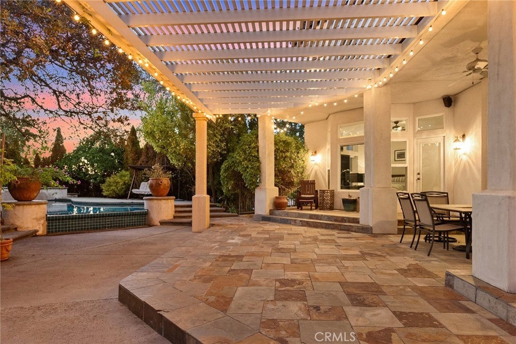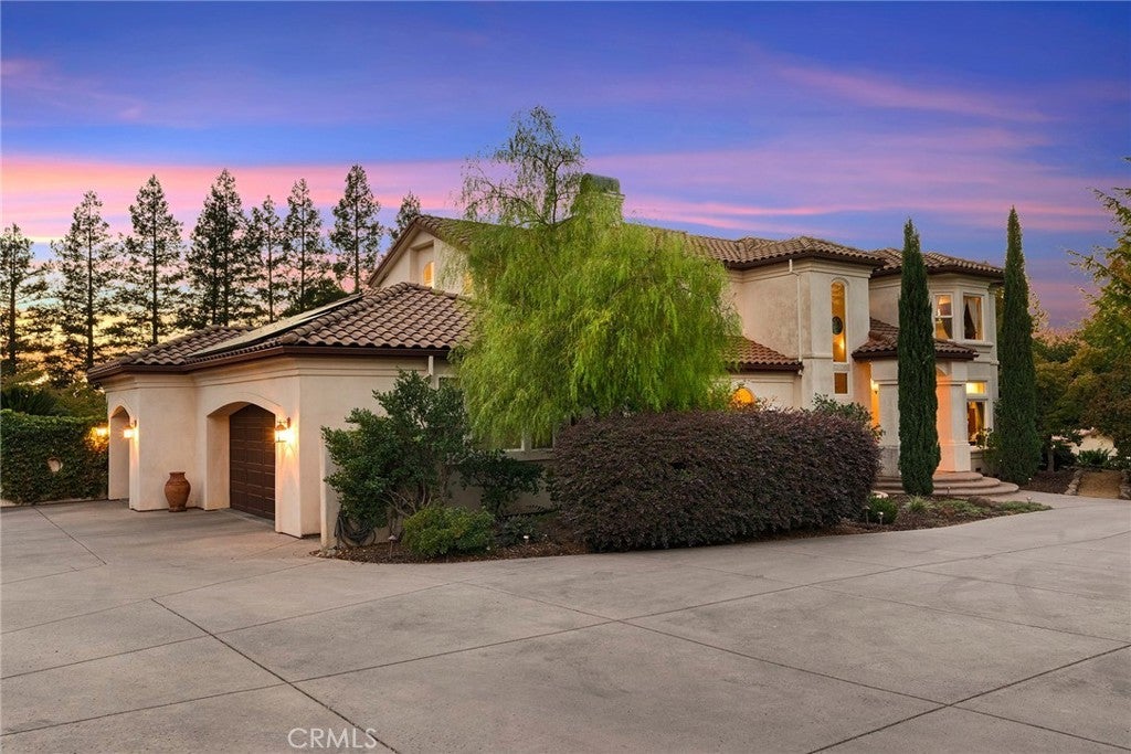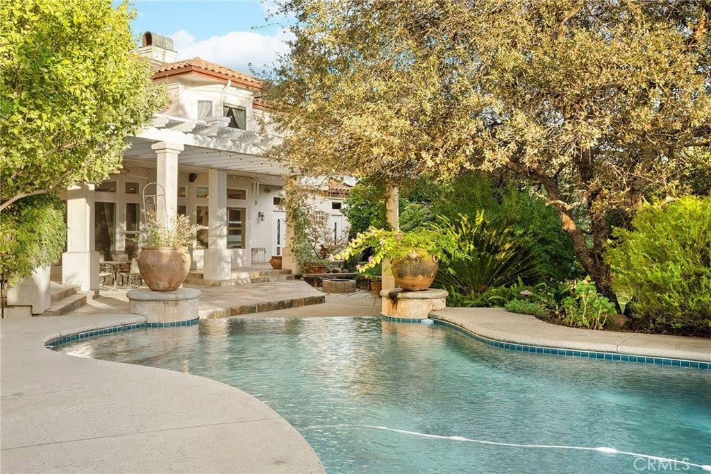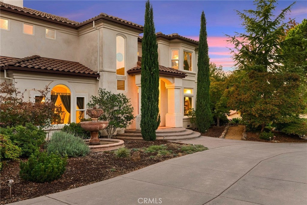 Welcome to a truly remarkable estate within the highly sought-after gated community of Canyon Oaks. Nestled on a private cul-de-sac on a sprawling one-acre lot near the entry gate, this Spanish-inspired residence showcases breathtaking landscaping and elegant design elements throughout. Step through the grand entryway into a home that exudes sophistication, with arched walkways and expansive windows that flood each room with natural light and offer beautiful views of the meticulously crafted grounds. The living room is an entertainer's dream, boasting soaring high ceilings, a cozy fireplace, and seamless flow into a gourmet kitchen. Here, you'll find luxurious granite countertops, double ovens, stainless steel appliances, an island and peninsula, plus a charming dining nook. Additional features on the main level include a climate-controlled wine storage room, two guest bedrooms, two guest bathrooms (one with a relaxing sauna shower), a formal dining room, and a cozy library with its own fireplace. Ascend the stunning wrought iron staircase to a second-floor terrace that overlooks the main living area. The upstairs media room provides a versatile space for entertainment or relaxation. The primary suite is an expansive retreat, featuring a fireplace, skylights, a private reading area, a balcony with scenic views, and a massive walk-in closet. The luxurious ensuite bathroom offers a soaking tub, walk-in shower, double sinks, and a vanity area. Upstairs, you’ll also find two additional guest bedrooms and a full guest bathroom. The backyard is an absolute oasis with a lush lawn, a stunning pool, a serene koi pond with a flowing stream, a hot tub and outdoor shower, and a garden area surrounded by mature fruit trees. This dream yard is perfect for both relaxation and recreation. Other premium amenities include an on-demand water heater, an EV charger, 50 owned solar panels with backup batteries, three HVAC units, a whole-house vacuum system, extensive storage space with both basement and attic areas, and an oversized three-car garage. This home truly has it all – an unparalleled blend of luxury, privacy, and functionality.