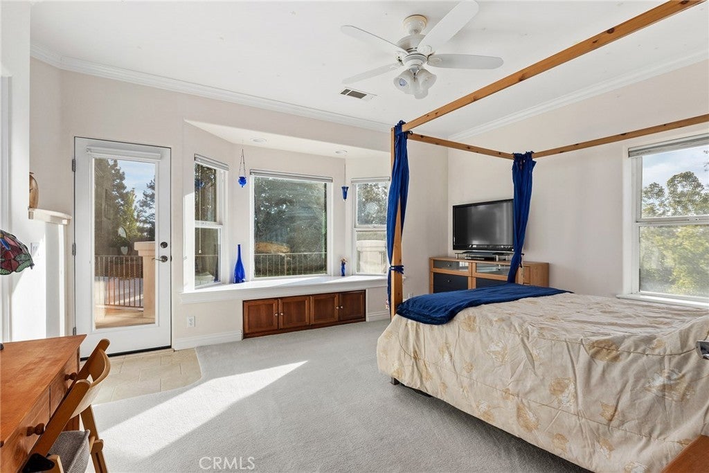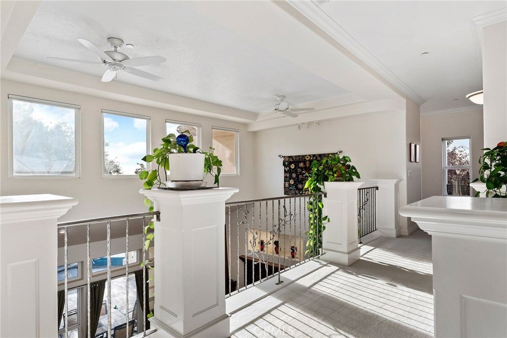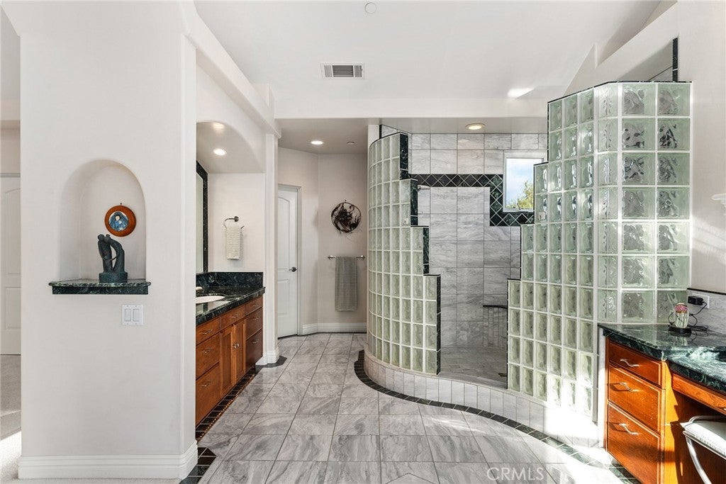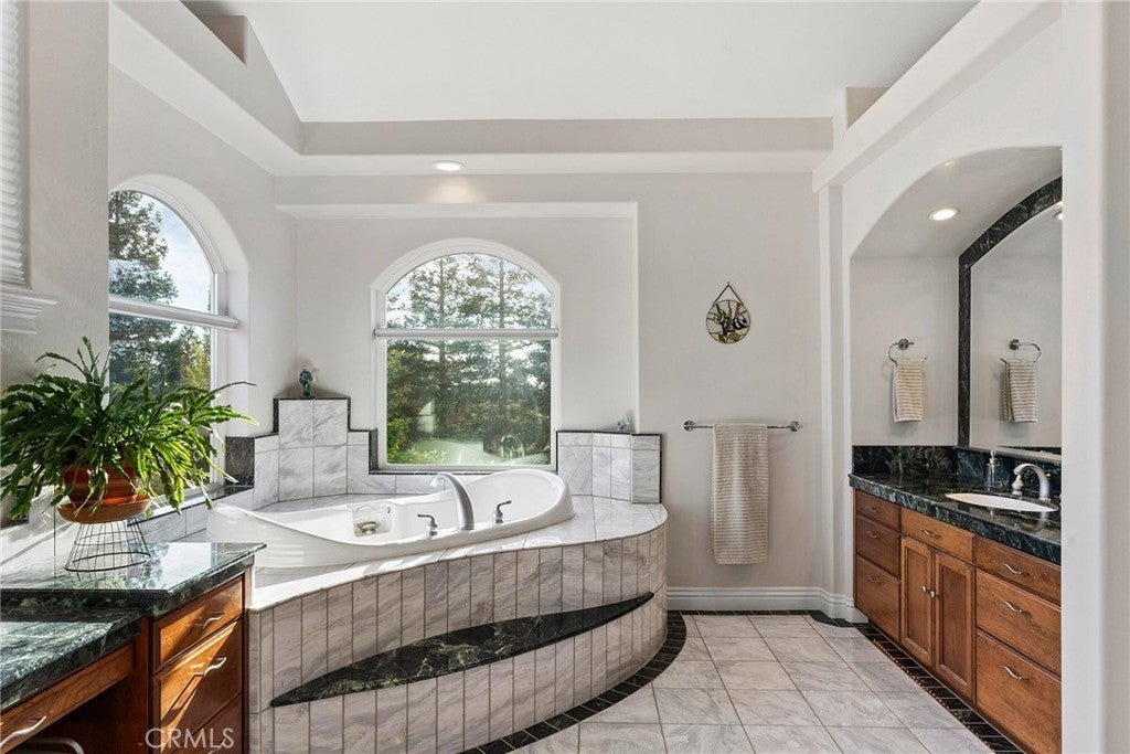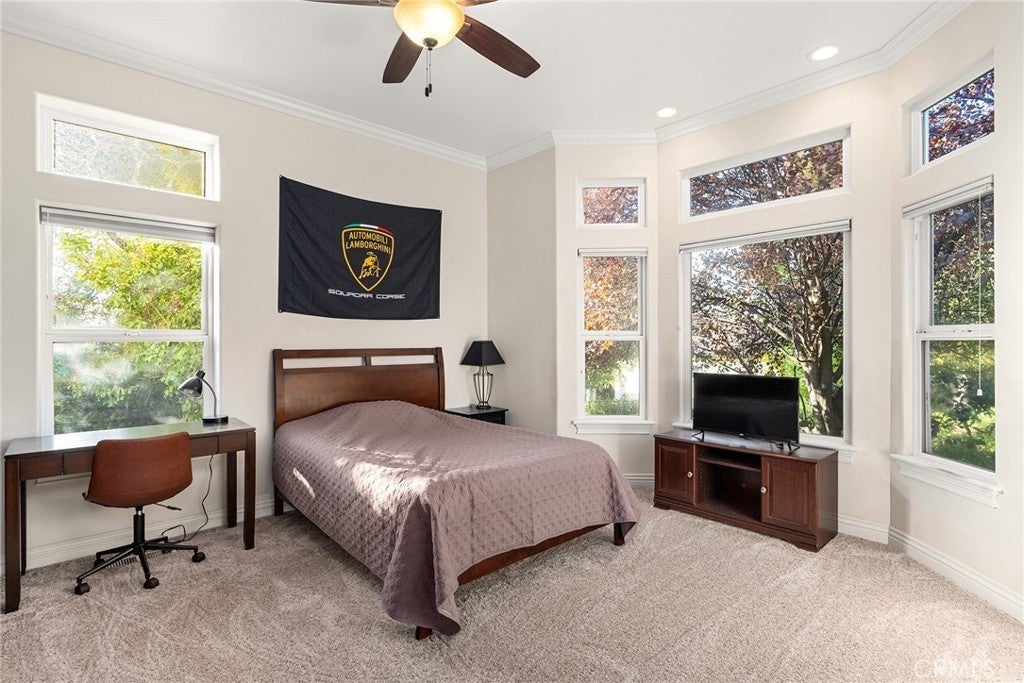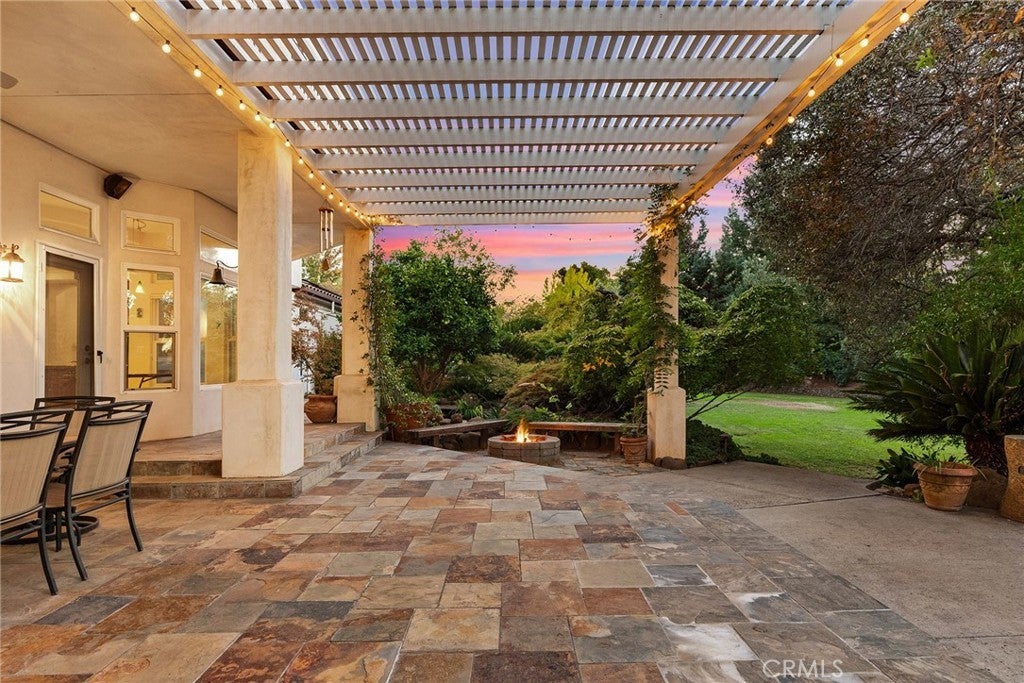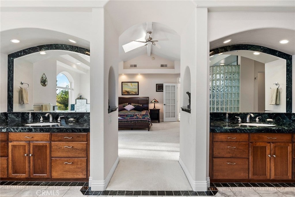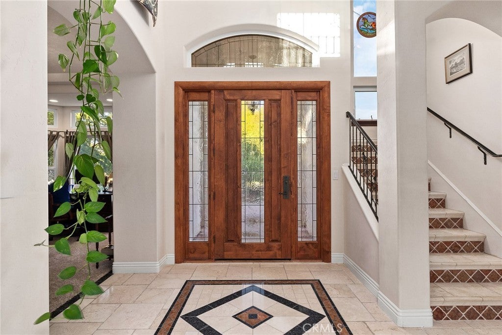 Welcome to a truly remarkable estate within the highly sought-after gated community of Canyon Oaks. Nestled on a private cul-de-sac on a sprawling one-acre lot near the entry gate, this Spanish-inspired residence showcases breathtaking landscaping and elegant design elements throughout. Step through the grand entryway into a home that exudes sophistication, with arched walkways and expansive windows that flood each room with natural light and offer beautiful views of the meticulously crafted grounds. The living room is an entertainer's dream, boasting soaring high ceilings, a cozy fireplace, and seamless flow into a gourmet kitchen. Here, you'll find luxurious granite countertops, double ovens, stainless steel appliances, an island and peninsula, plus a charming dining nook. Additional features on the main level include a climate-controlled wine storage room, two guest bedrooms, two guest bathrooms (one with a relaxing sauna shower), a formal dining room, and a cozy library with its own fireplace. Ascend the stunning wrought iron staircase to a second-floor terrace that overlooks the main living area. The upstairs media room provides a versatile space for entertainment or relaxation. The primary suite is an expansive retreat, featuring a fireplace, skylights, a private reading area, a balcony with scenic views, and a massive walk-in closet. The luxurious ensuite bathroom offers a soaking tub, walk-in shower, double sinks, and a vanity area. Upstairs, you’ll also find two additional guest bedrooms and a full guest bathroom. The backyard is an absolute oasis with a lush lawn, a stunning pool, a serene koi pond with a flowing stream, a hot tub and outdoor shower, and a garden area surrounded by mature fruit trees. This dream yard is perfect for both relaxation and recreation. Other premium amenities include an on-demand water heater, an EV charger, 50 owned solar panels with backup batteries, three HVAC units, a whole-house vacuum system, extensive storage space with both basement and attic areas, and an oversized three-car garage. This home truly has it all – an unparalleled blend of luxury, privacy, and functionality.