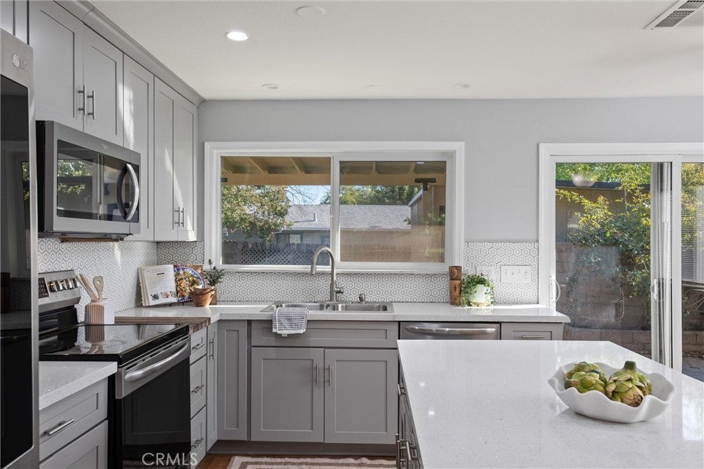 Exceptional Opportunity in Chico – Multi-Generational Living Made Easy! Welcome home to this beautifully updated 4-bedroom, 3-bathroom corner-lot gem nestled in one of Chico’s most convenient neighborhoods, just moments from shopping and the charming Merriam Park. With its thoughtful layout, dual-unit setup and stylish finishes, this property offers the perfect blend of flexibility and comfort. The main residence features three spacious bedrooms and two full baths. A direct doorway from the second bedroom opens into the backyard, offering serene access to the outdoor environment. Discover abundant built-in cabinetry and deep storage closets with shelves throughout — making organization effortless and clutter a thing of the past. Step into the inviting living room where a cozy wood-burning fireplace insert warms the space, and a generous window-seat with built-in storage invites you to relax, lounge or catch up on the day. The kitchen has been exquisitely remodeled, showcasing a large center island, pantry, modern finishes, fresh interior paint and new light fixtures throughout for a crisp, clean and contemporary feel. Transition seamlessly from indoor living to outdoor entertaining on the expansive covered back porch with new stamped concrete and patio cover— the perfect spot to host friends, grill, unwind after work or let creative pursuits come to life. Enjoy peace of mind with a new roof overhead, and revel in bright, modern interiors thanks to all new dual pane windows and a sleek new sliding door. Attached to the main home is a beautifully appointed second unit — one bedroom, one bath — designed for multigenerational living, a home office, guest retreat or rental potential. This unit has its own updated kitchen, bathroom and a mini-split air conditioner, delivering independence, comfort and style. With separate access and parking, it offers thoughtful design and flexible living arrangements for extended household needs. Completing the picture is a detached garage which provides extra storage or a workshop space — a valuable bonus in Chico’s market. With its unbeatable location, this home presents a rare opportunity to own a truly versatile property that’s ready for life as you envision it. Don’t miss out — schedule your showing today and imagine the possibilities!