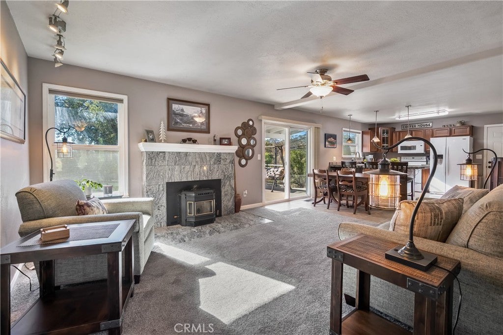 Nestled on nearly an acre, this charming 3-bedroom, 2-bathroom home offers a peaceful country feel paired with a long list of desirable amenities. Step inside and be greeted by open-beam vaulted ceilings, abundant windows that capture scenic outdoor views and flood the home with natural light, and a spacious formal living room that’s perfect for cozy nights in or hosting holiday gatherings. The kitchen is sure to impress any home chef with its beautiful wood cabinetry, granite tile countertops, newer electric cooktop and microwave, and a quaint breakfast bar ideal for quick bites. With the dining area and family room seamlessly connected, entertaining becomes a breeze and the chef never misses out on the fun. When it’s time to unwind, the primary suite offers the tranquility you need featuring generous space, a nicely sized closet, and a primary bathroom. Additional highlights include ceiling fans throughout, a pellet stove for added warmth, two comfortable guest bedrooms, and an attached 1-car garage. Enjoy year-round outdoor living from the covered back deck overlooking the expansive backyard, perfect for viewing the changing seasons. With its spacious lot and thoughtfully designed features, this home has everything you need to live comfortably. Don’t miss the chance to make it yours!