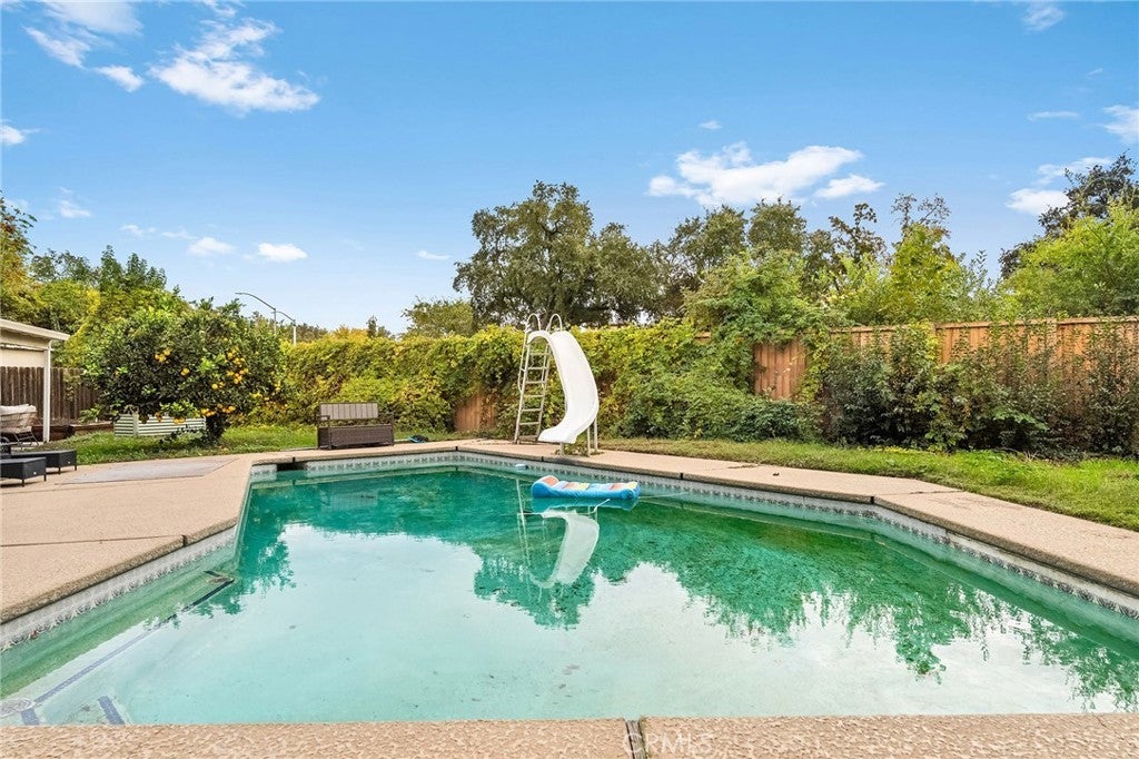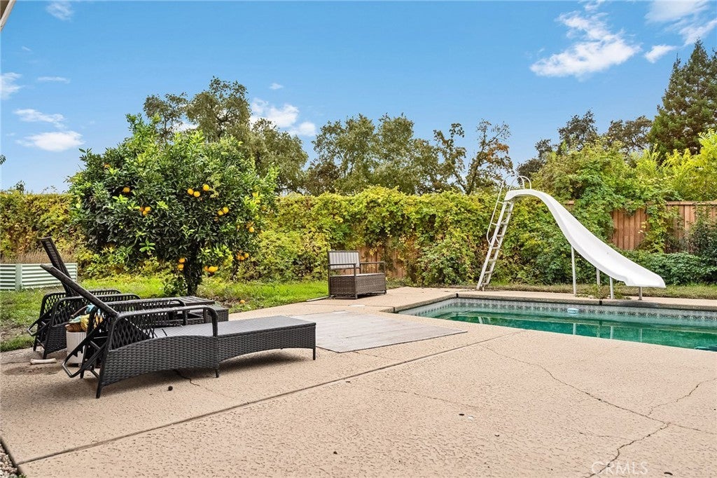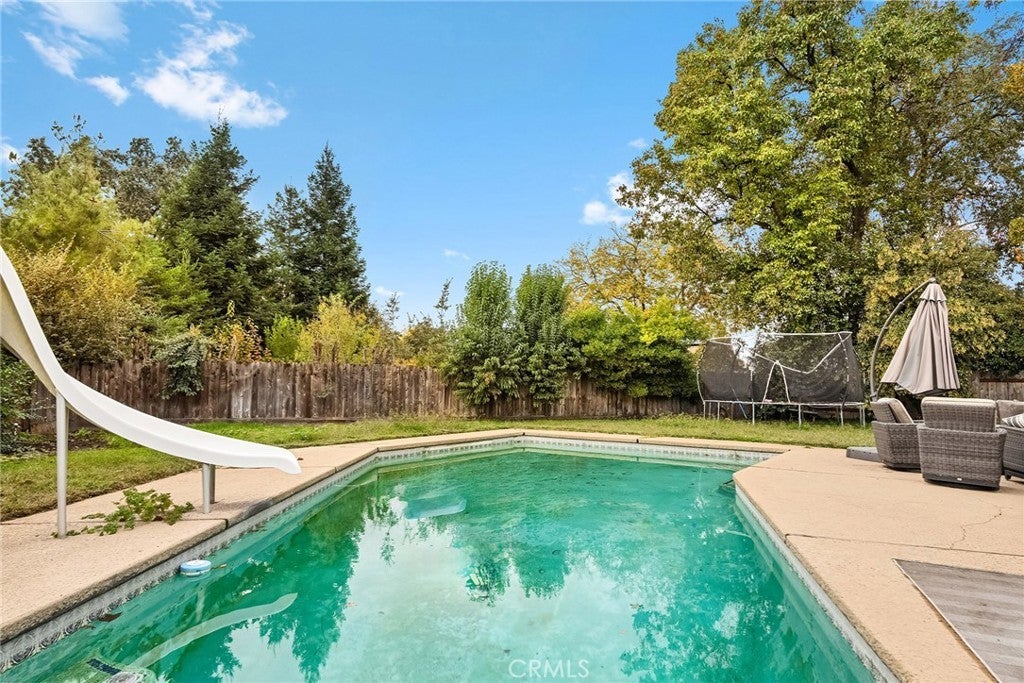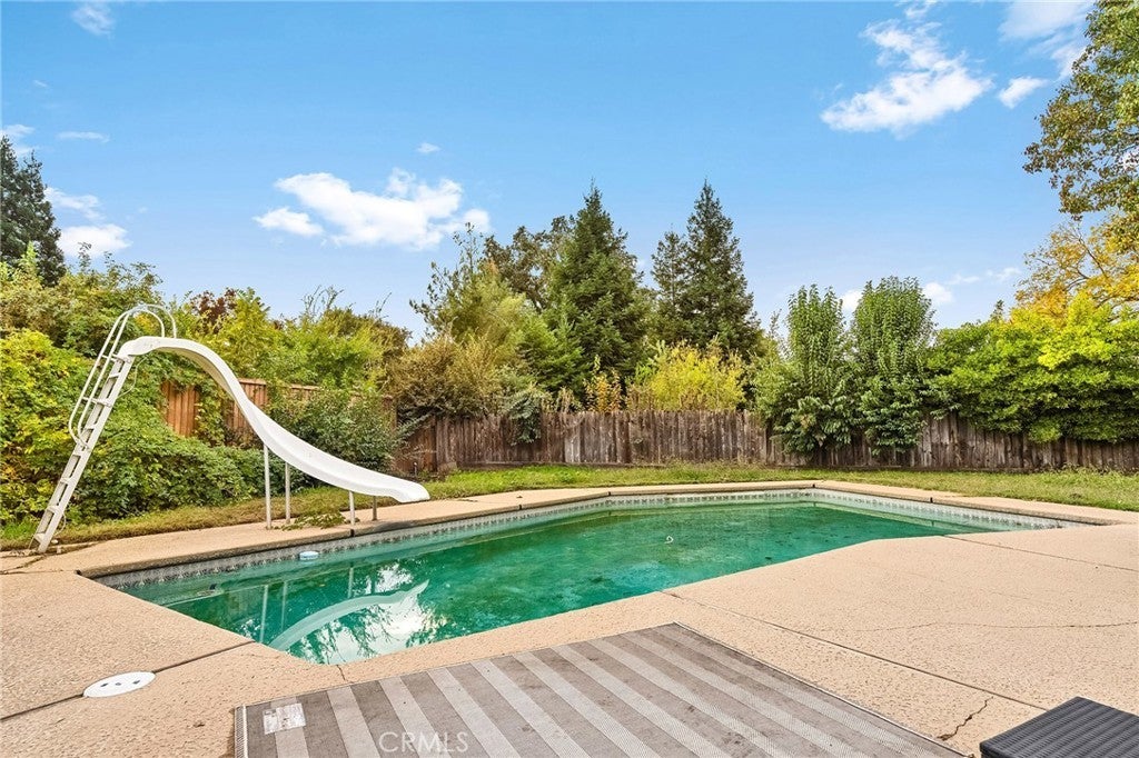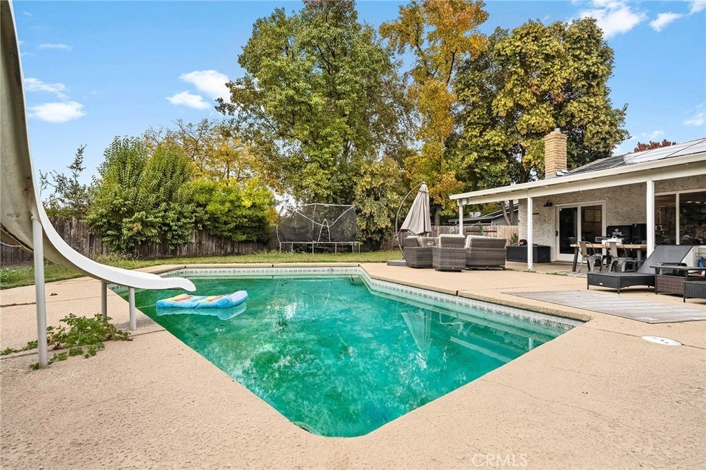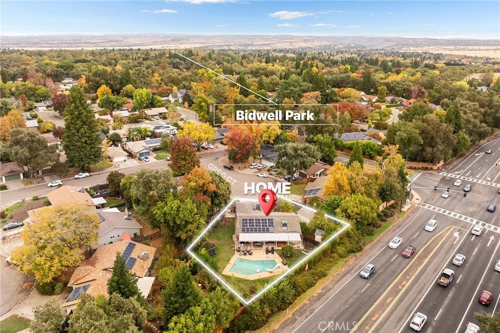 Nestled on a cul-de-sac just blocks from Lower Bidwell Park, this beautifully updated 4-bedroom, 3-bath home with an office offers the perfect blend of comfort, functionality, and charm. Over the past few years, nearly every surface has been refreshed — from new drywall, texture, and paint throughout to all-new lighting, fixtures, and appliances. Step inside to an inviting, well-designed floor plan with the bedrooms privately situated on one side and the main living spaces on the other. The spacious living room features warm laminate flooring, a classic brick fireplace, and abundant natural light with easy access to the backyard. The kitchen offers generous counter space, new appliances, and a large granite single-basin sink. The bathrooms have been stylishly updated with new tile and double sinks in both the hall and main bathroom, while three of the four bedrooms feature new plush carpet. Behind the scenes, the home has received major system upgrades including a new HVAC system, tankless water heater, added insulation, and solar panels with a new inverter for energy efficiency. The backyard is an outdoor retreat — complete with a large covered patio, mature fruit trees, a spacious lawn, and an in-ground pool with a slide for summer fun. A detached secondary garage with a roll-up door makes an ideal workshop, complemented by an additional storage shed. Located just minutes from Chico’s parks, trails, schools freeway access, and downtown, this move-in ready home truly checks all the boxes!