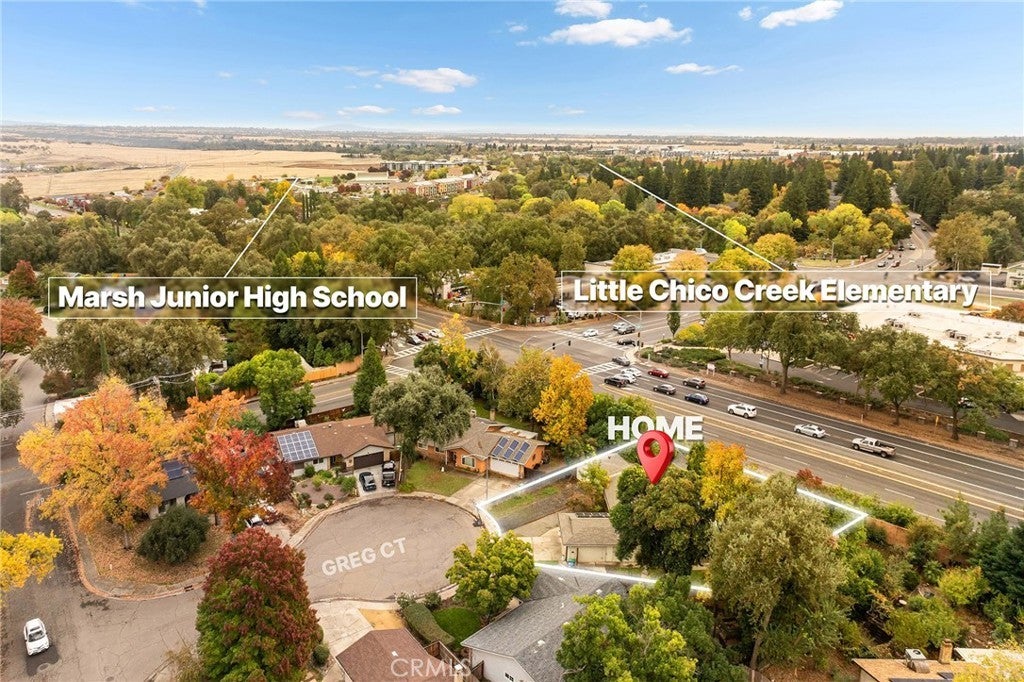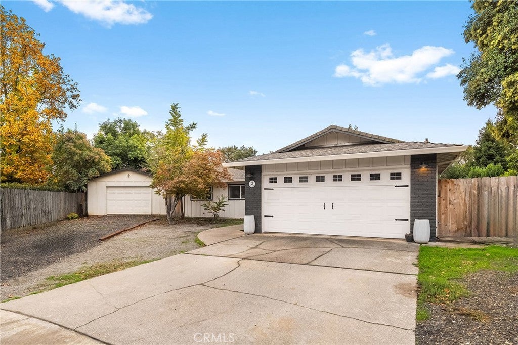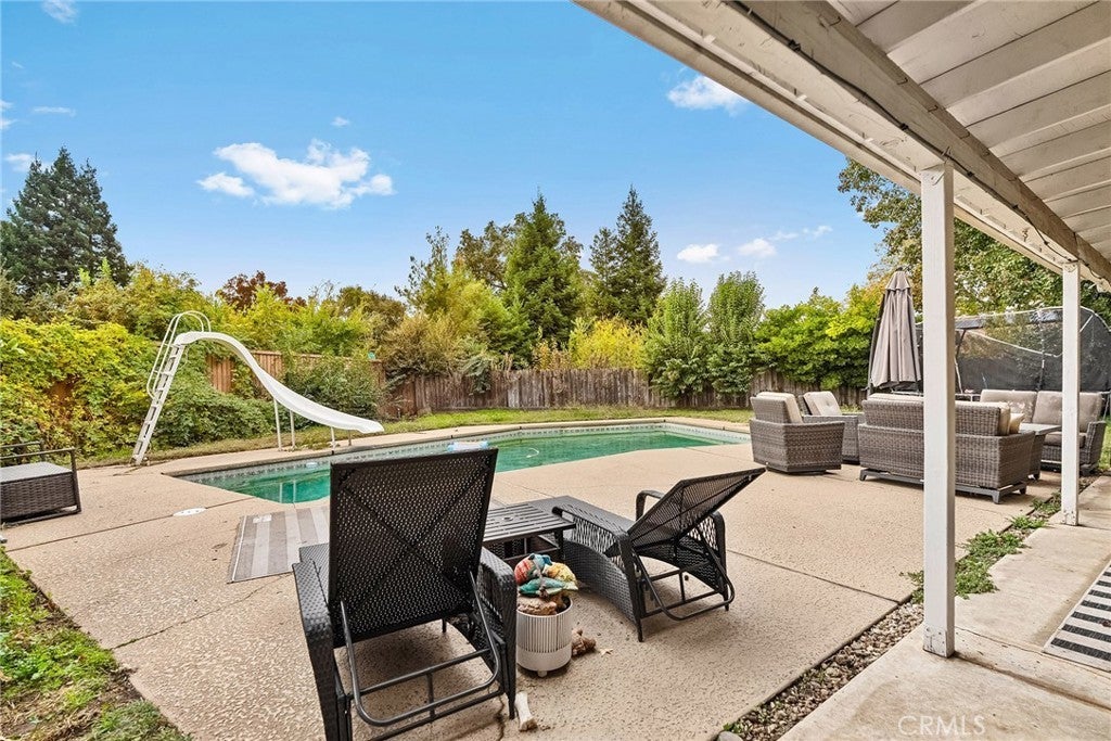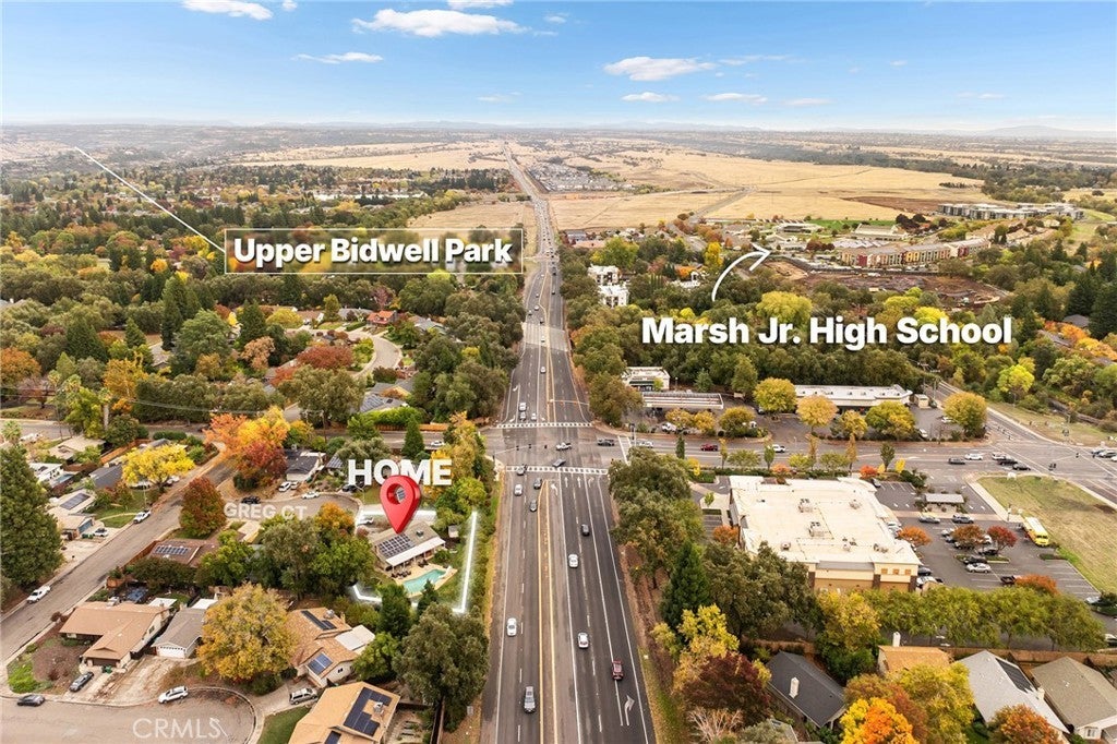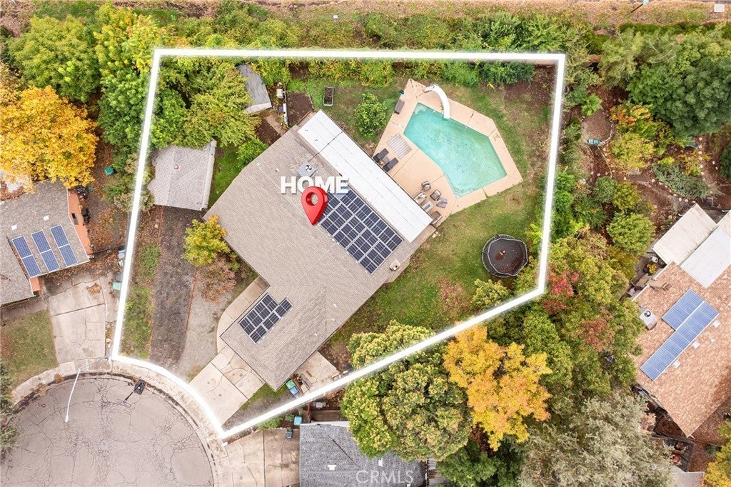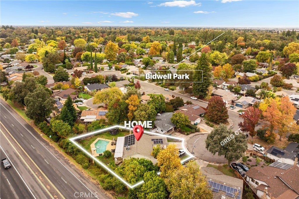 Nestled on a cul-de-sac just blocks from Lower Bidwell Park, this beautifully updated 4-bedroom, 3-bath home with an office offers the perfect blend of comfort, functionality, and charm. Over the past few years, nearly every surface has been refreshed — from new drywall, texture, and paint throughout to all-new lighting, fixtures, and appliances. Step inside to an inviting, well-designed floor plan with the bedrooms privately situated on one side and the main living spaces on the other. The spacious living room features warm laminate flooring, a classic brick fireplace, and abundant natural light with easy access to the backyard. The kitchen offers generous counter space, new appliances, and a large granite single-basin sink. The bathrooms have been stylishly updated with new tile and double sinks in both the hall and main bathroom, while three of the four bedrooms feature new plush carpet. Behind the scenes, the home has received major system upgrades including a new HVAC system, tankless water heater, added insulation, and solar panels with a new inverter for energy efficiency. The backyard is an outdoor retreat — complete with a large covered patio, mature fruit trees, a spacious lawn, and an in-ground pool with a slide for summer fun. A detached secondary garage with a roll-up door makes an ideal workshop, complemented by an additional storage shed. Located just minutes from Chico’s parks, trails, schools freeway access, and downtown, this move-in ready home truly checks all the boxes!