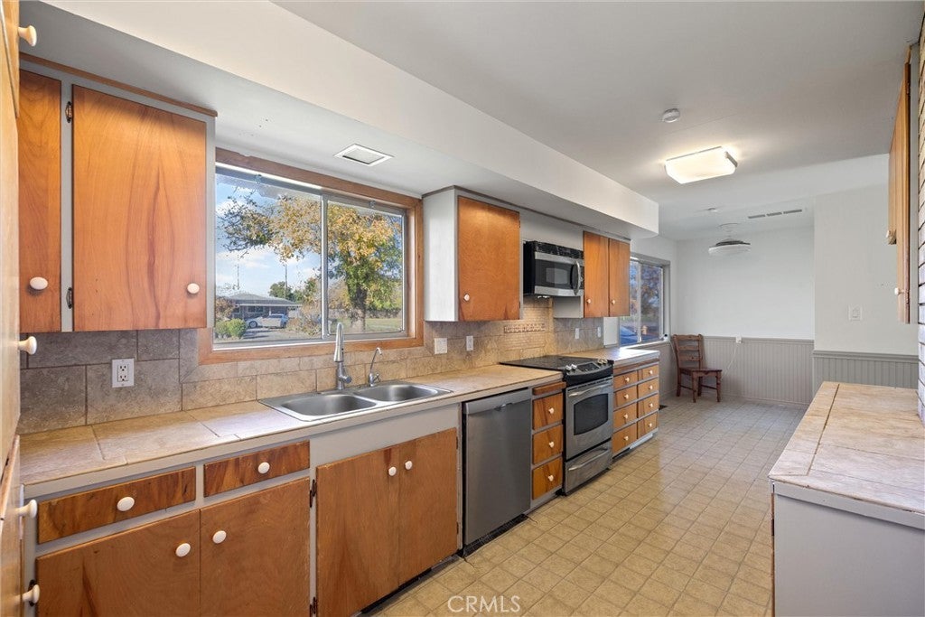 Discover one of Corning’s standout corner-lot properties—an expansive and beautifully updated home offering exceptional space, comfort, and versatility both inside and out. Set on a 9,583 sq ft premium corner lot, this thoughtfully improved 3-bedroom, 2-bath residence provides the kind of room, parking, and livability that’s increasingly hard to find. Inside, you’re welcomed by a bright, oversized living room with a classic fireplace, creating a warm and inviting centerpiece for daily living. The home features a large, upgraded galley kitchen with tile countertops, abundant cabinetry, and a full appliance package including range, dishwasher, and microwave. An adjoining dining area easily accommodates a large table—perfect for gatherings and hosting. All three bedrooms are generously sized, including the spacious main bedroom, and both bathrooms have been tastefully updated. A separate laundry room, two-car garage, and additional storage shed add to the home’s everyday convenience. The grounds offer an impressive blend of function and possibility, with extensive side parking, alley access, and a big backyard ideal for outdoor living, gardening, or future improvements. Leased solar provides energy savings year-round. Built in 1960 and enhanced with meaningful updates over time, this 1,640 sq ft Corning gem blends comfort, character, and modern practicality on a highly desirable corner lot. A rare opportunity to enjoy space, upgrades, and flexibility—all within a charming Corning neighborhood.